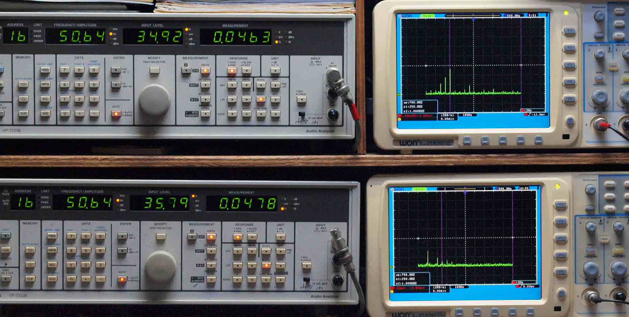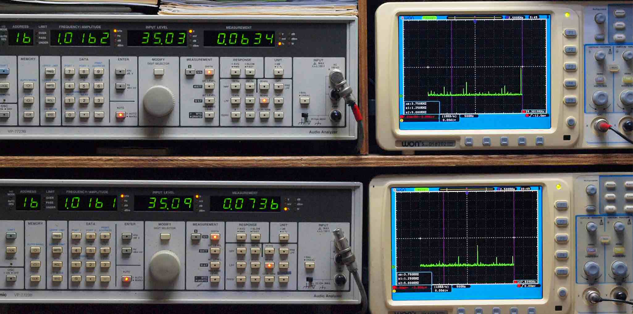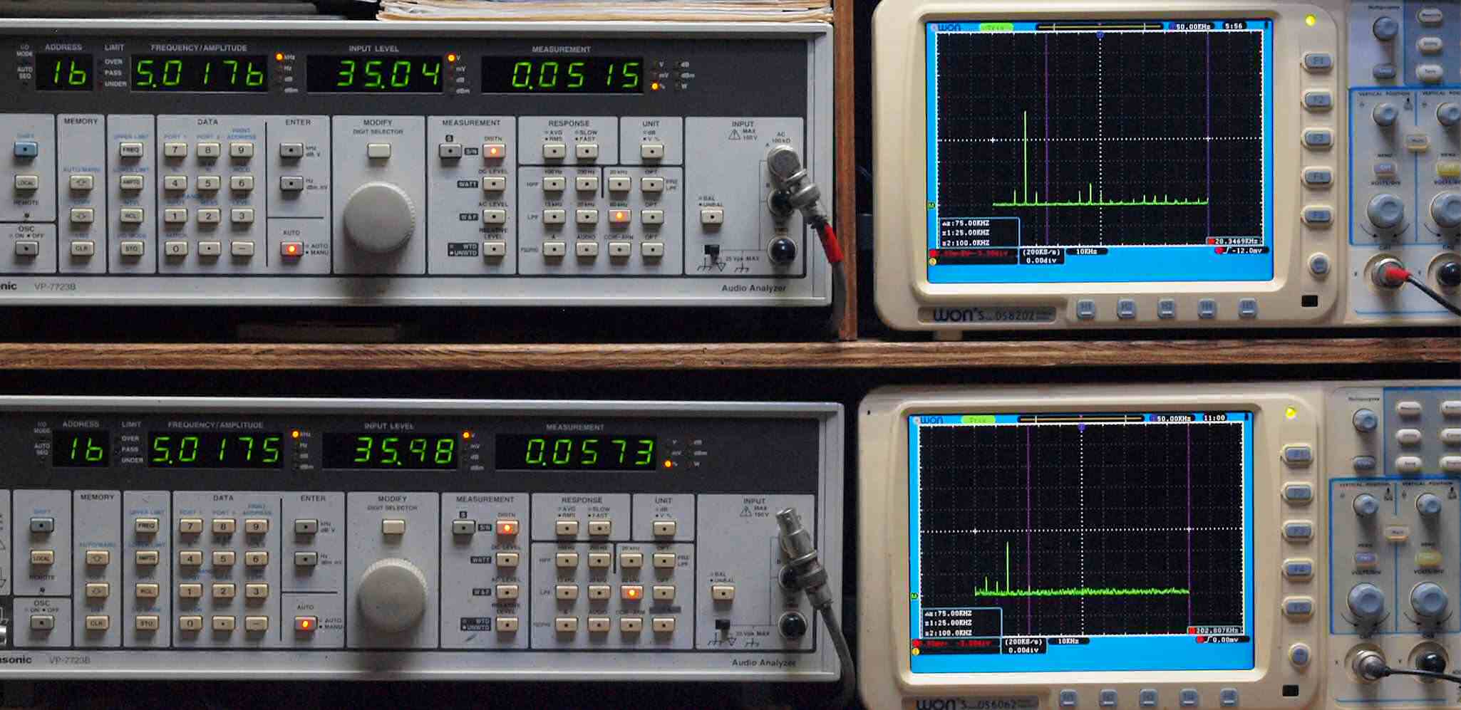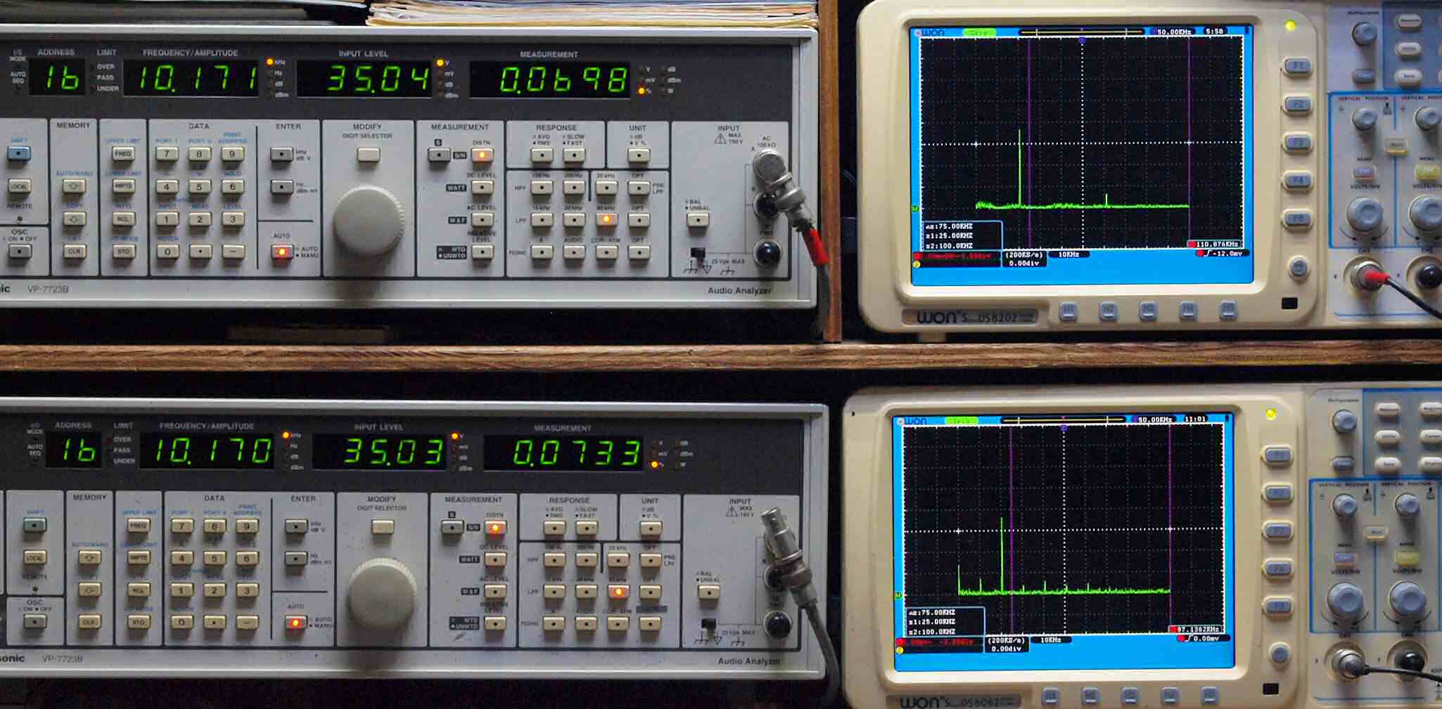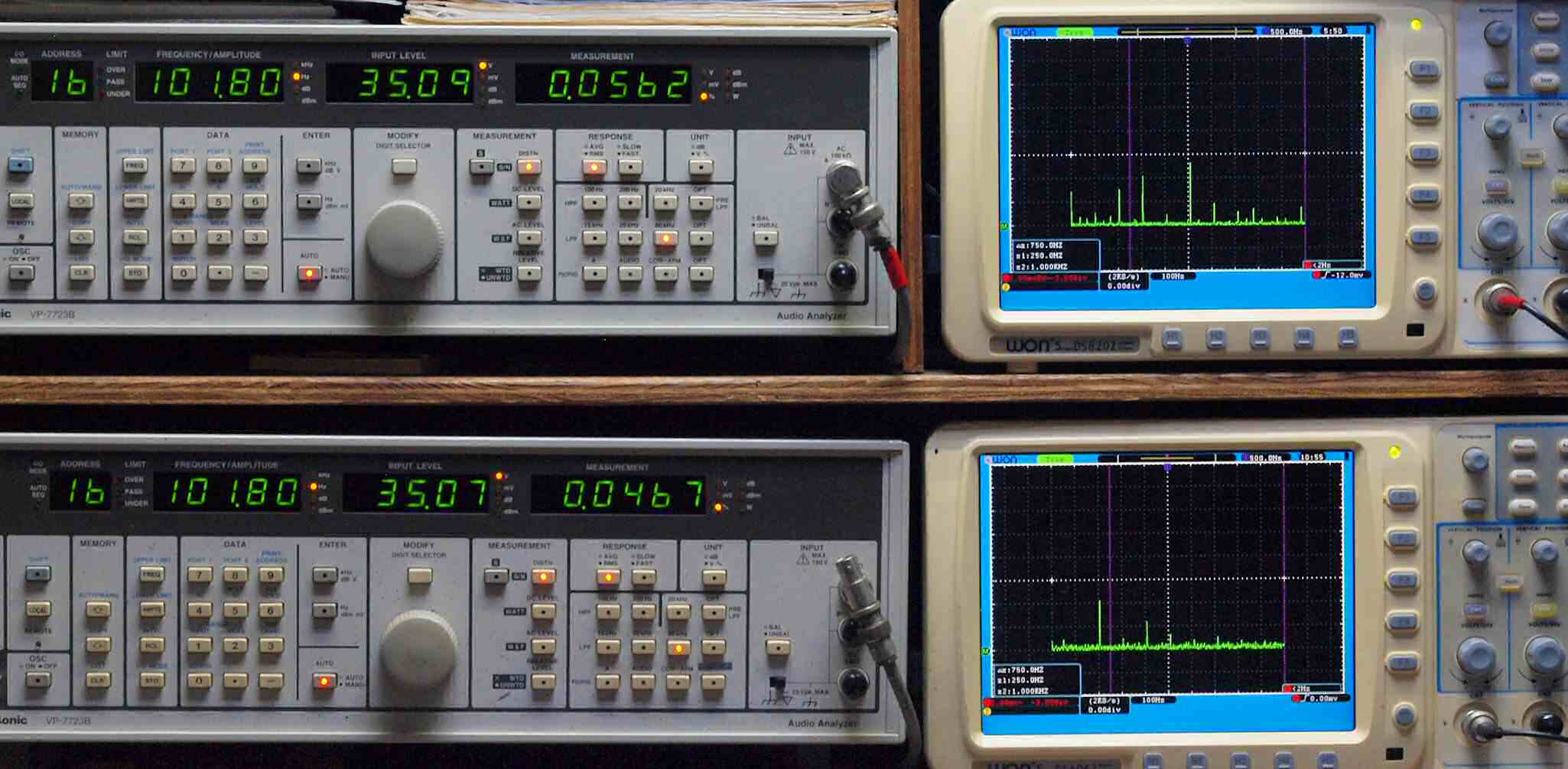 よって、ダイアル設定出力レベルより低くなります。測定機器の仕様や整備の様子はこちら、「VP−7723B」「VP−7201A」。 FFT画面の見方はこちら。