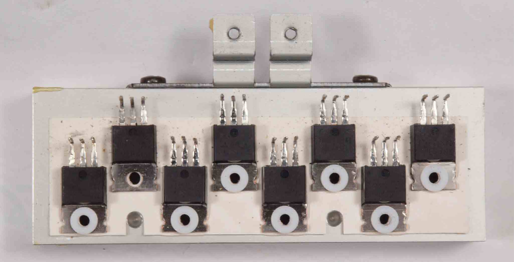 A43. 点検中 さらにもう1レーン購入した終段FET(電界効果トランジスター)。上の小さい列はドライブIC。