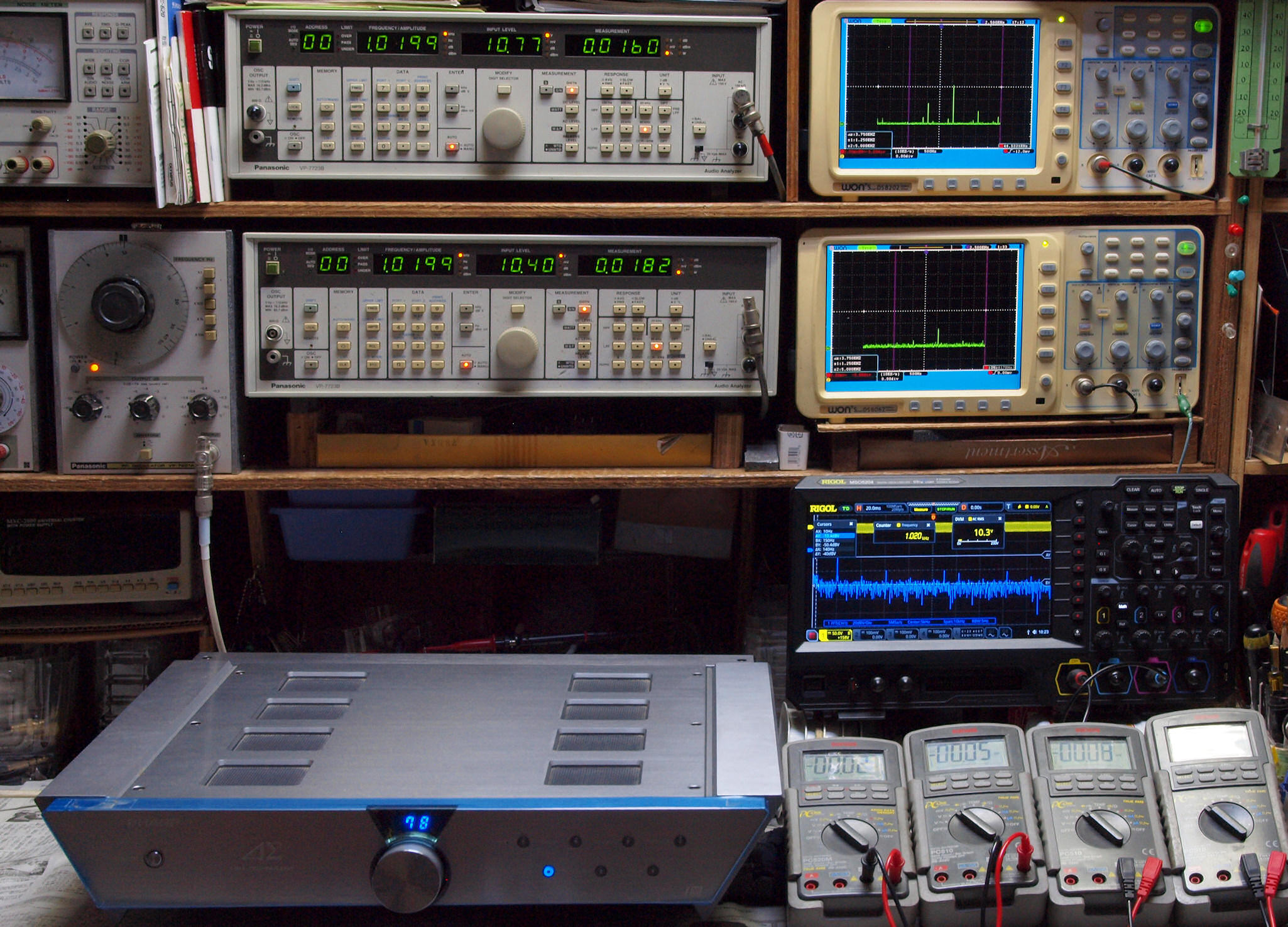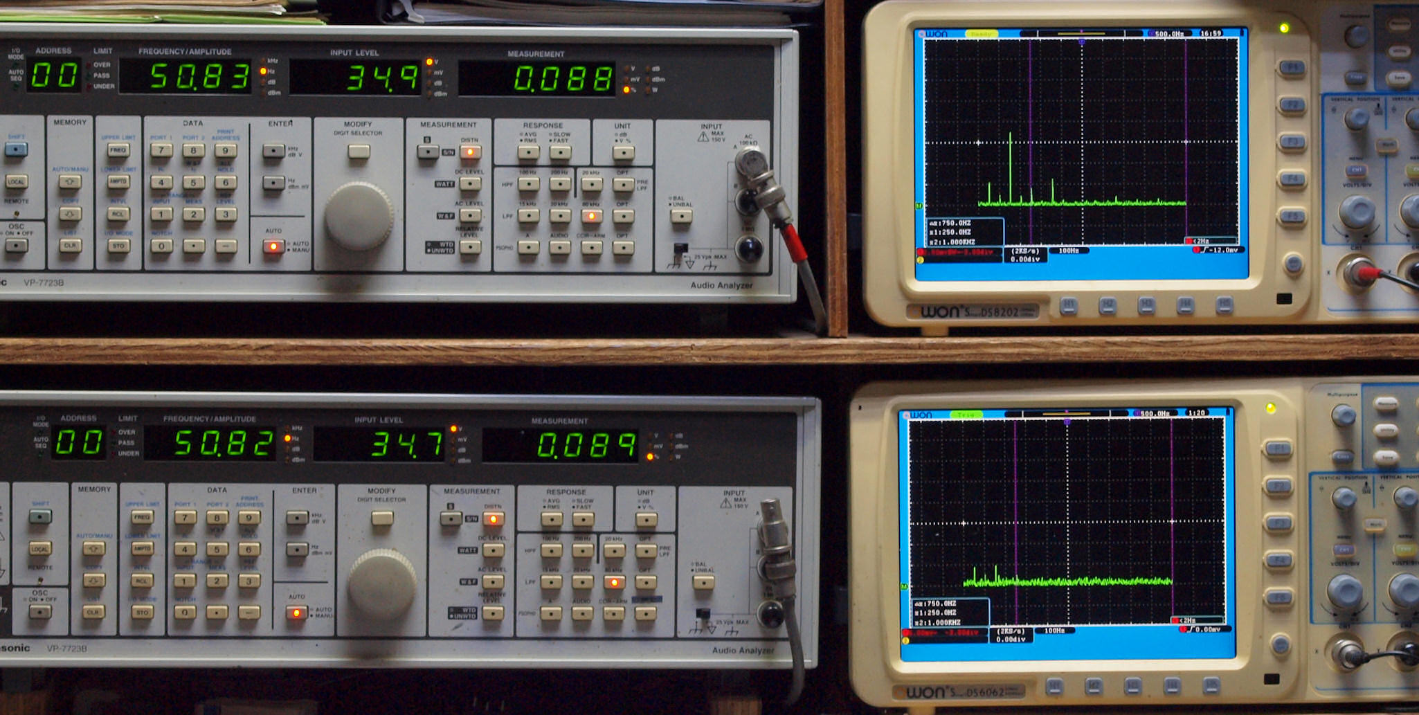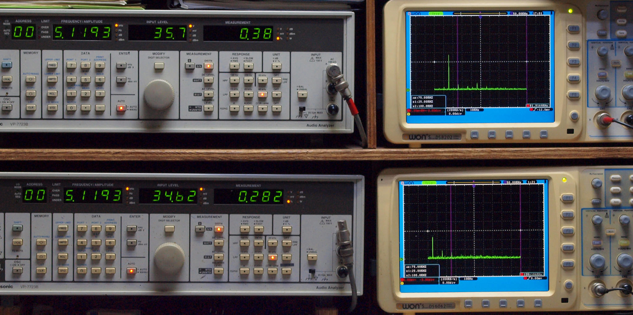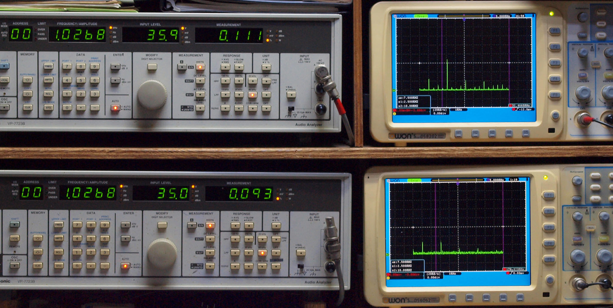 上段右端 VP−7723Bの基本波除去出力を「owon SDS8202(200MHZ)」で「FFT分析」表示。