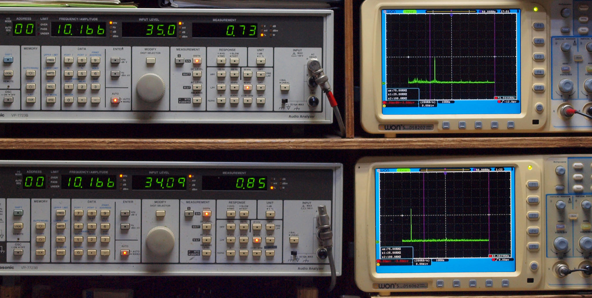 よって、ダイアル設定出力レベルより低くなります。測定機器の仕様や整備の様子はこちら、「VP−7723B」「VP−7201A」。 FFT画面の見方はこちら。