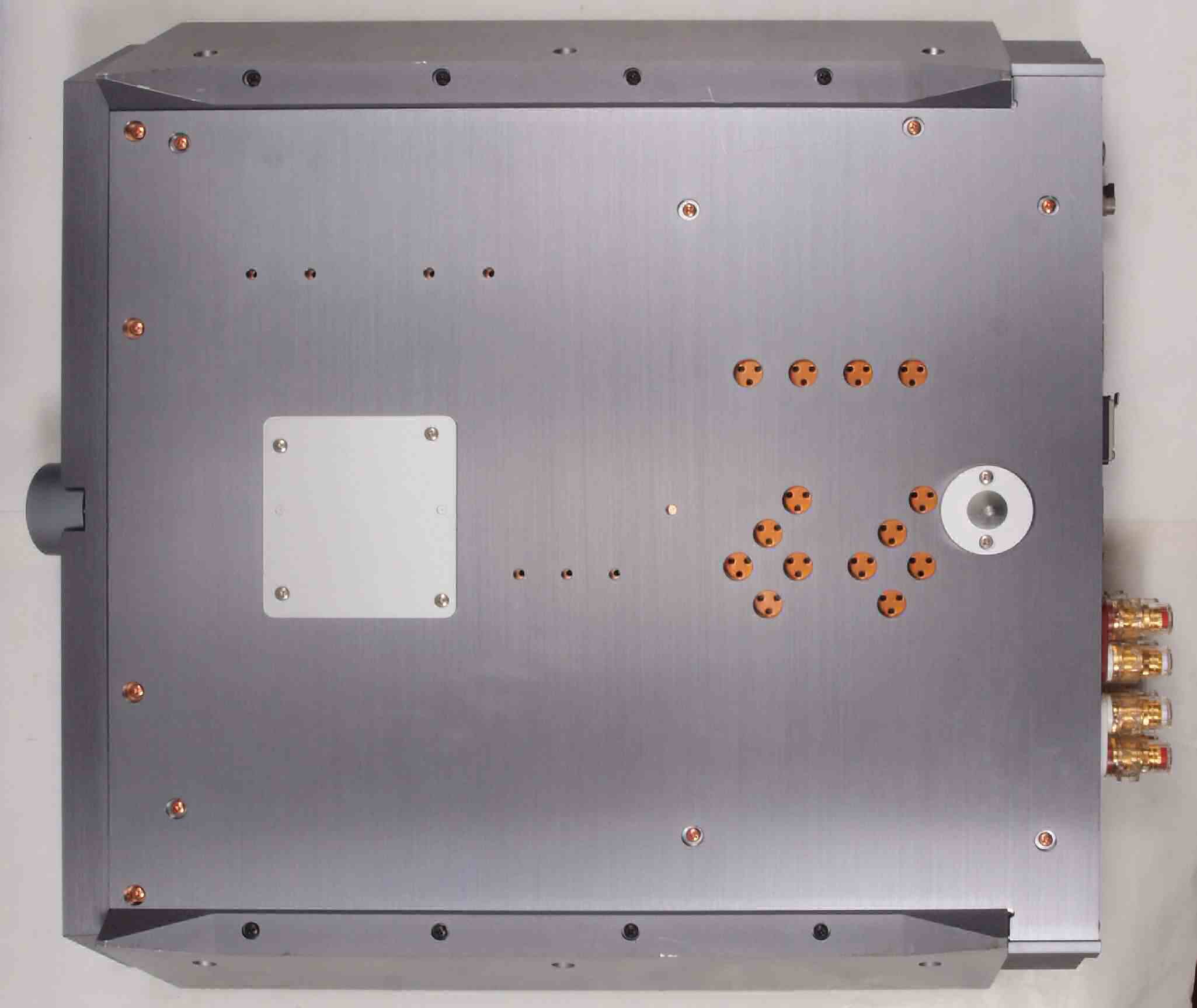 A22. 点検中 上下蓋・左右パネル・センターブースを取り、右横から見る。右パネル押さえ止ビスを2本無。