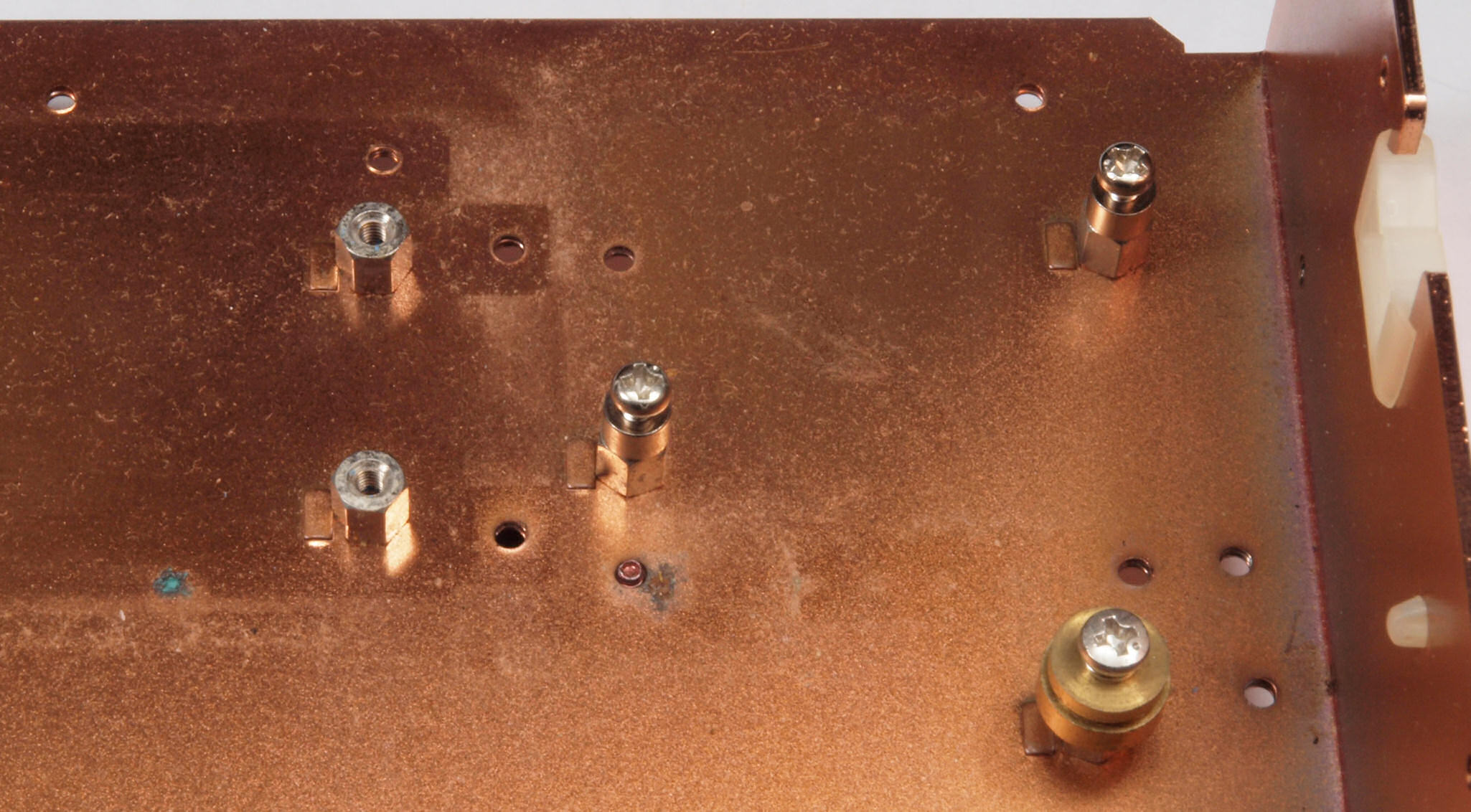 C01. 修理中 部品・基板を取り去ったシャーシ裏。錆が発生している。