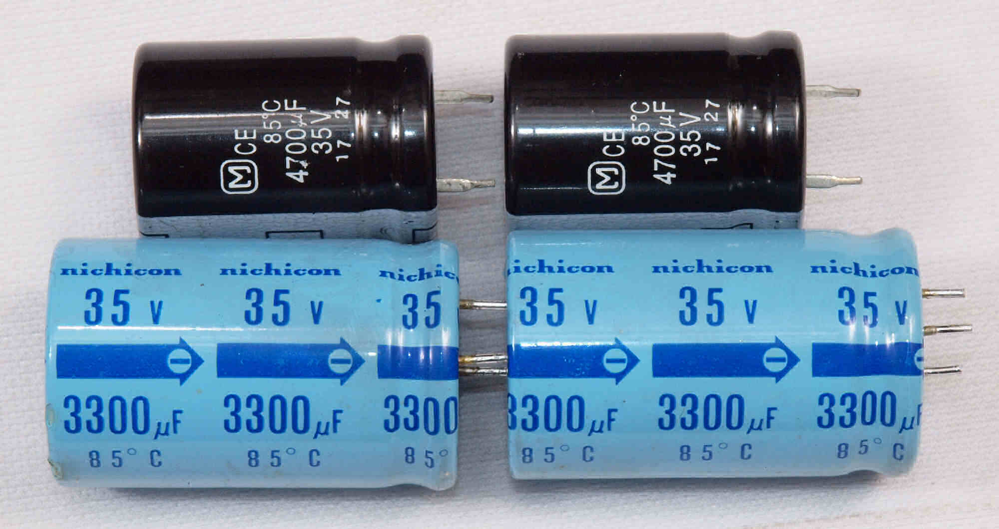 | A41. 点検中 交換する電源電解コンデンサー比較、上=交換する4700μ/35V、下=付属3300μ/35V。 | ||||||||||||||||||||||||||||||||||||||||