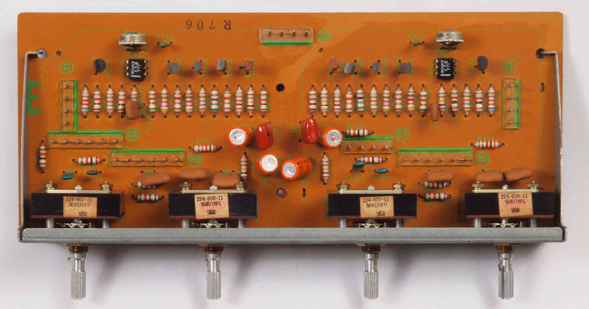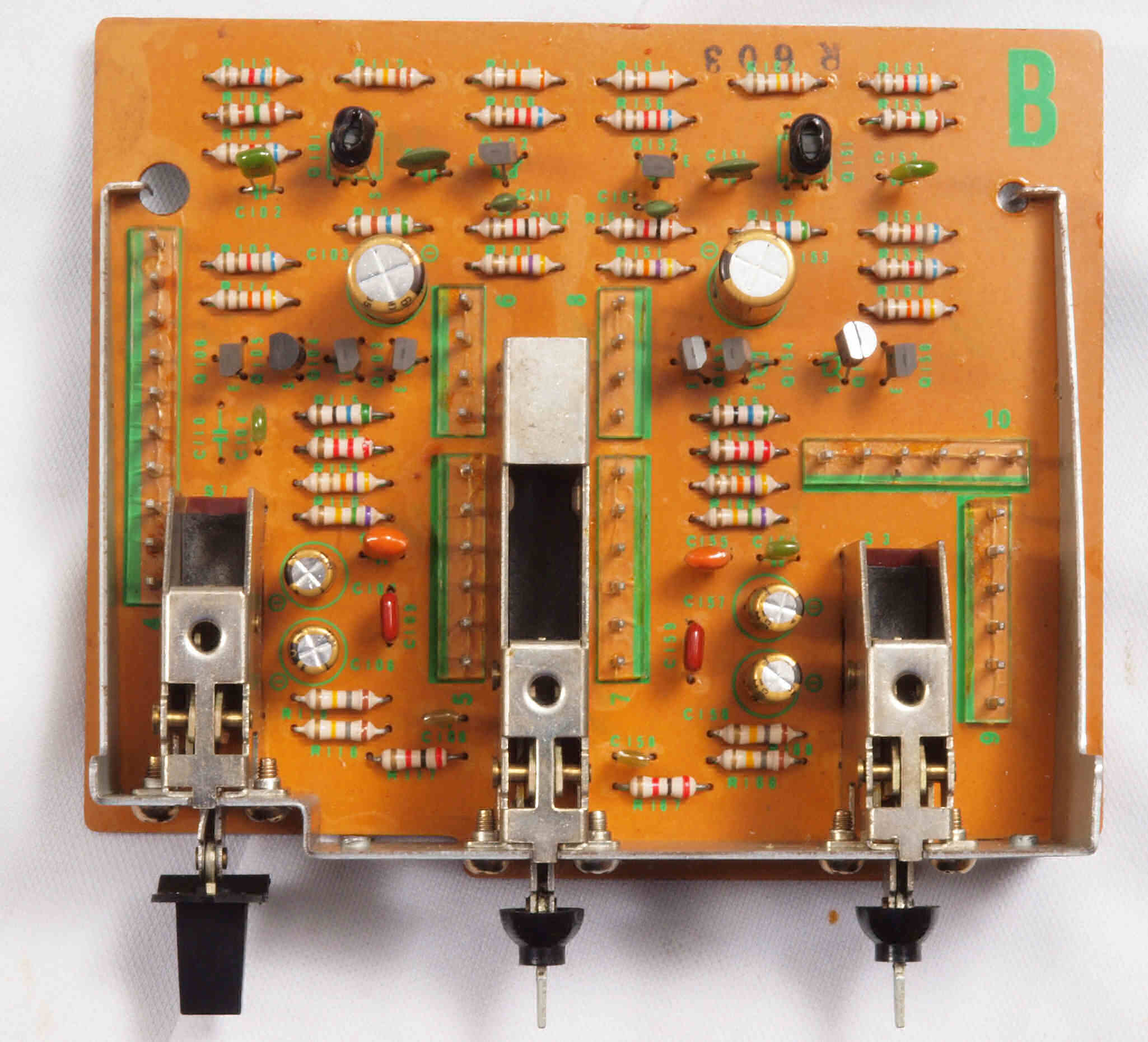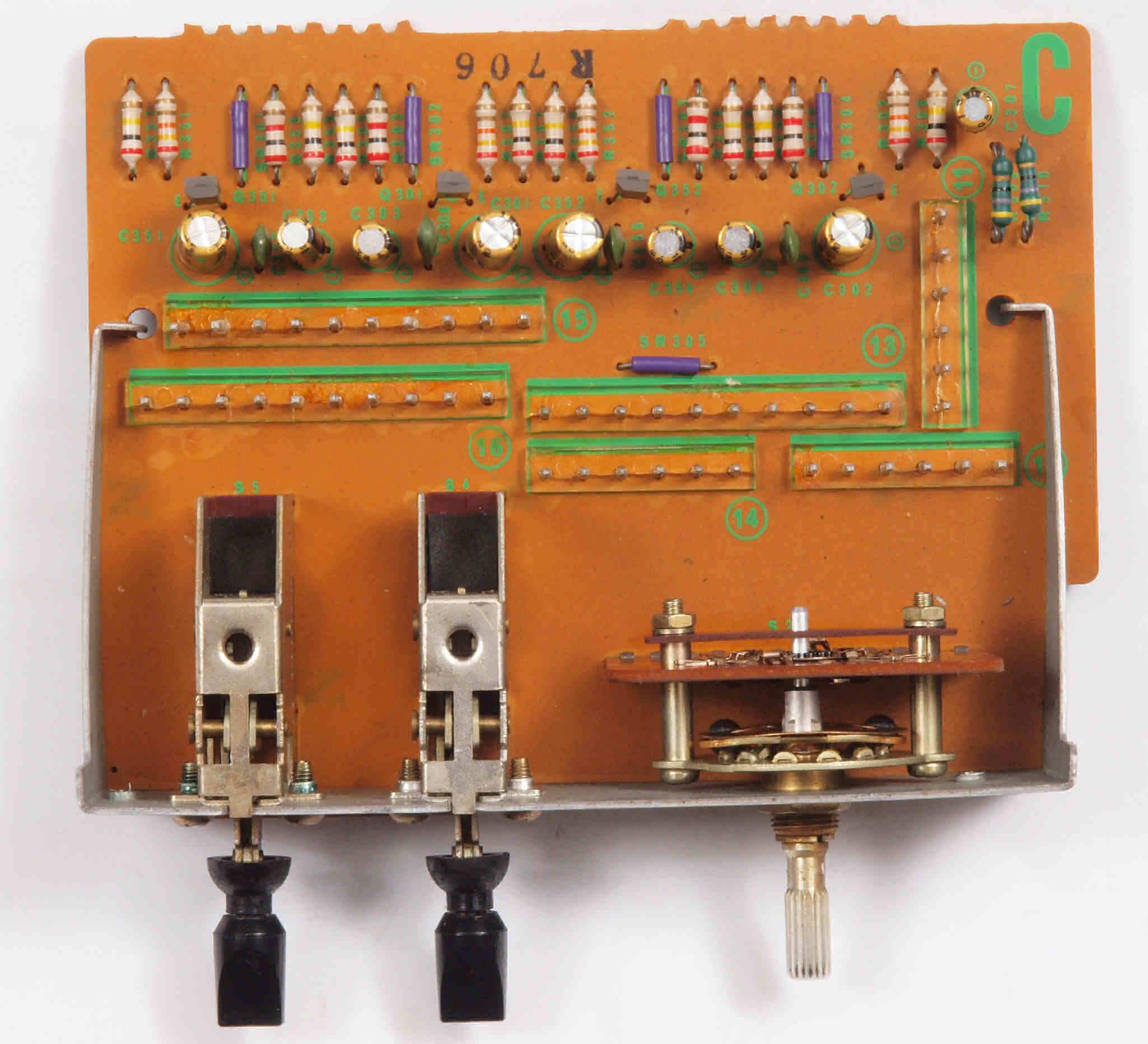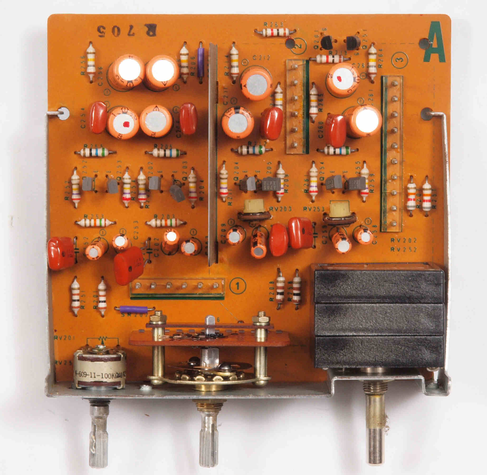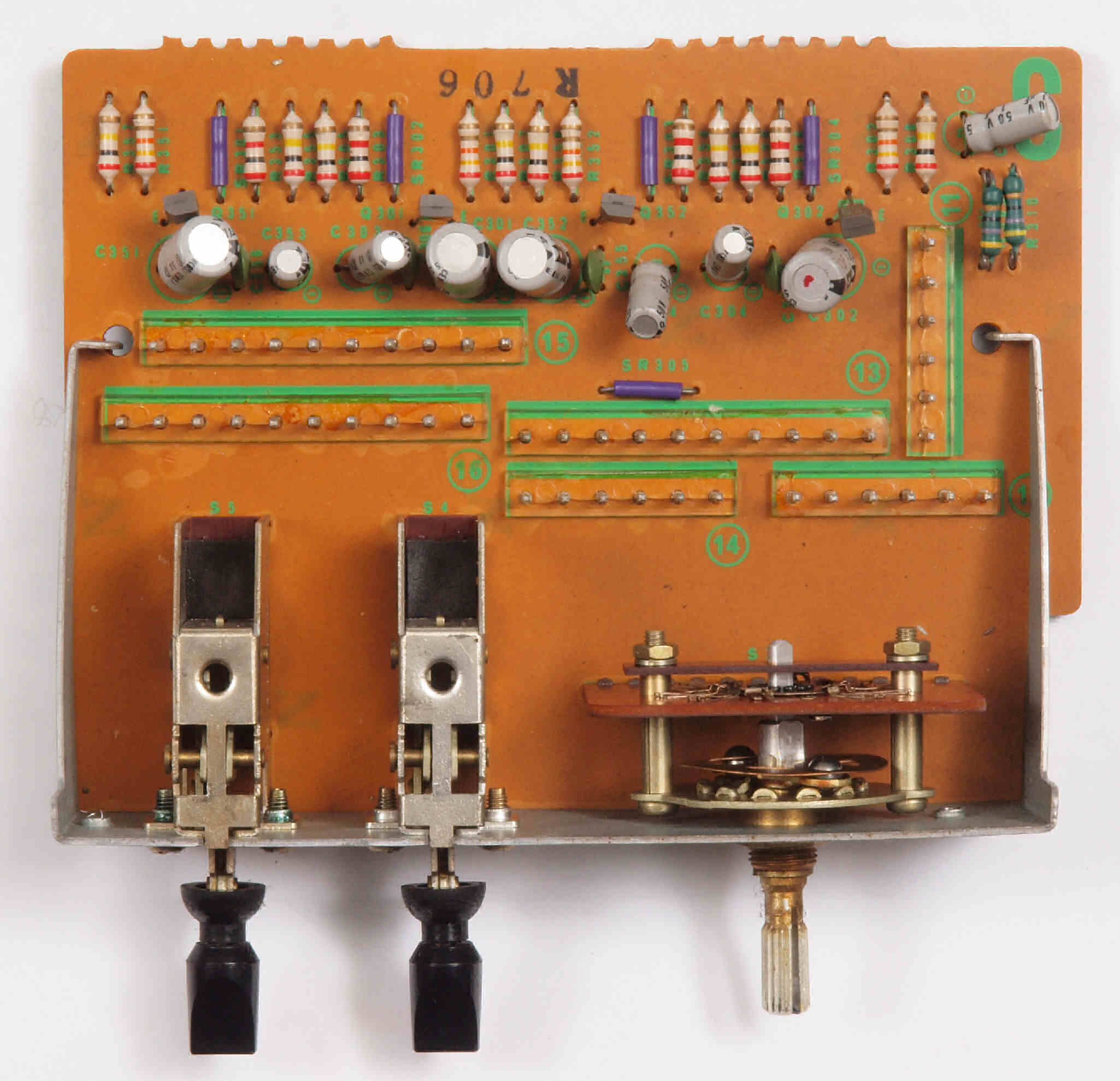 | C32. 修理後 トーン基板。 FET(電界効果トランジスター)4個、TR(トランジスター)2個、電解コンデンサー4個、半固定VR2個、フイルムコンデンサー12個交換。 | ||||||||||||||||||||||||||||||||||||||||