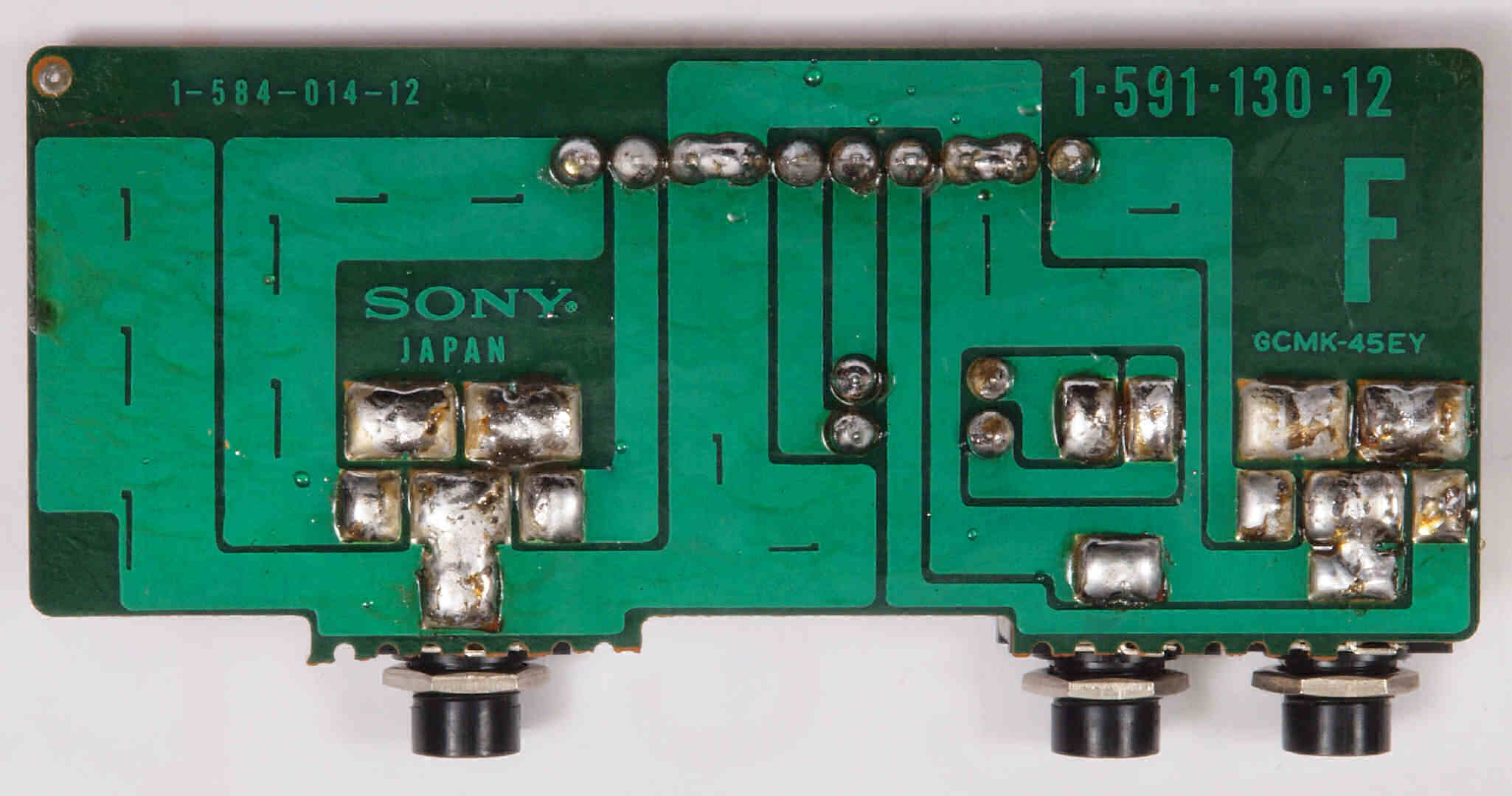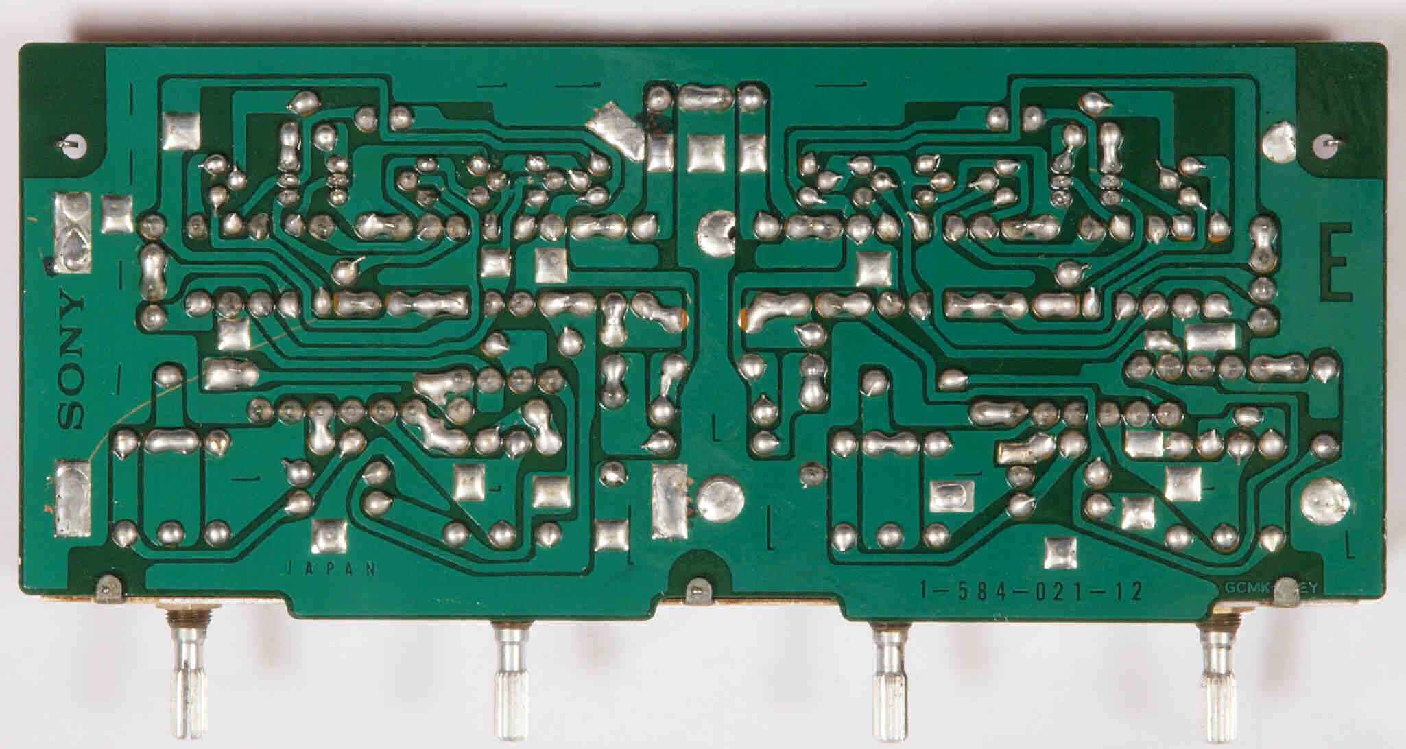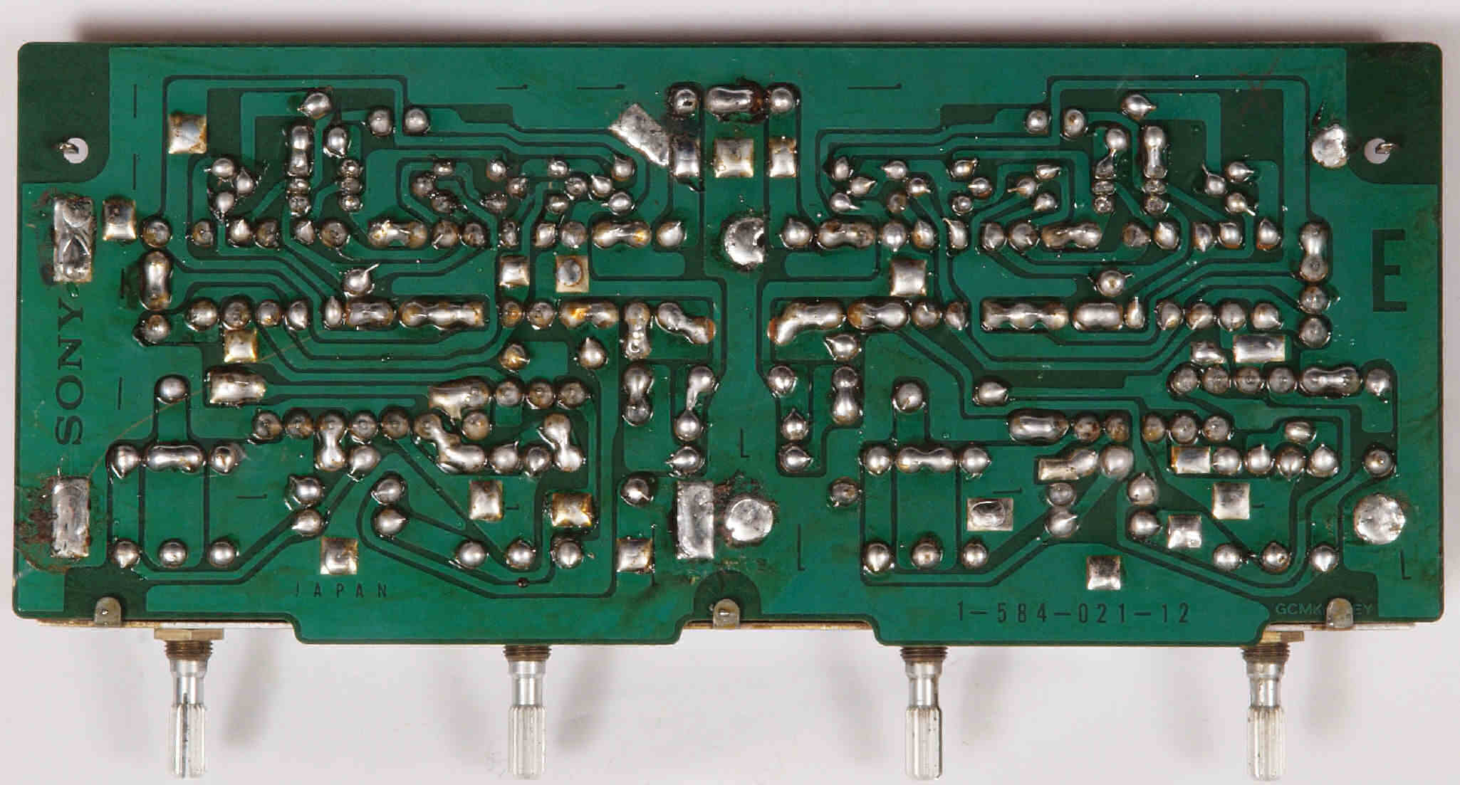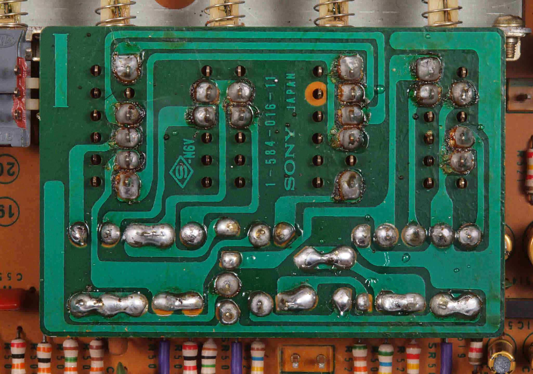 | C74. 修理(半田補正)後 入出力RCA端子郡基板裏。 テフロン絶縁RCA端子に交換し、半田を全部やり直す。 | ||||||||||||||||||||||||||||||||||||||||