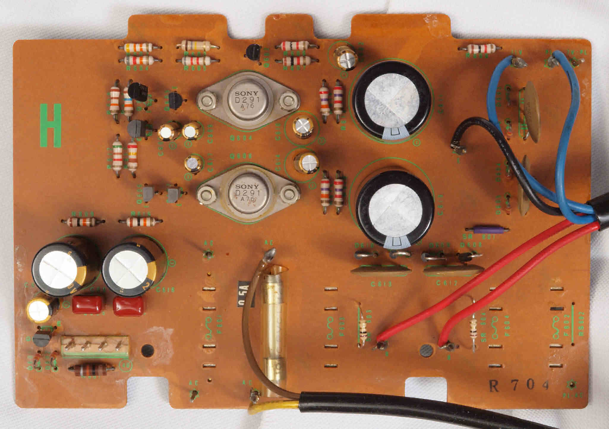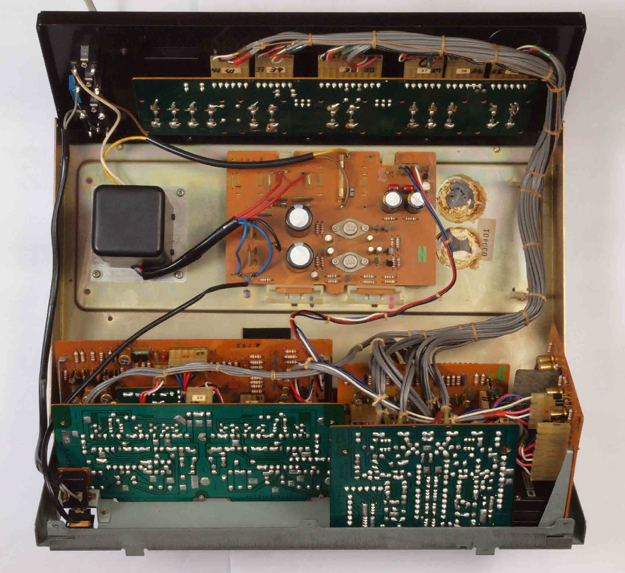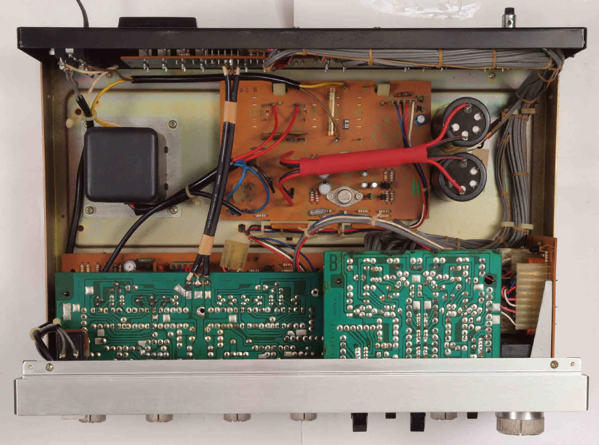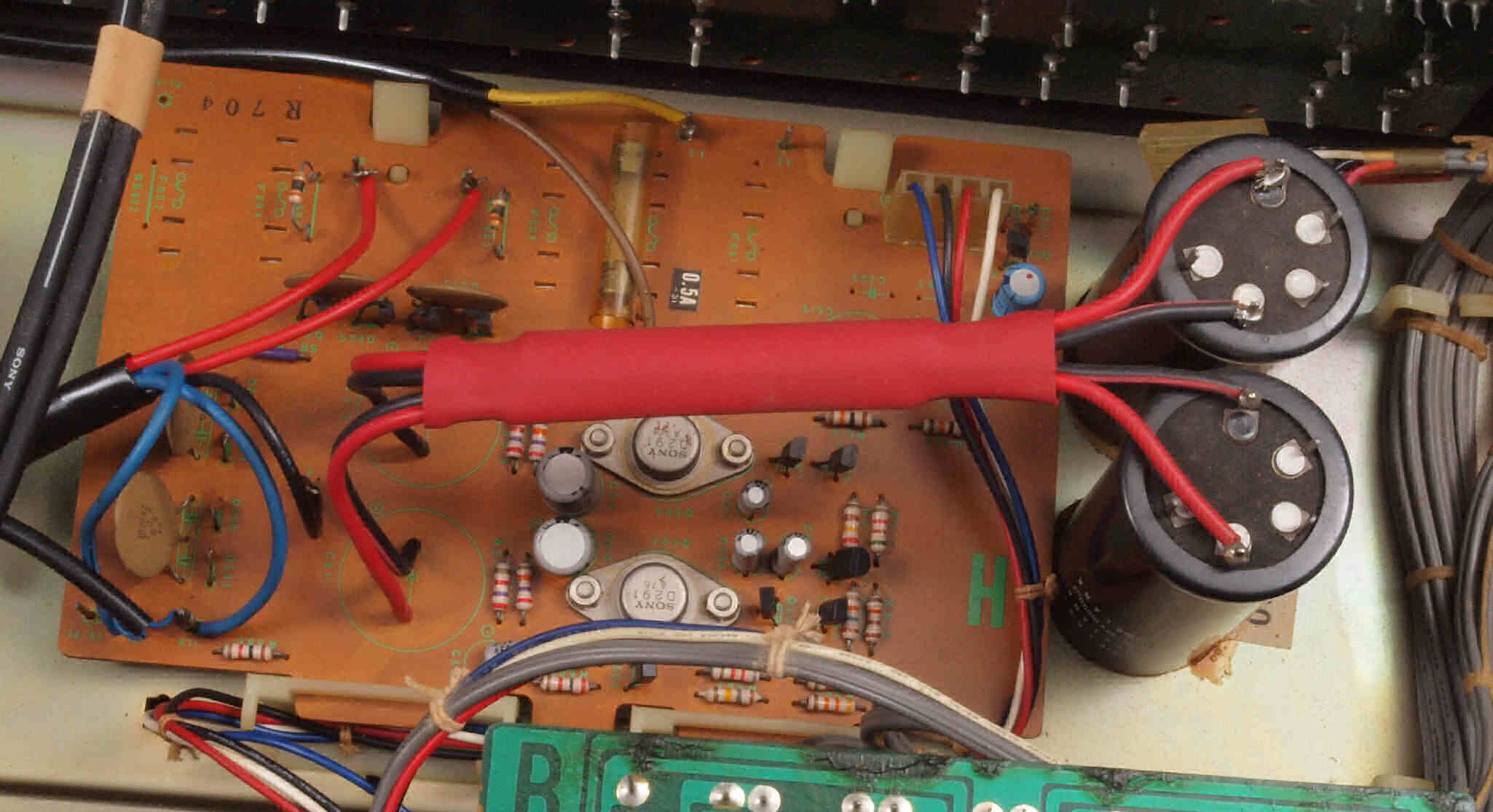 | A32. 点検中 上蓋を取り、上から見る。 電源ブロック電解コンデンサー2個が交換されている。足長コンデンサー! |