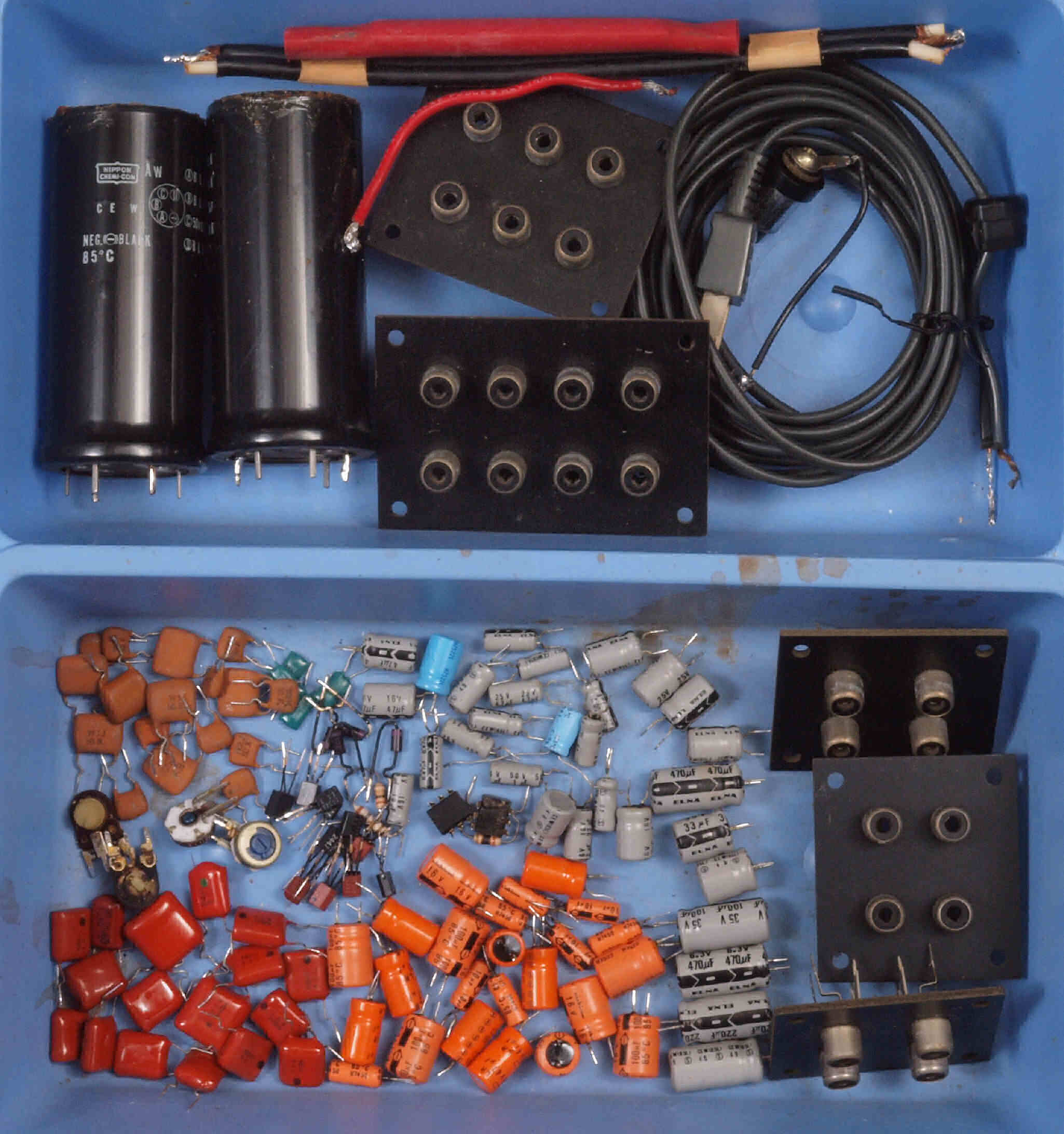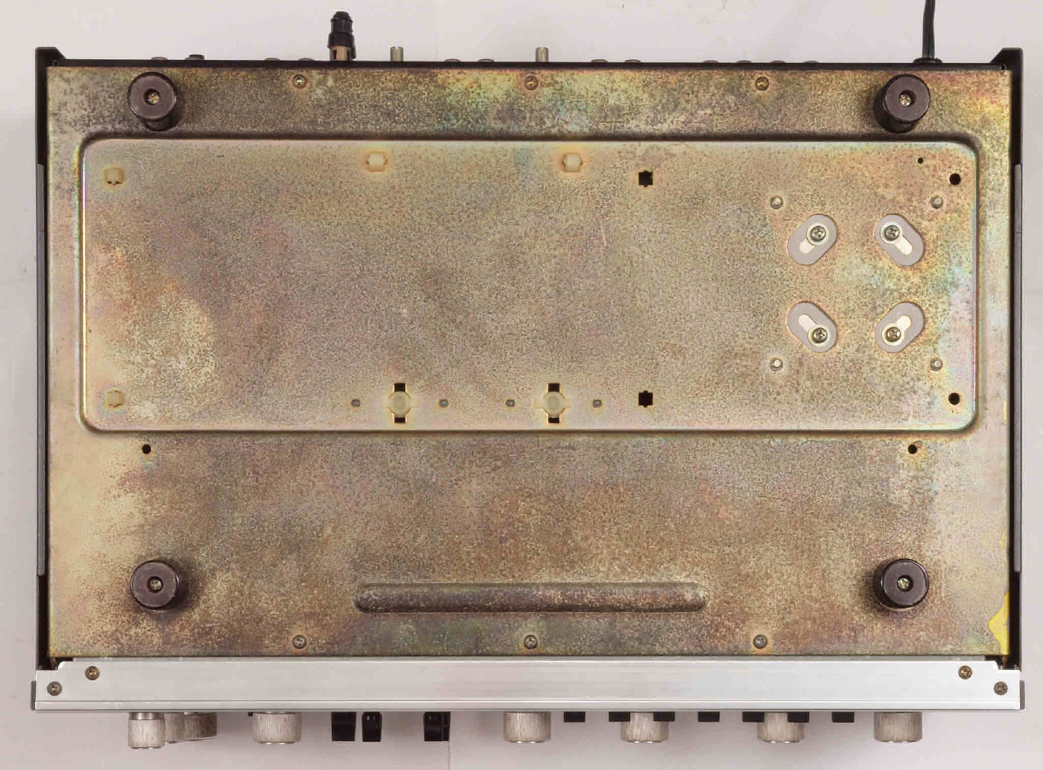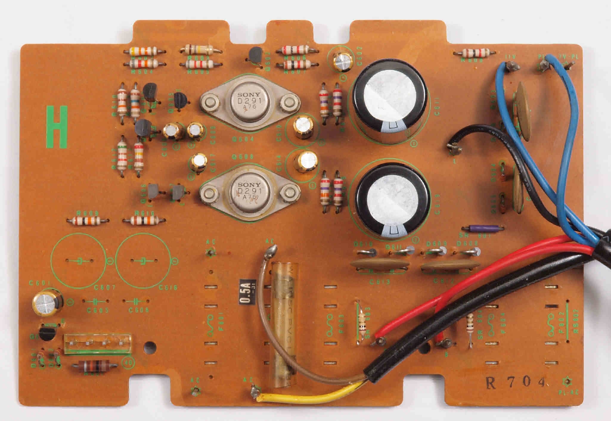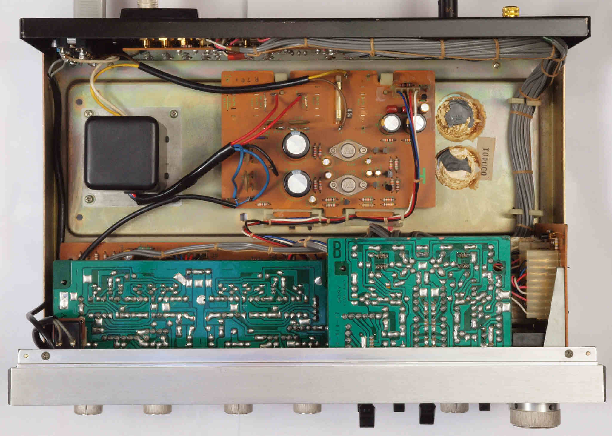 | A32. 点検中 上蓋を取り、上から見る。 電源ブロック電解コンデンサー2個が交換されている。足長コンデンサー! |