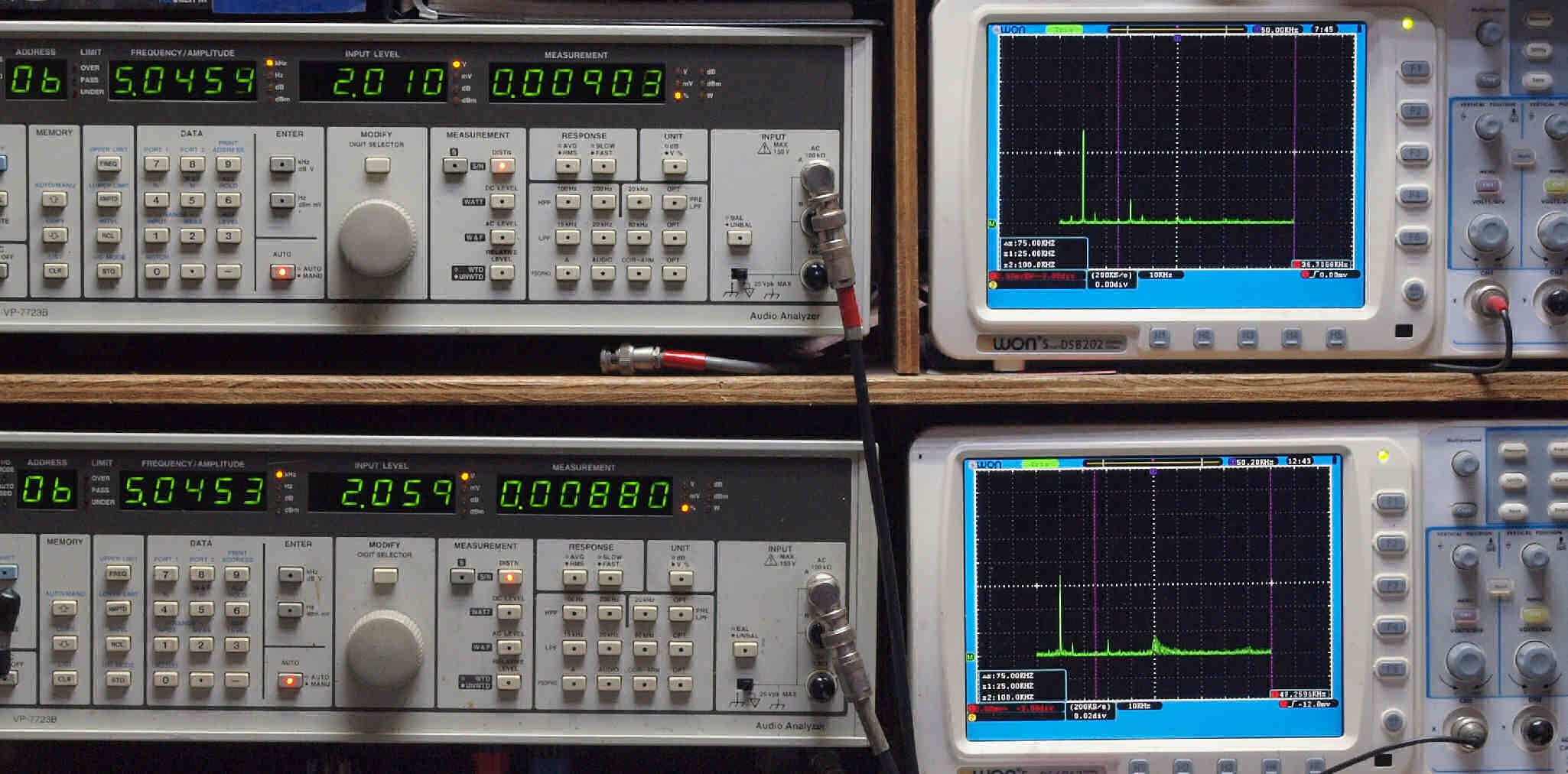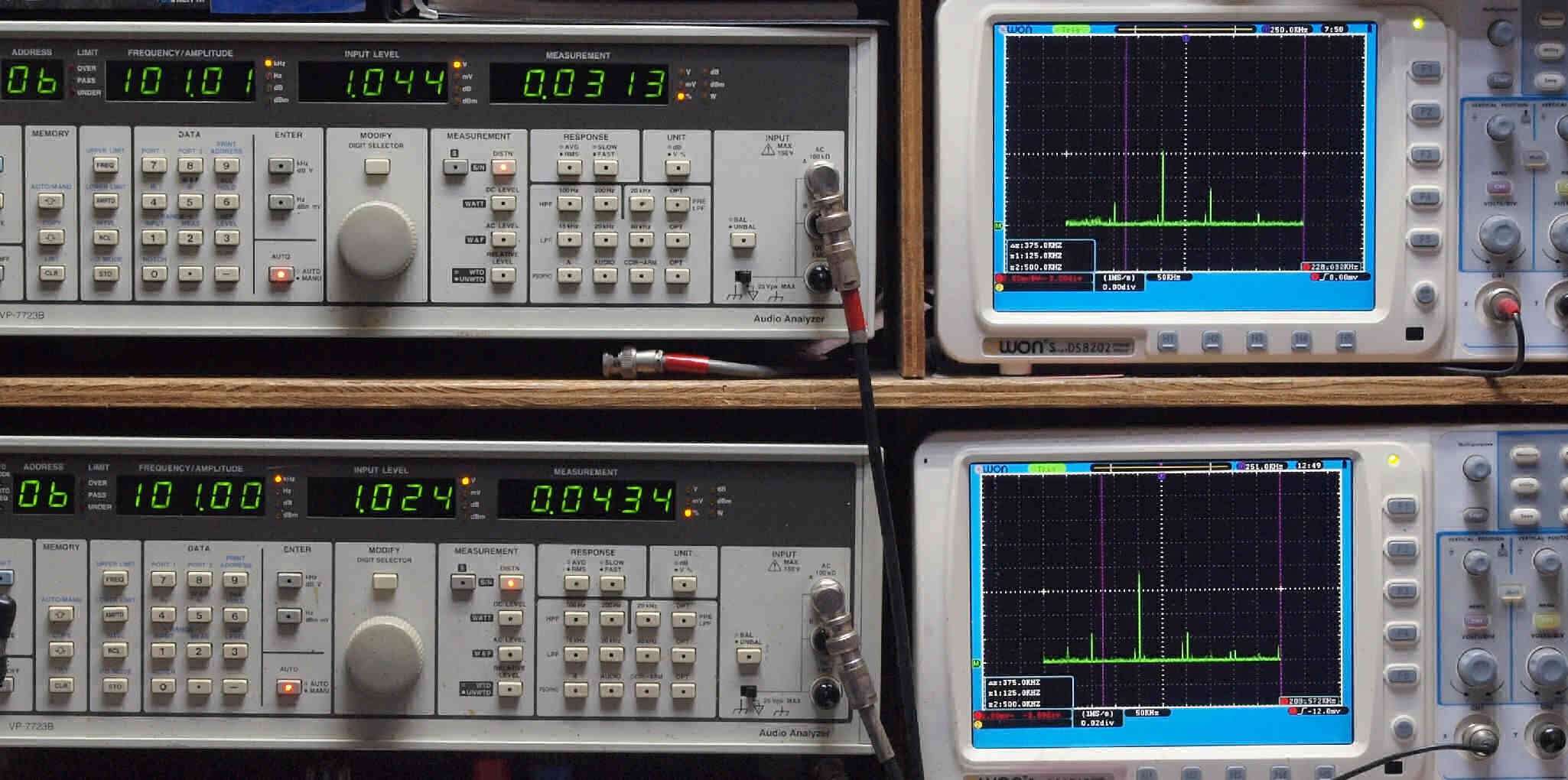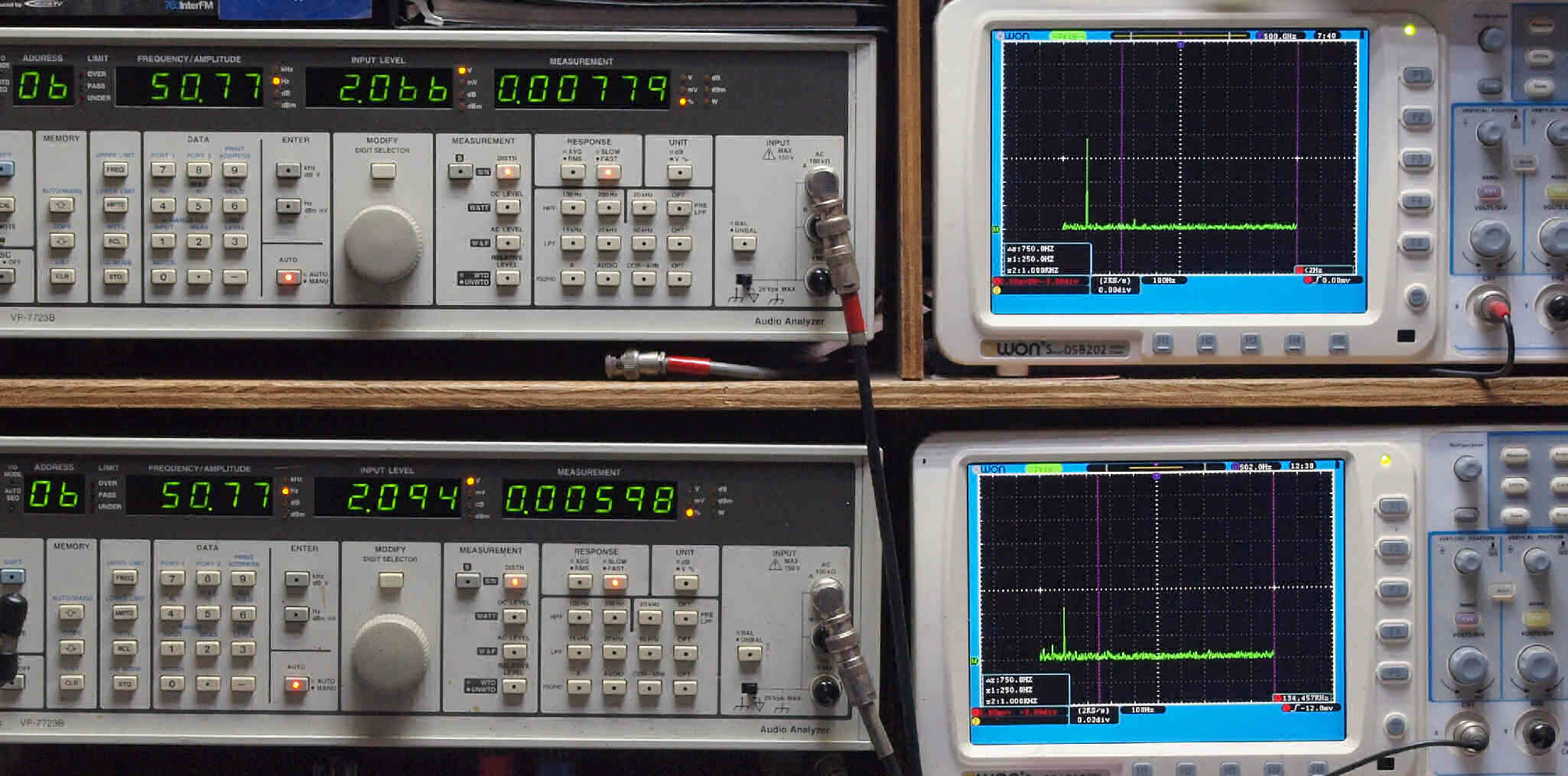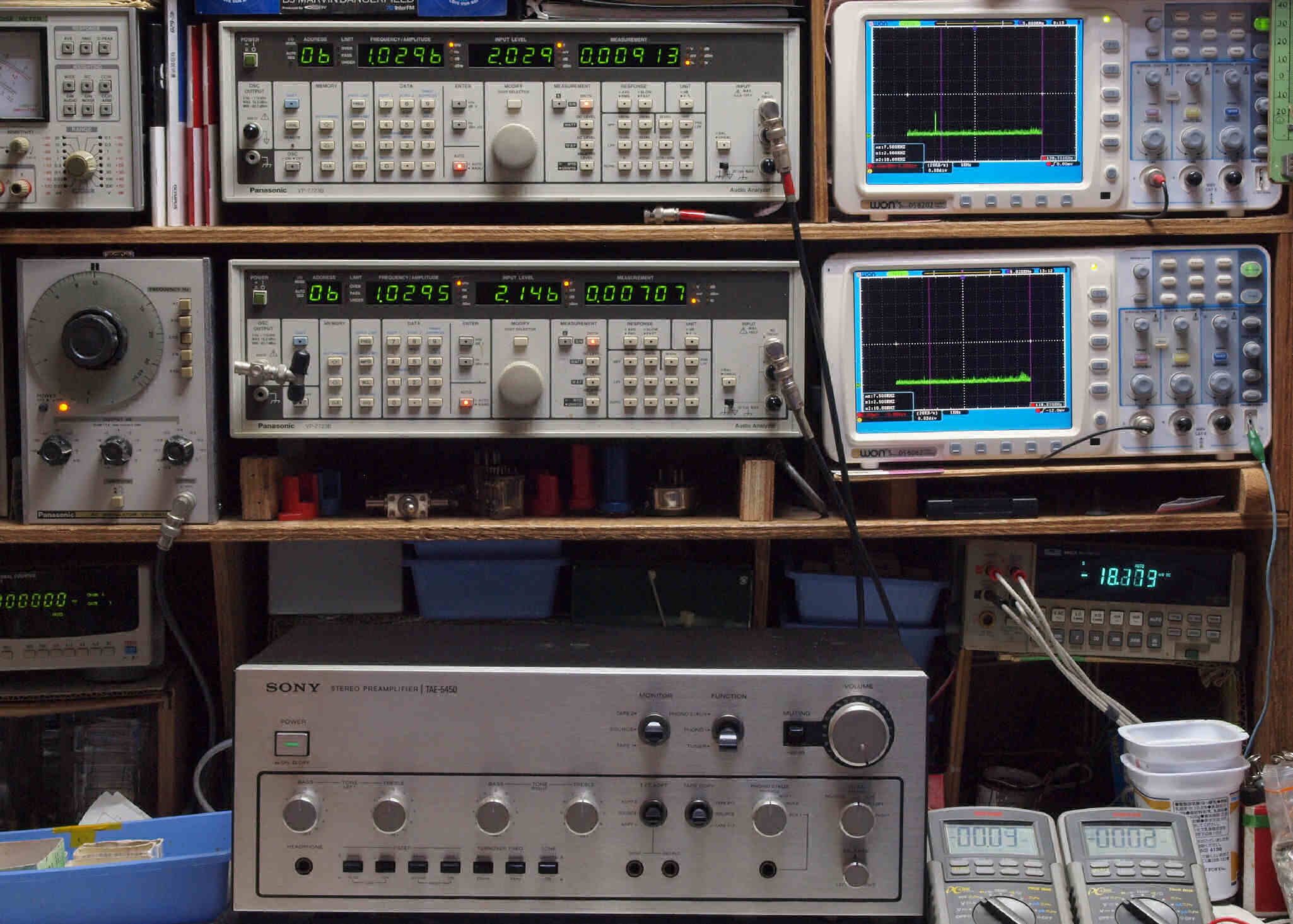 | E. 調整・測定。 画像をクリックすると、大きく(横幅2050ドット)表示されます。 E0. 出力・歪み率測定・調整。 「見方」。 上段中 右側出力を「Audio Analyzer Panasonic VP−7723B」により測定。 表示LED、 左端=メモリーNo、 中左=周波数測定、 中右=出力電圧測定、 右端=歪み率測定。 上段右端 VP−7723Bの基本波除去出力を「owon SDS8202(200MHZ)」で「FFT分析」表示。 下段中 左側出力を「Audio Analyzer Panasonic VP−7723B」により測定。 表示LED、 左端=メモリーNo、 中左=周波数測定、 中右=出力電圧測定、 右端=歪み率測定。 下段右端 VP−7723Bの基本波除去出力を「owon SDS6062(200MHZ)」で「FFT分析」表示。 下段左端 オーディオ発振器 VP−7201A より50Hz〜100kHzの信号を出し(歪み率=約0.003%)、ATT+分配器を通し、AMPに入力。 よって、ダイアル設定出力レベルより低くなります。測定機器の仕様や整備の様子はこちら、「VP−7723B」「VP−7201A」。 FFT画面の見方はこちら。 |