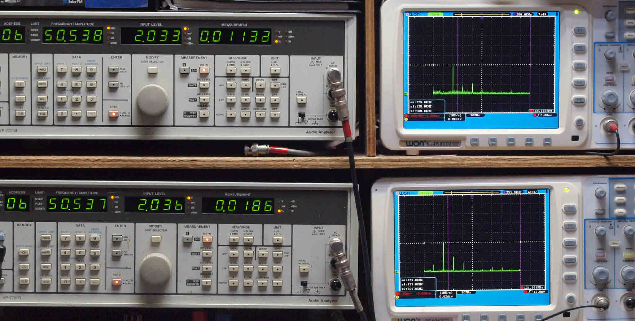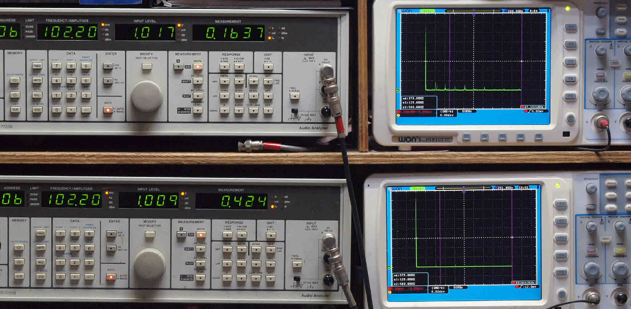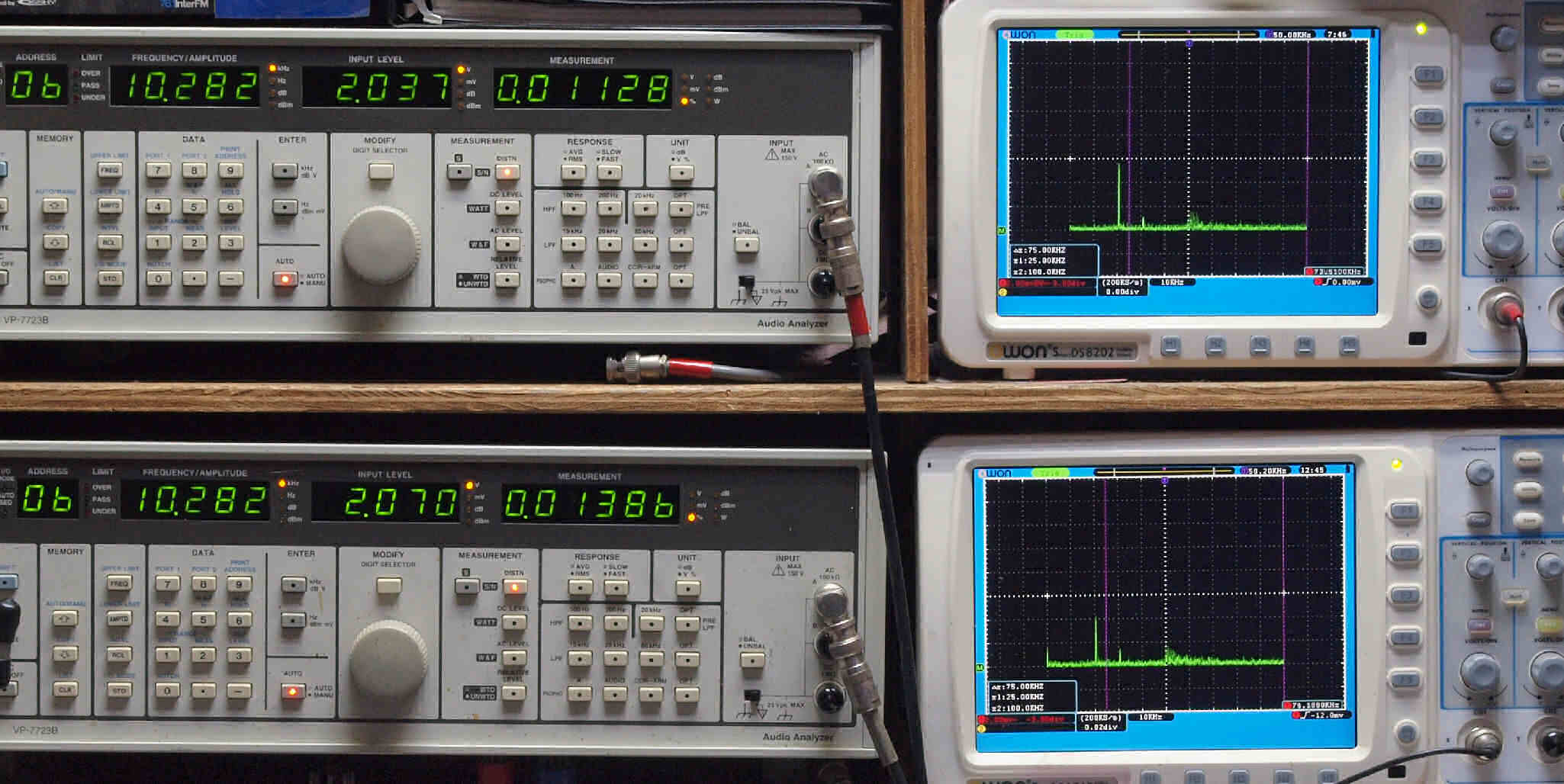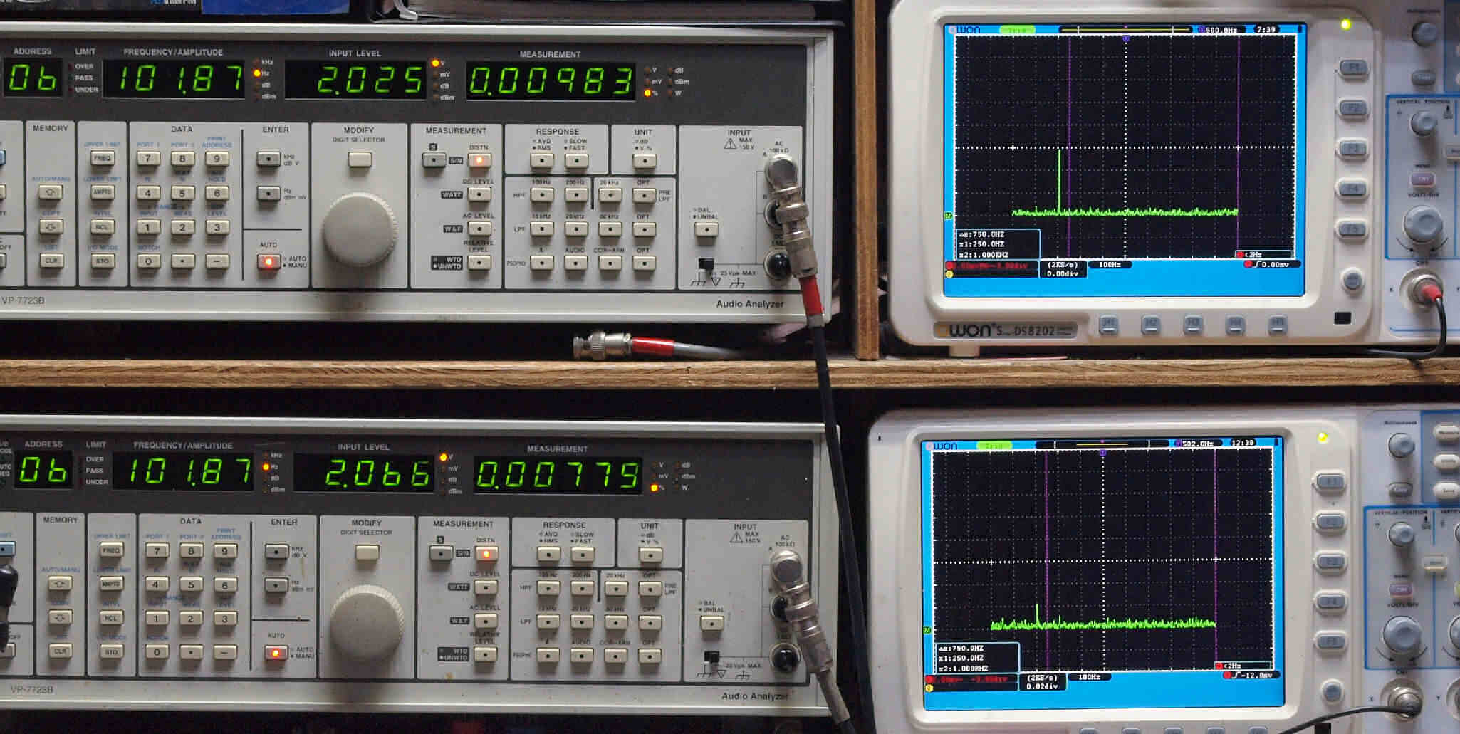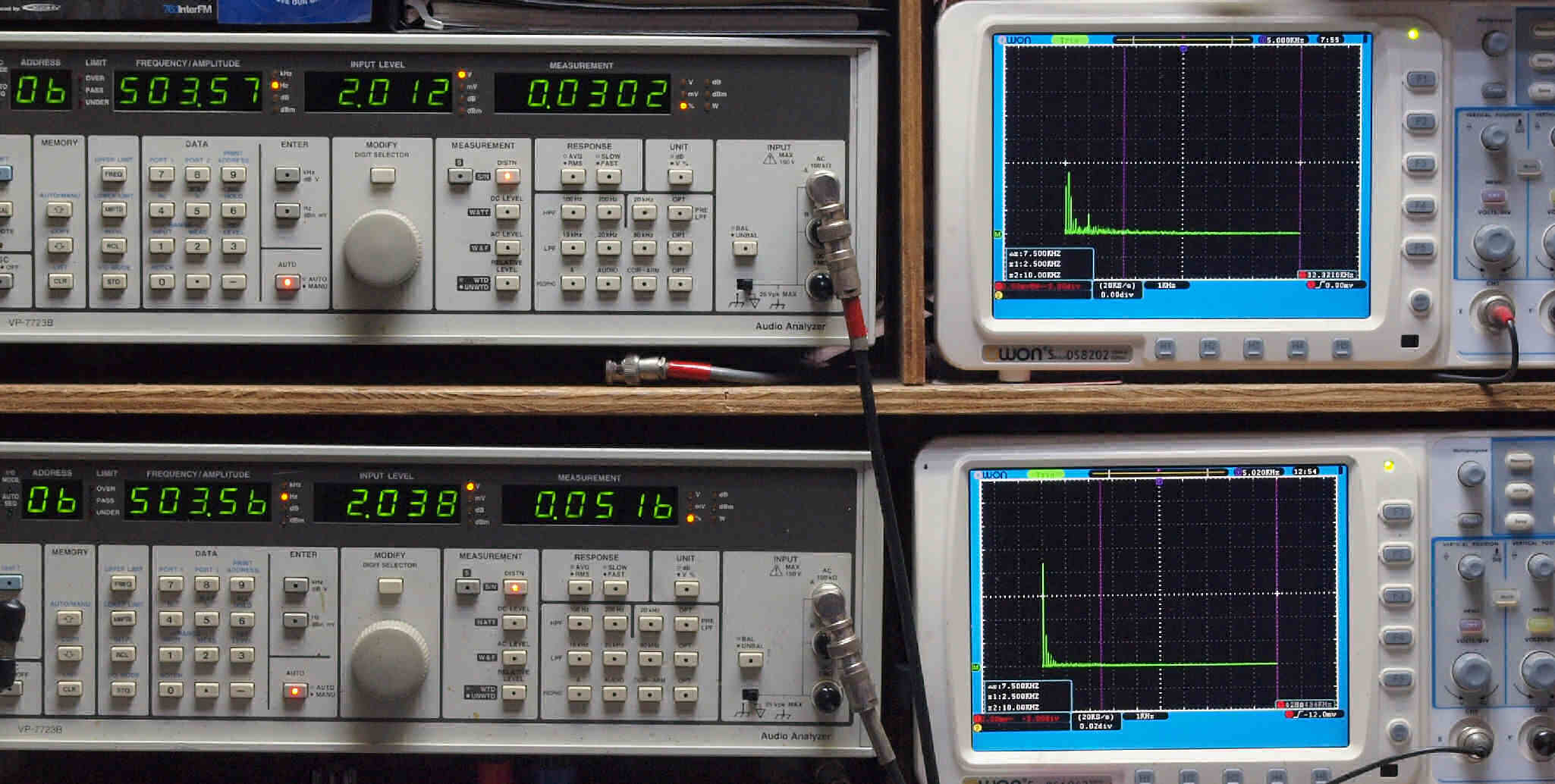 | E. 調整・測定。 画像をクリックすると、大きく(横幅2050ドット)表示されます。 E0. 出力・歪み率測定・調整。 「見方」。 上段中 右側出力を「Audio Analyzer Panasonic VP−7723B」により測定。 表示LED、 左端=メモリーNo、 中左=周波数測定、 中右=出力電圧測定、 右端=歪み率測定。 上段右端 VP−7723Bの基本波除去出力を「owon SDS8202(200MHZ)」で「FFT分析」表示。 下段中 左側出力を「Audio Analyzer Panasonic VP−7723B」により測定。 表示LED、 左端=メモリーNo、 中左=周波数測定、 中右=出力電圧測定、 右端=歪み率測定。 下段右端 VP−7723Bの基本波除去出力を「owon SDS6062(200MHZ)」で「FFT分析」表示。 下段左端 オーディオ発振器 VP−7201A より50Hz〜100kHzの信号を出し(歪み率=約0.003%)、ATT+分配器を通し、AMPに入力。 よって、ダイアル設定出力レベルより低くなります。測定機器の仕様や整備の様子はこちら、「VP−7723B」「VP−7201A」。 FFT画面の見方はこちら。 |
