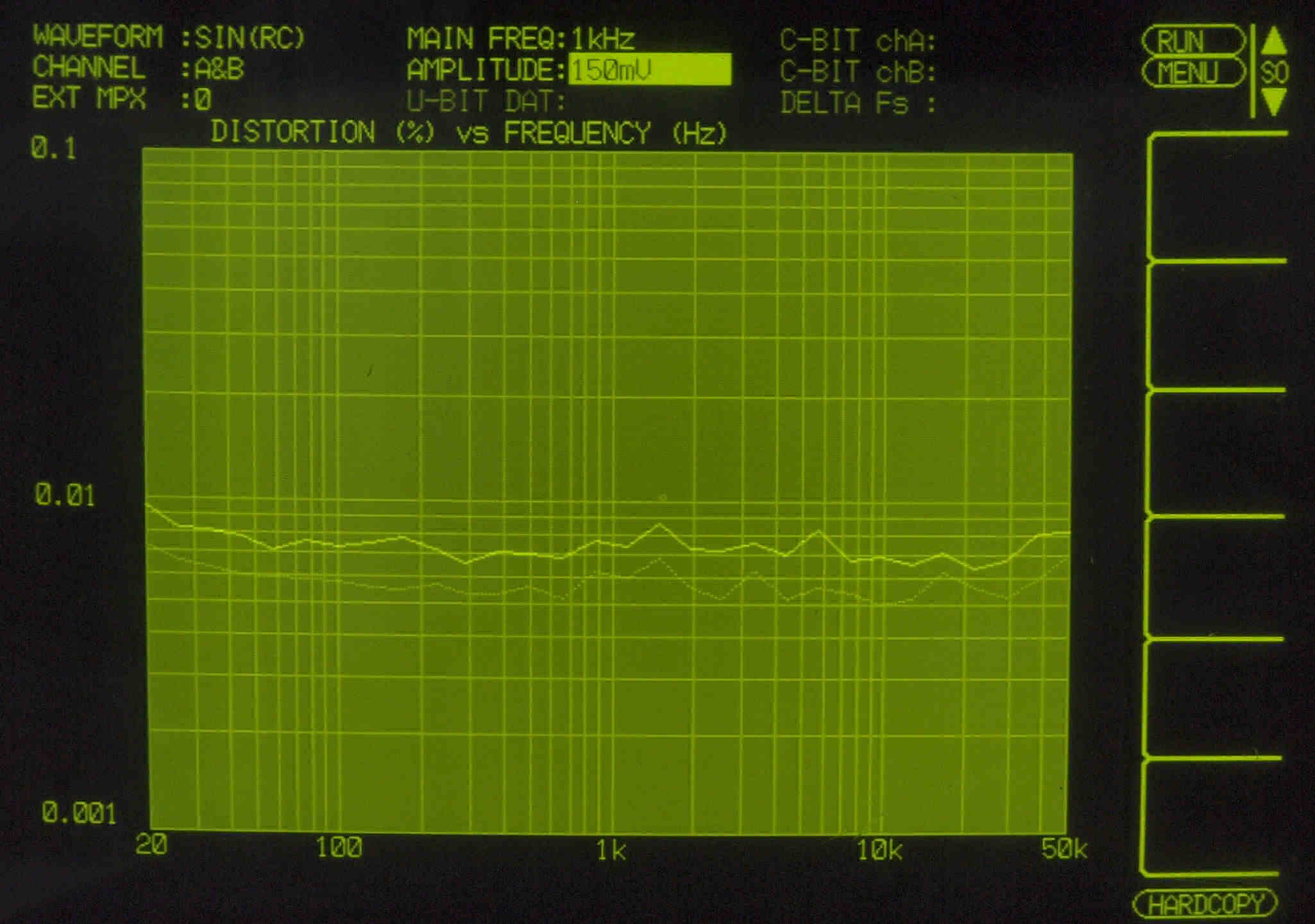| F12. 歪み率特性測定(AUX入力) AUX入力端子へ150mV一定入力 VRはmax。 左出力=薄(細い)色 右出力=濃い(太い)色 |