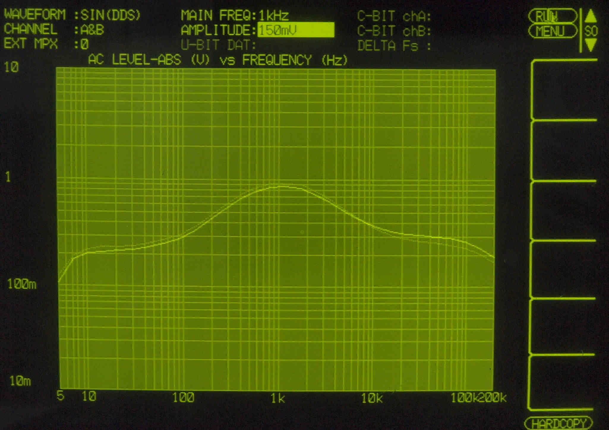 | F22. 入出力特性測定(MM入力) MC入力端子へ0.5mV入力 VRはmax 左出力=薄(細い)色 右出力=濃い(太い)色。 |