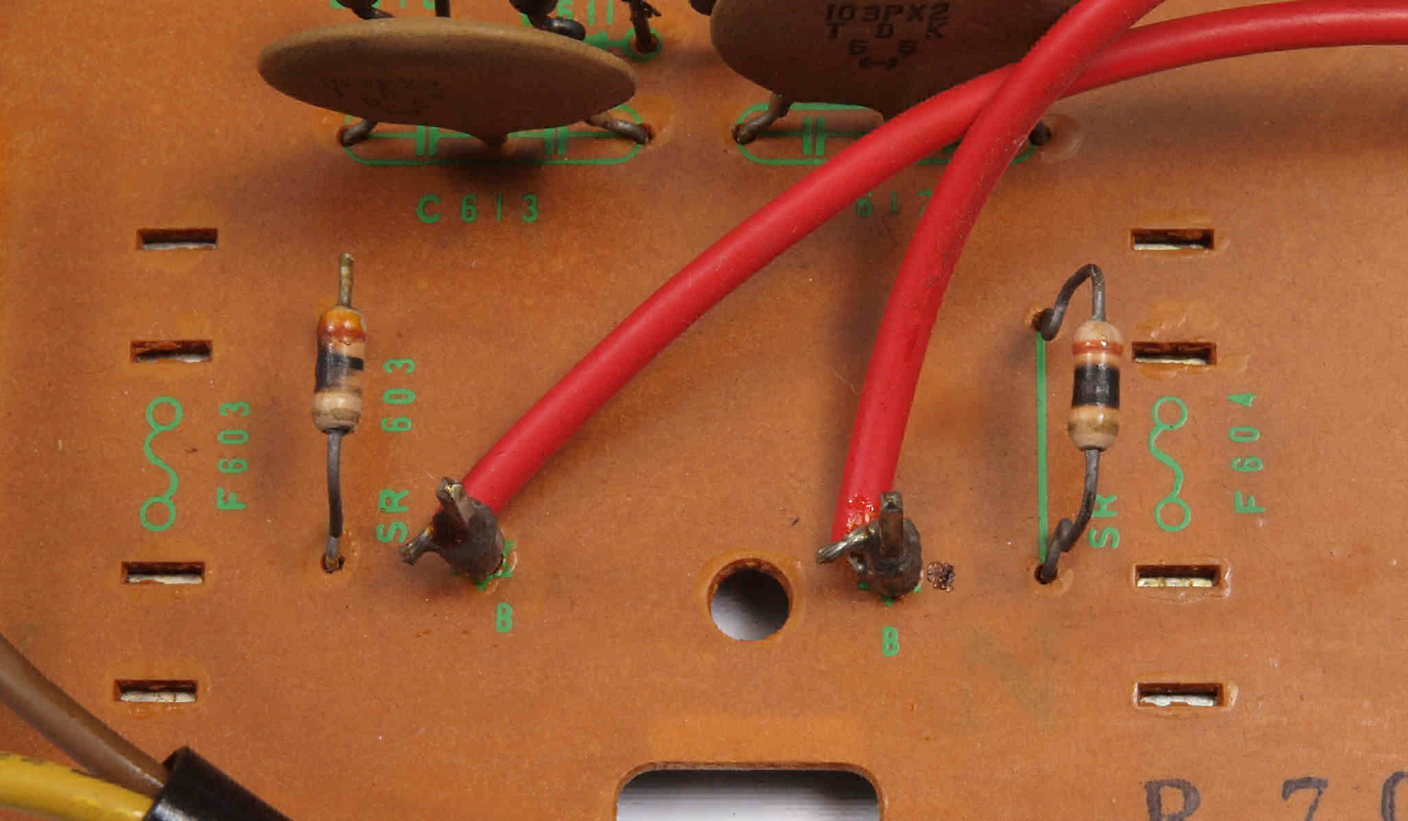 | C112. 修理前 電源基板。無闇にブロック電解コンデンサーを増量交換した為、焼けた抵抗。 | ||||||||||||||||||||||||||||||||||||||||