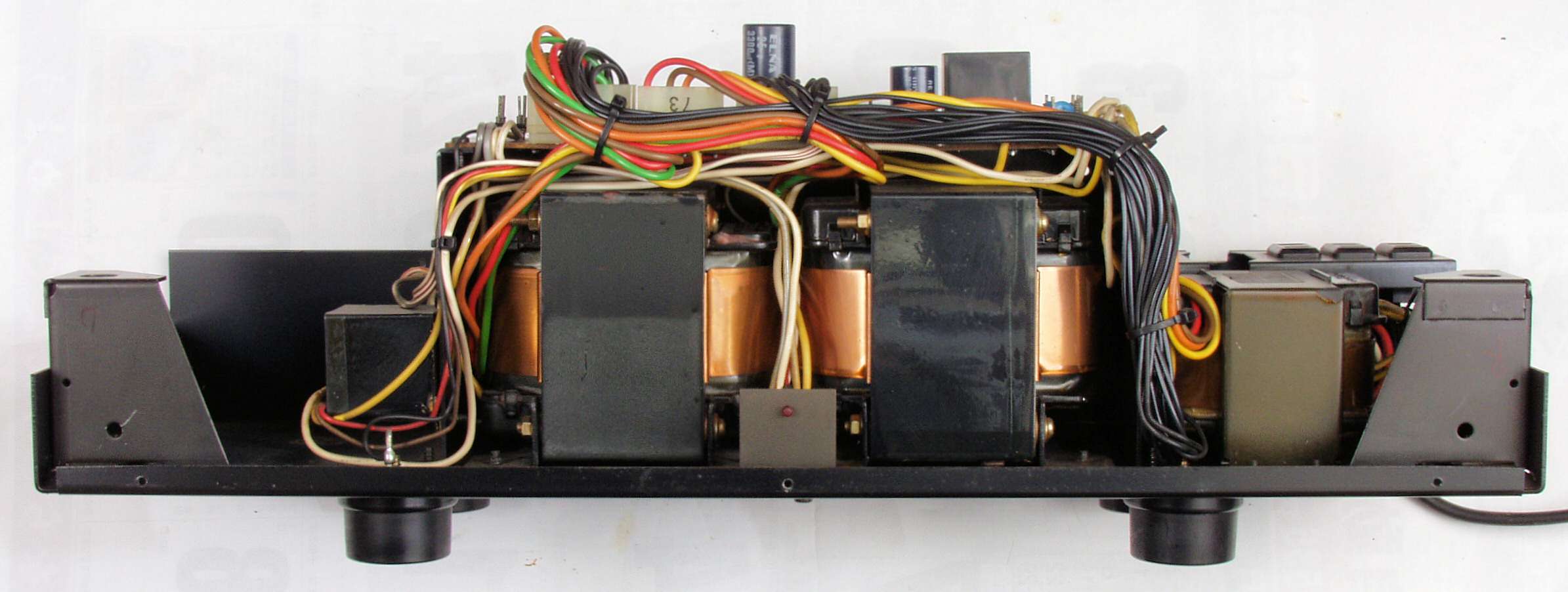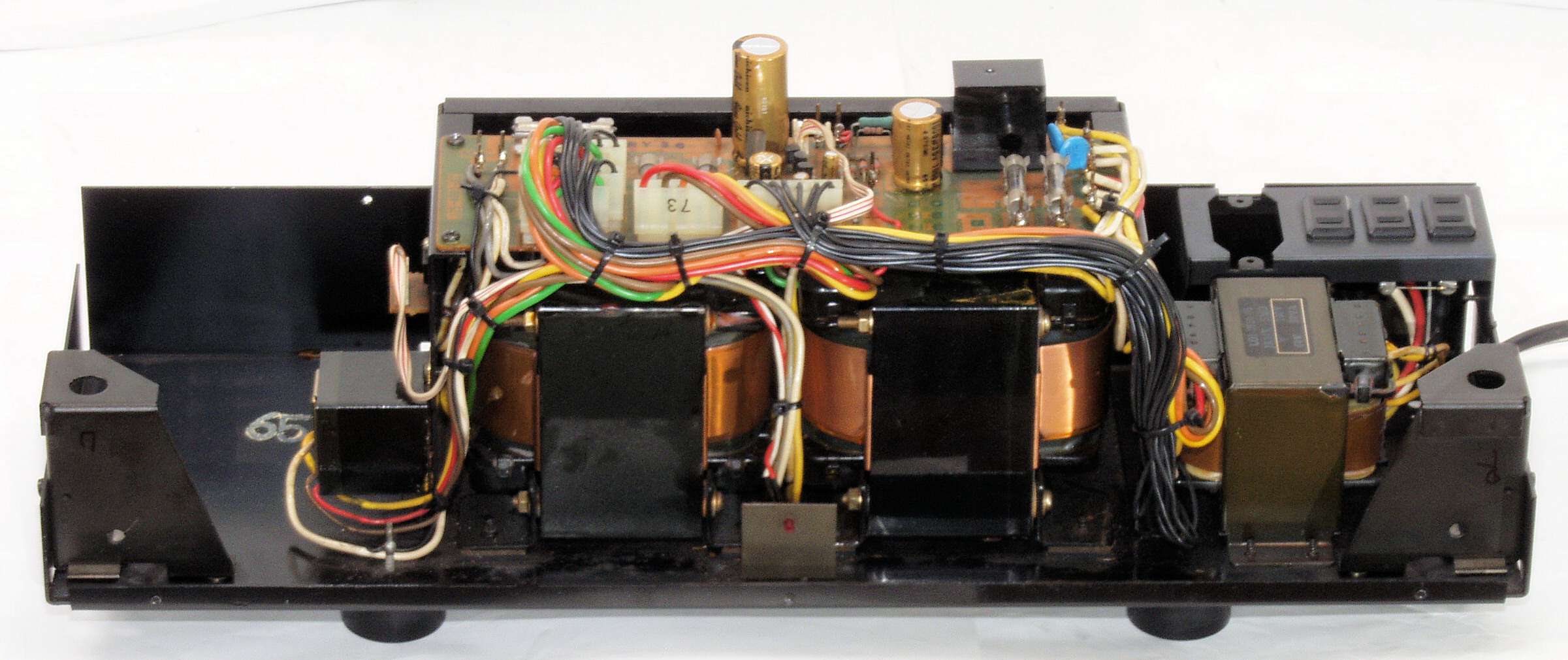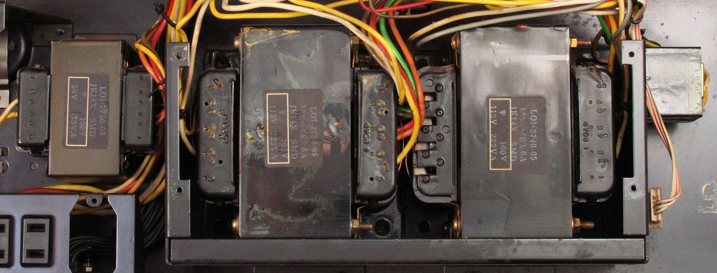 A84. 点検中 電源部・上蓋を取り上前から見る、 222VA−2個+30VA+電源SW用の4トランス使用