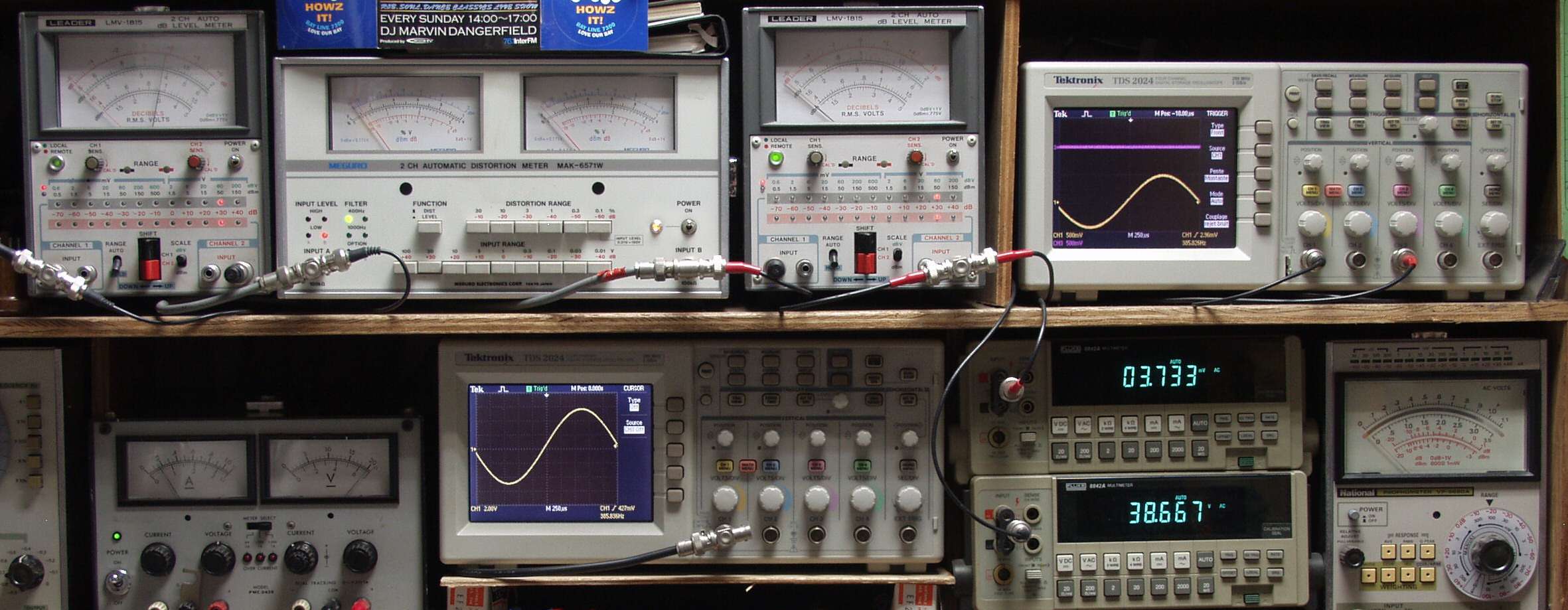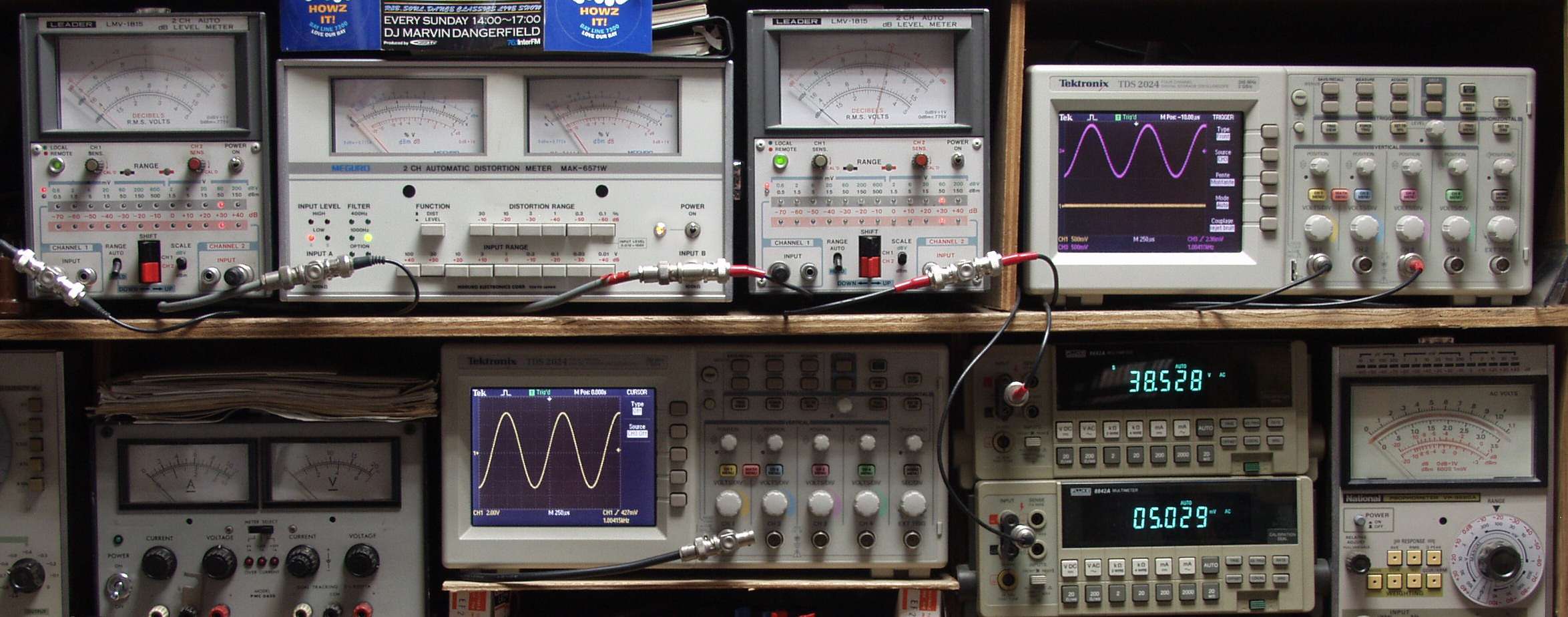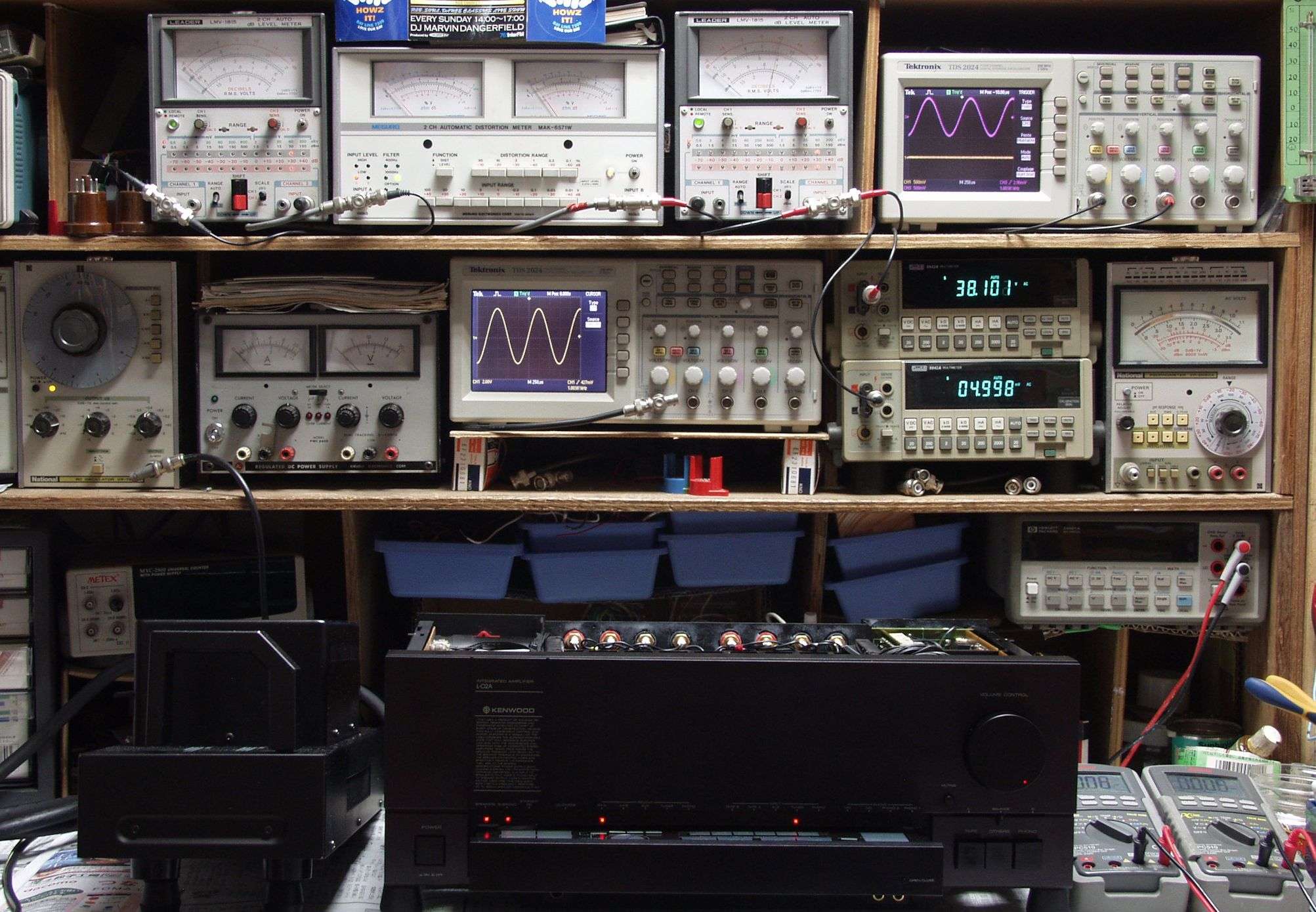 上段中左 歪み率計=出力の歪み率測定 左メータ=L出力、右メータ=R出力