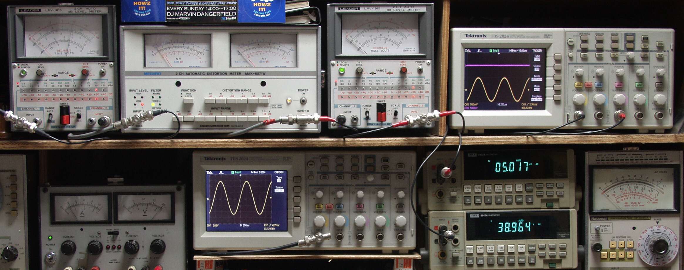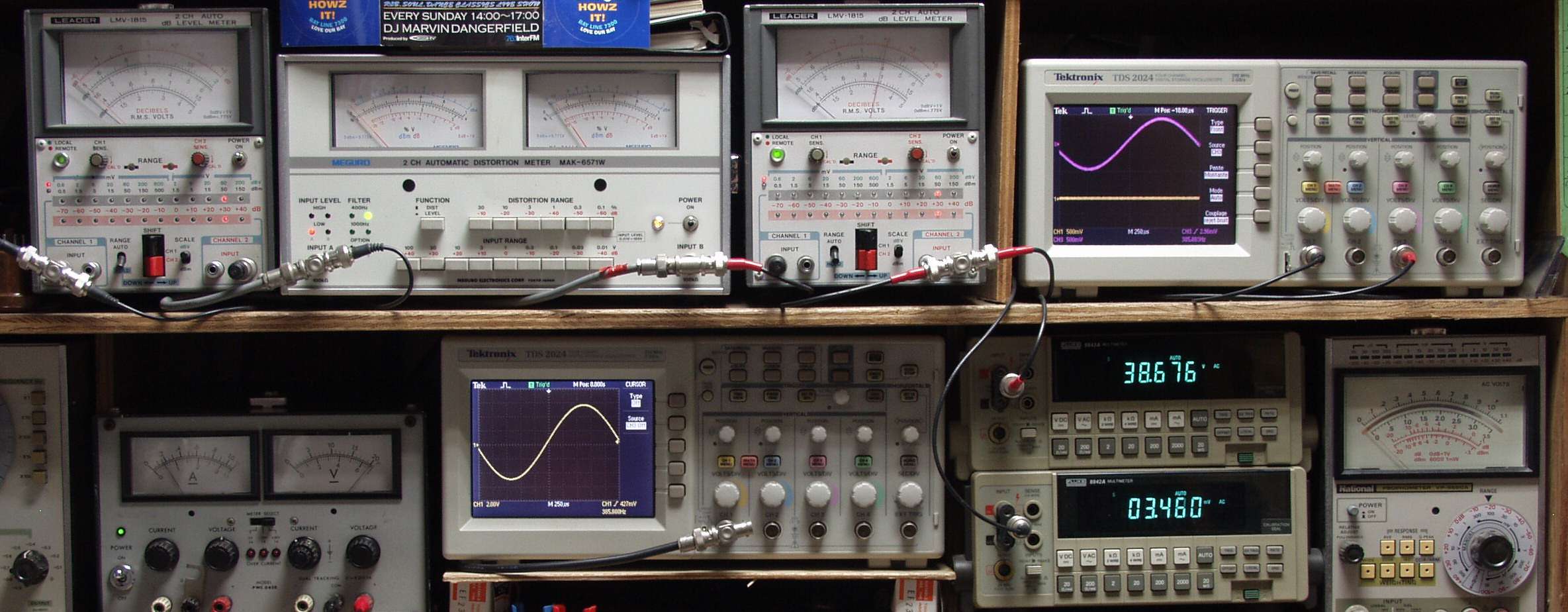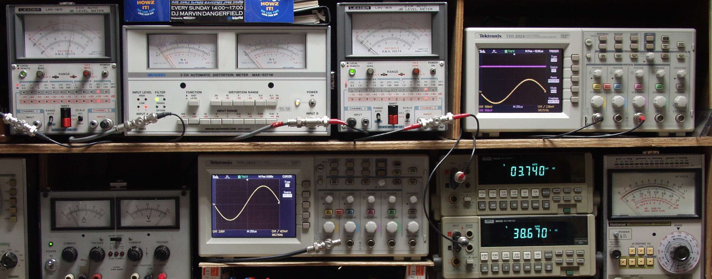 上段中左 歪み率計=出力の歪み率測定 左メータ=L出力、右メータ=R出力