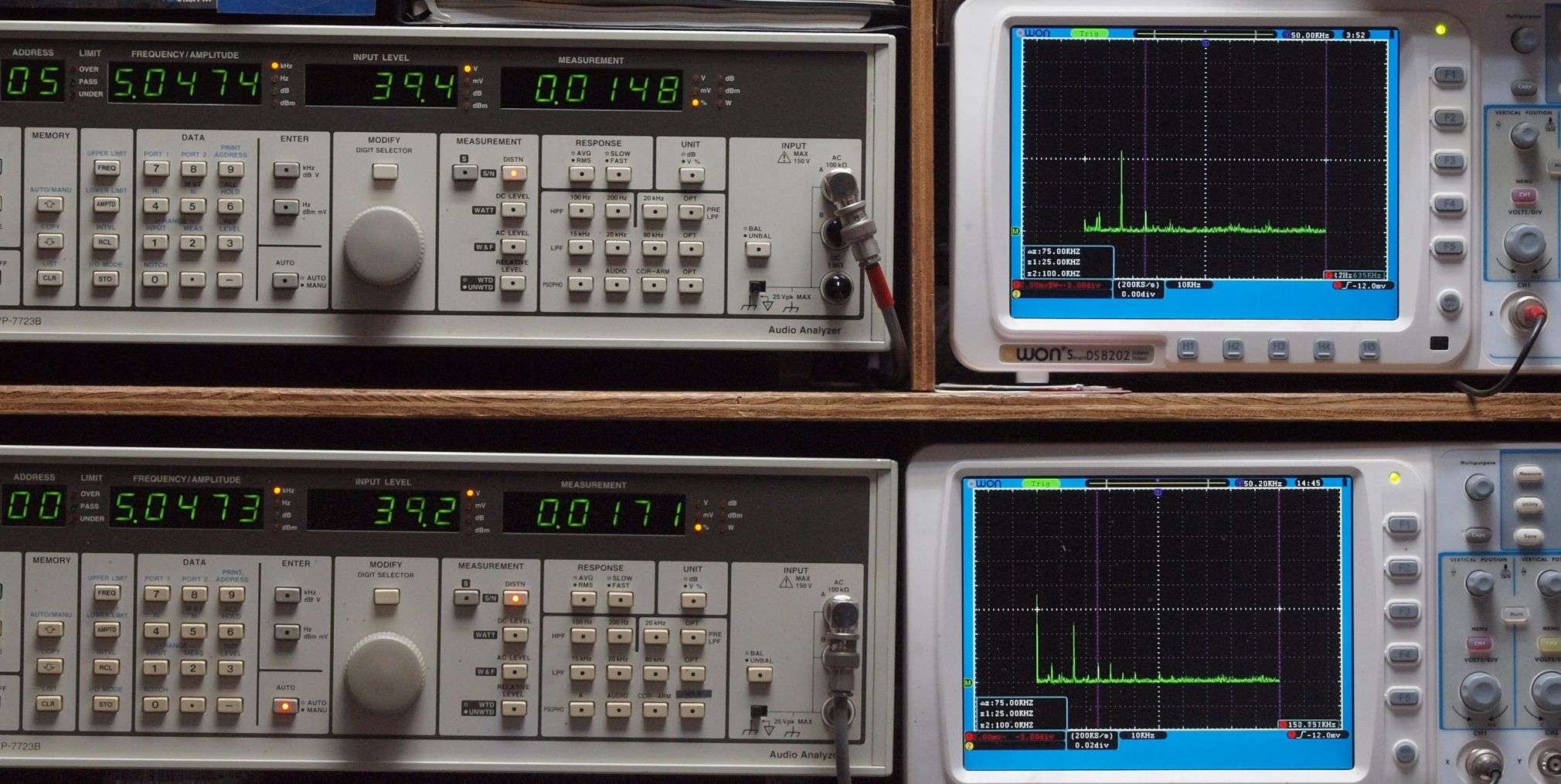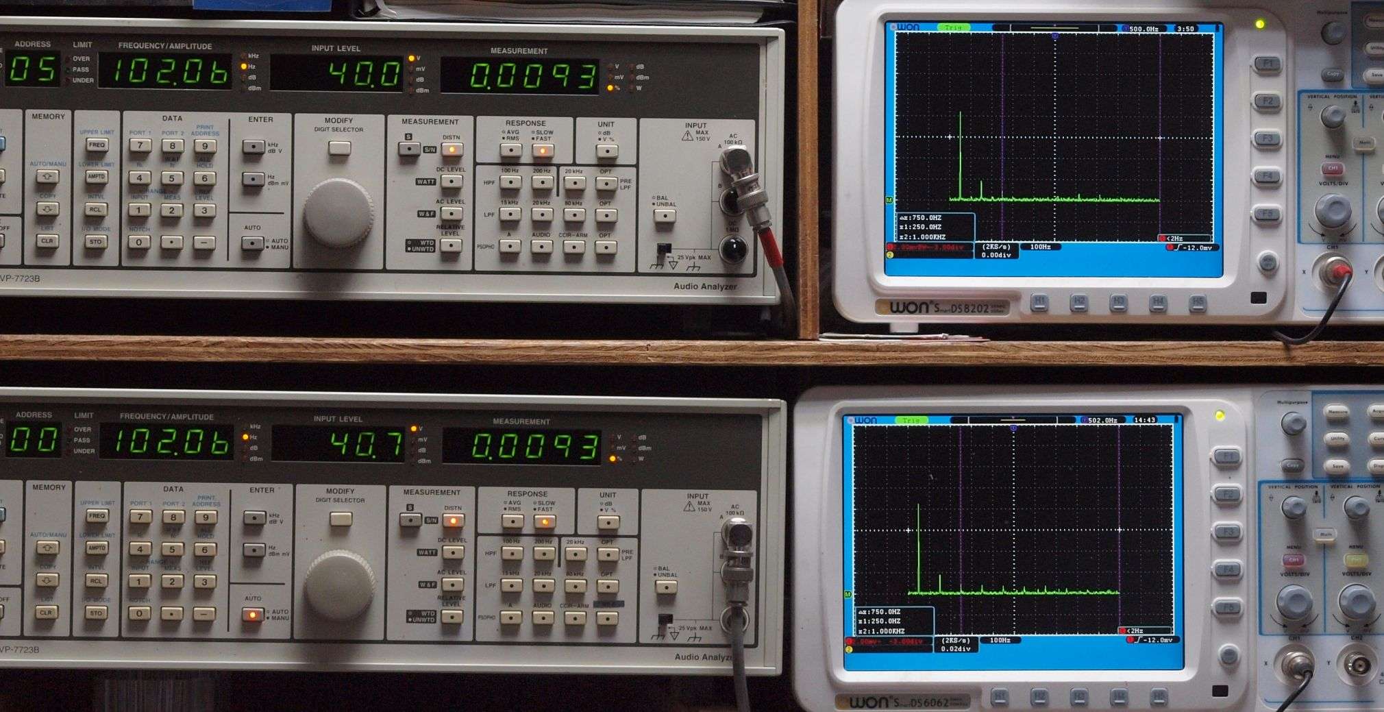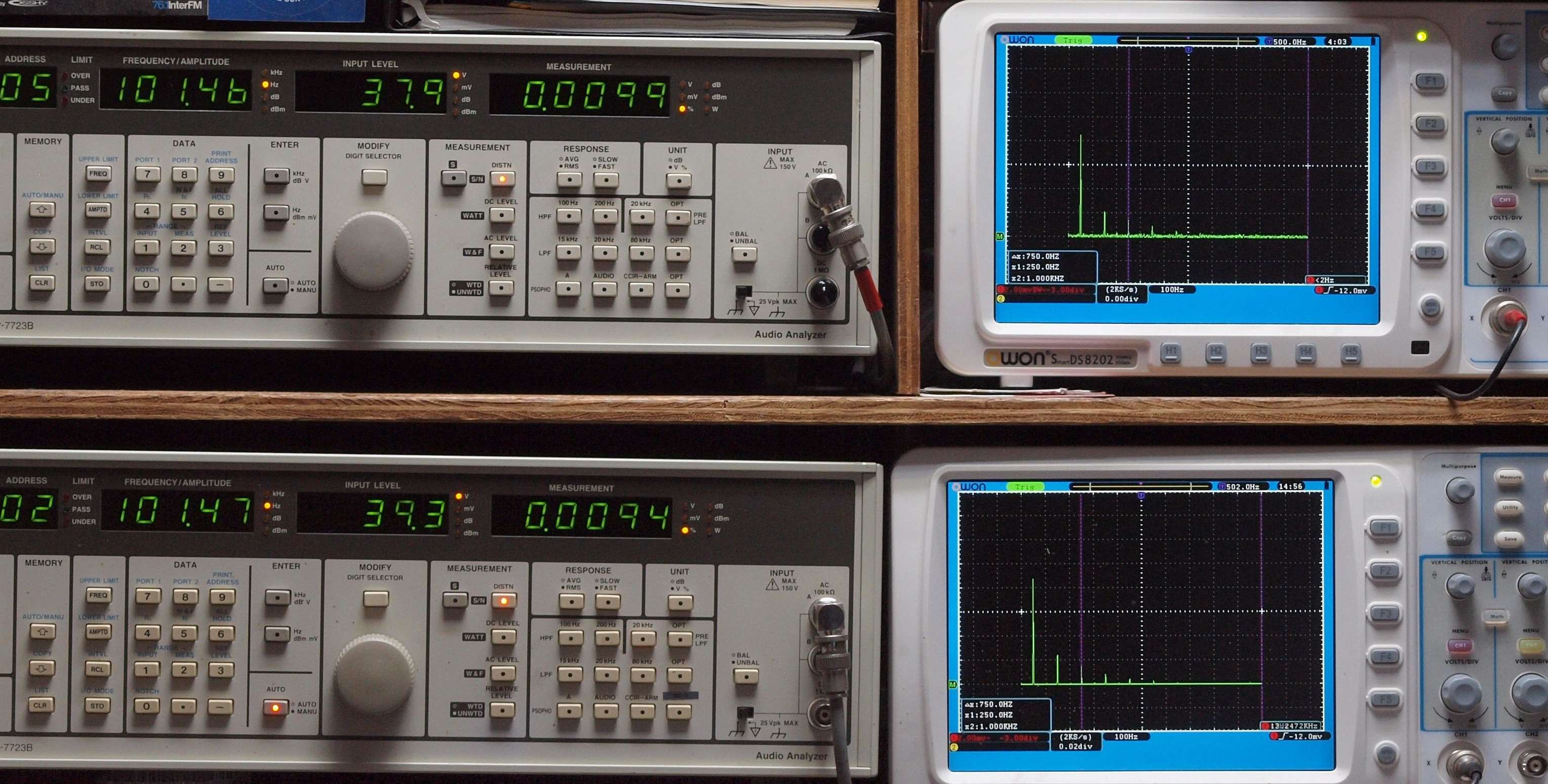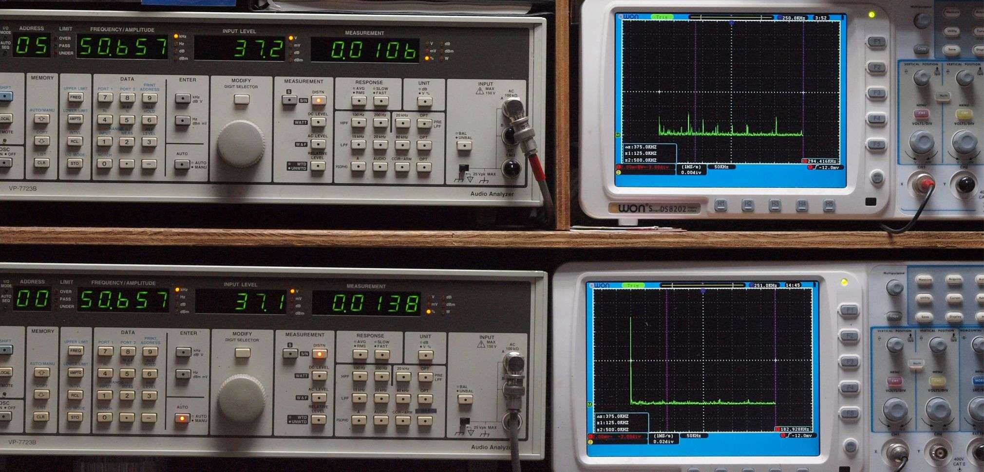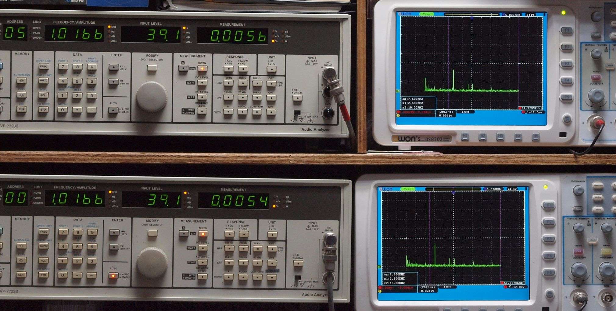上段右端 VP−7723Bの基本波除去出力を「owon SDS8202(200MHZ)」で「FFT分析」表示。