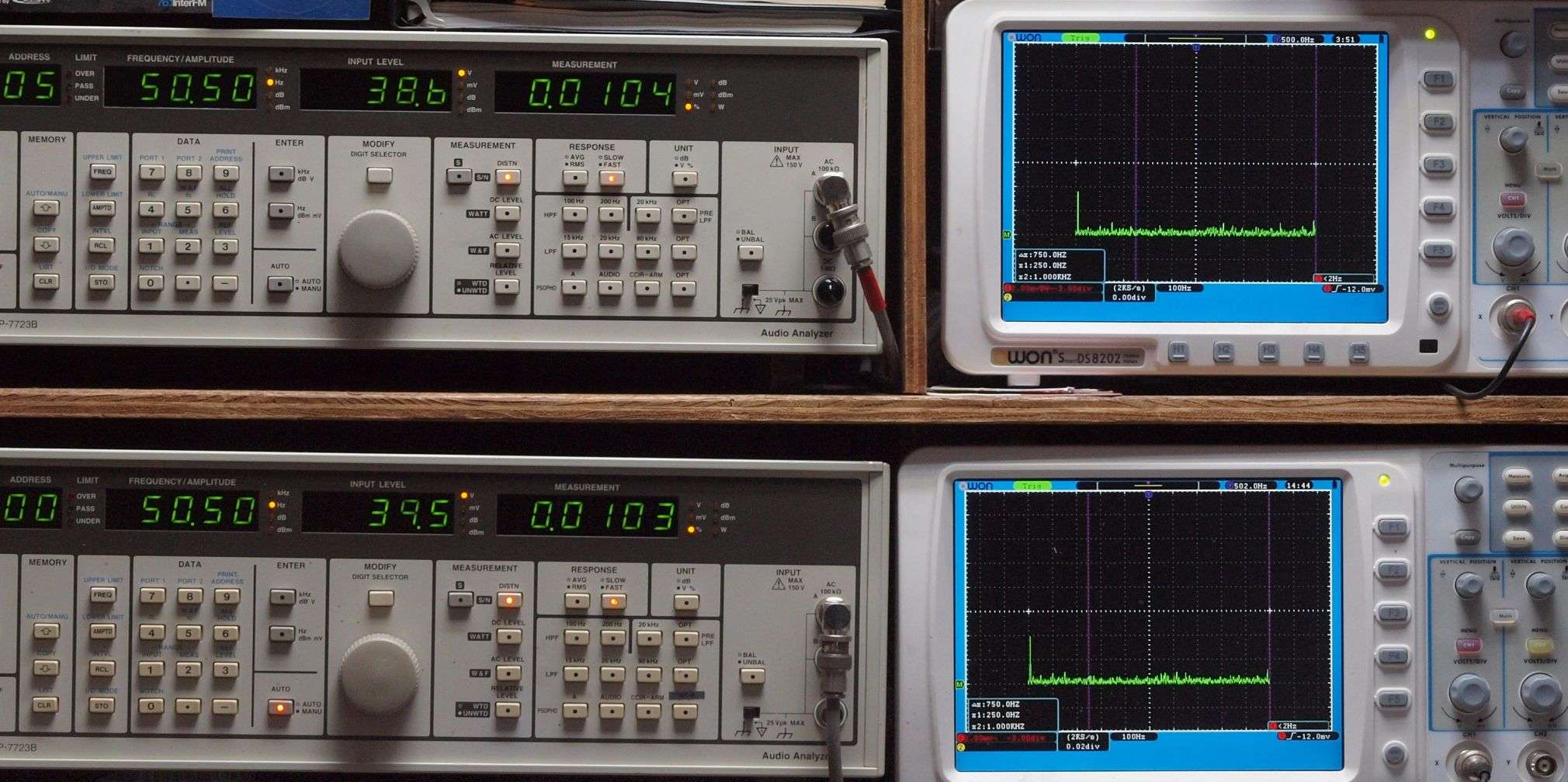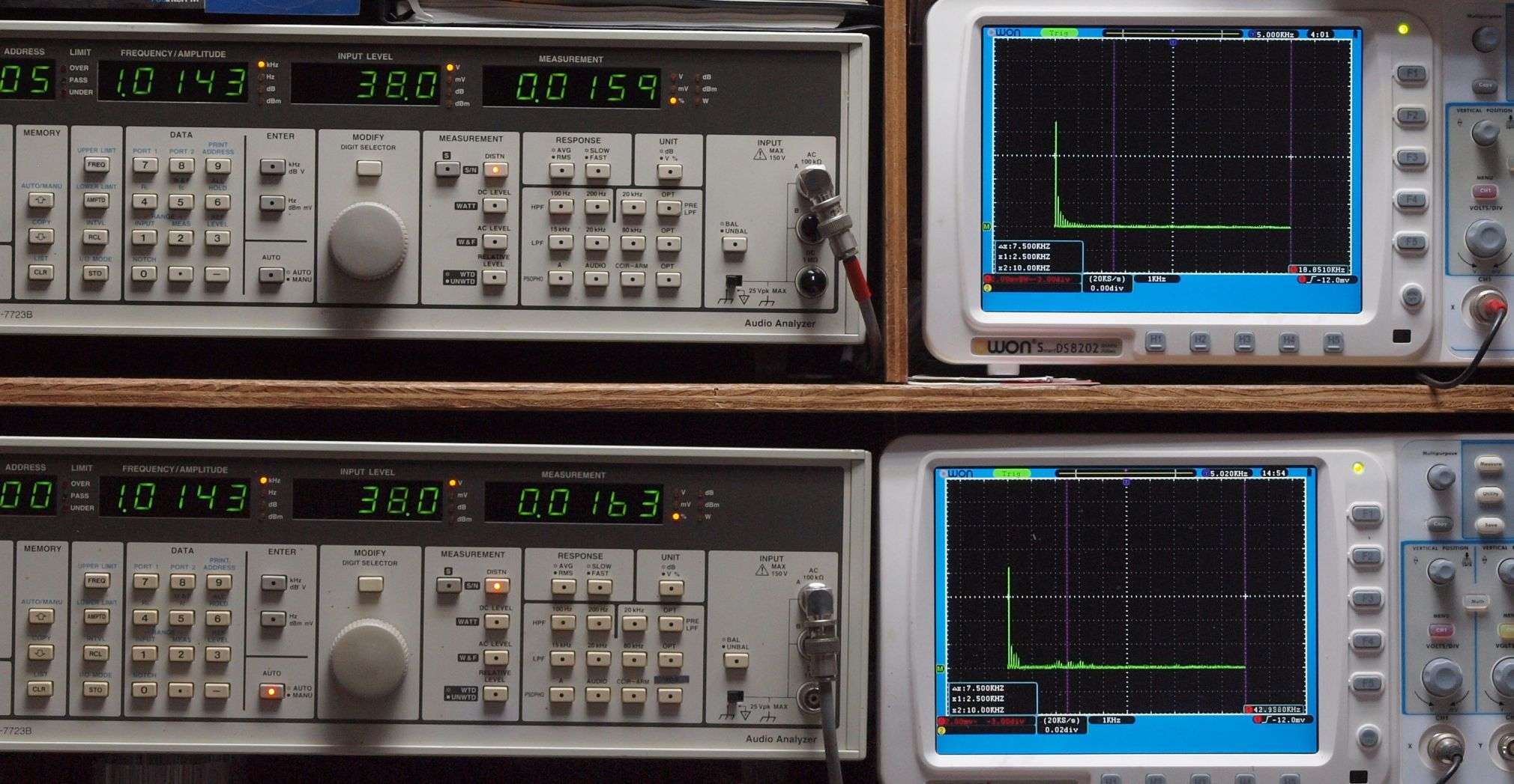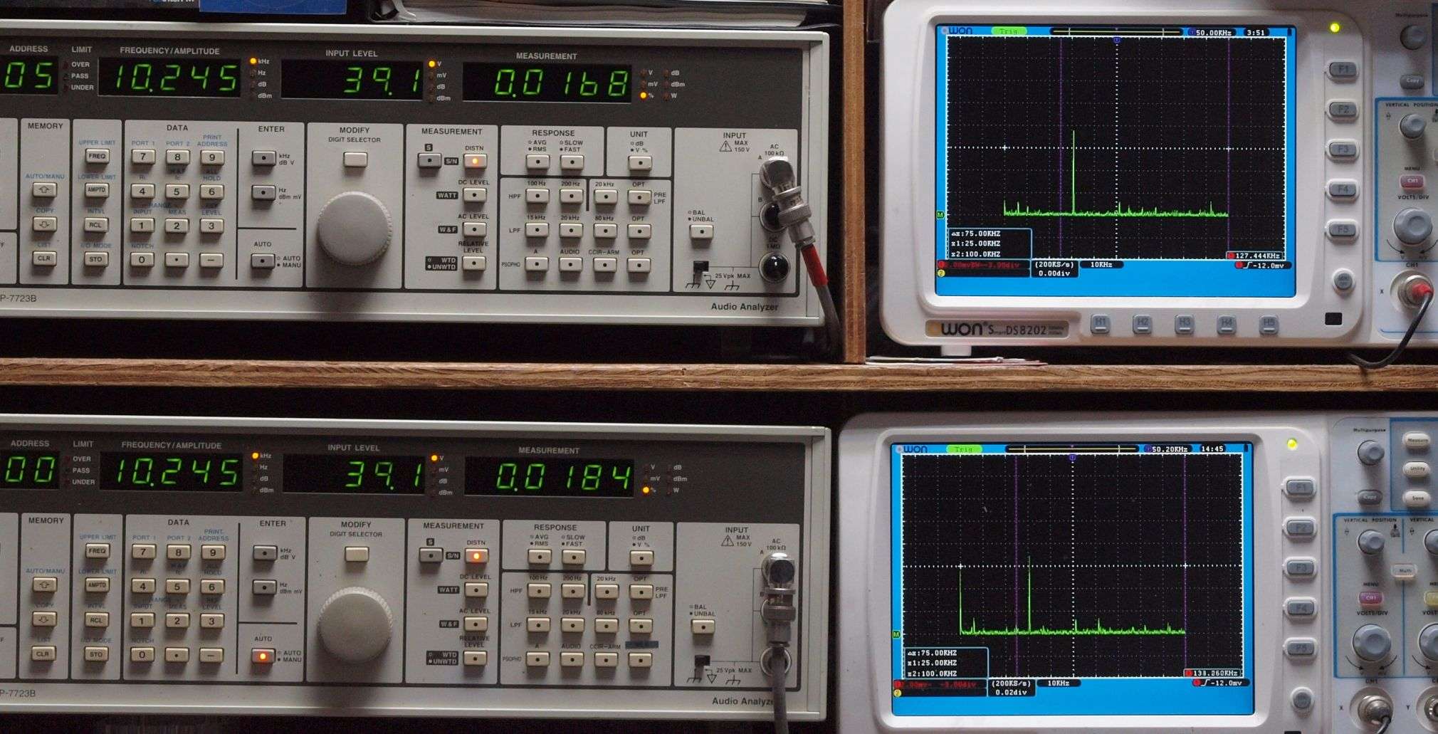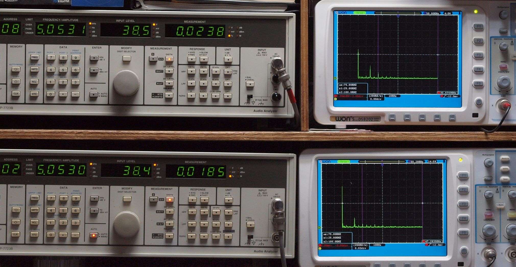 上段右端 VP−7723Bの基本波除去出力を「owon SDS8202(200MHZ)」で「FFT分析」表示。