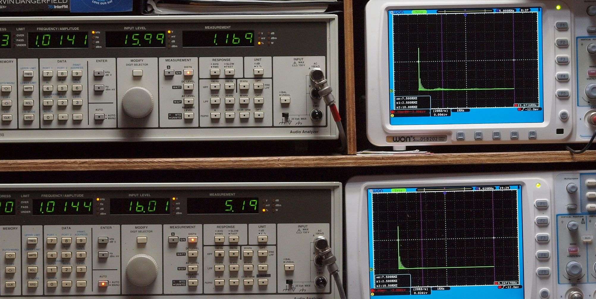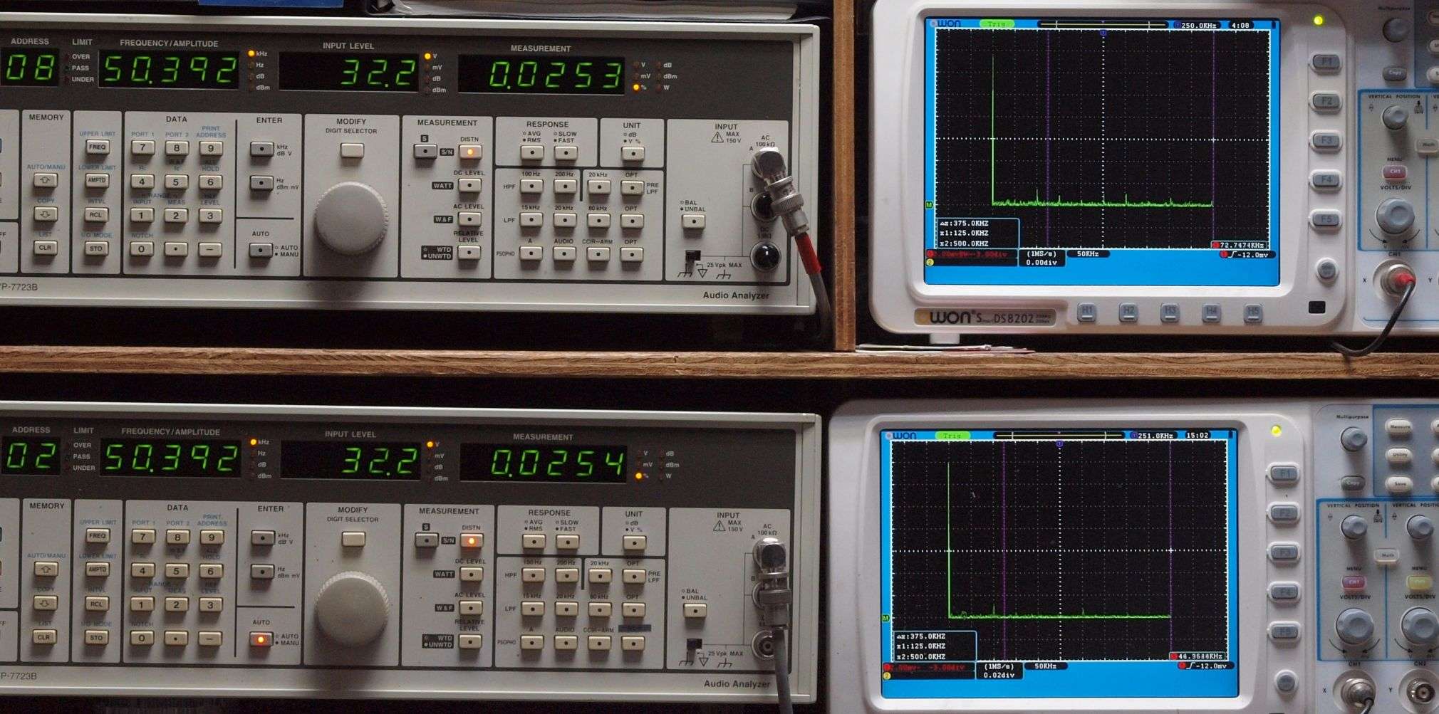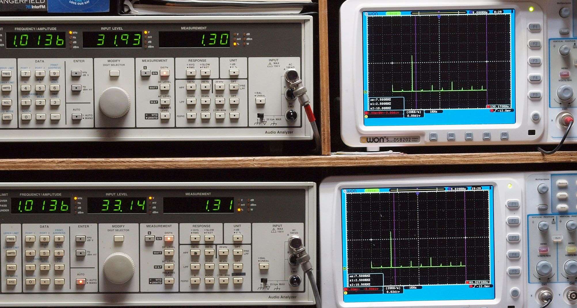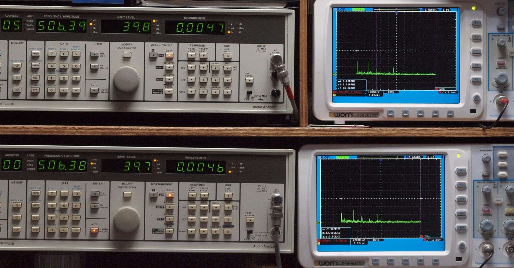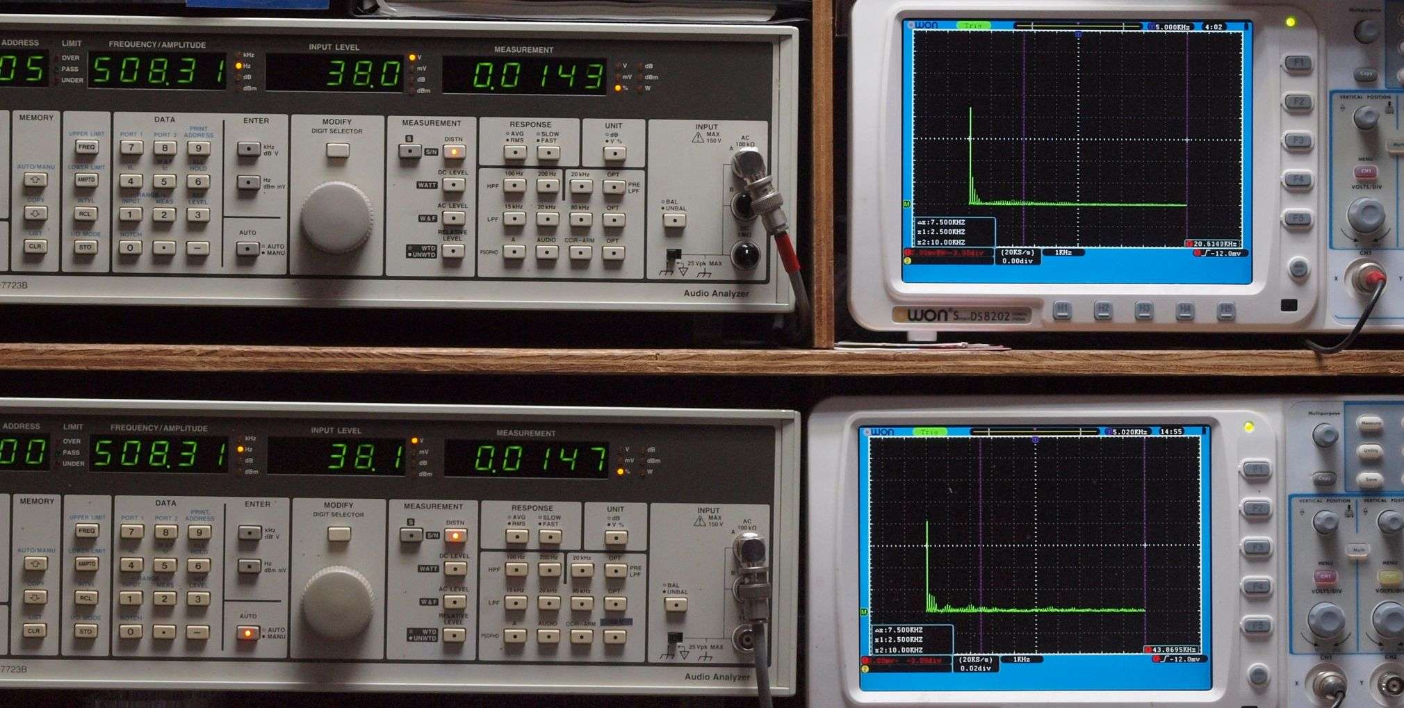 上段右端 VP−7723Bの基本波除去出力を「owon SDS8202(200MHZ)」で「FFT分析」表示。