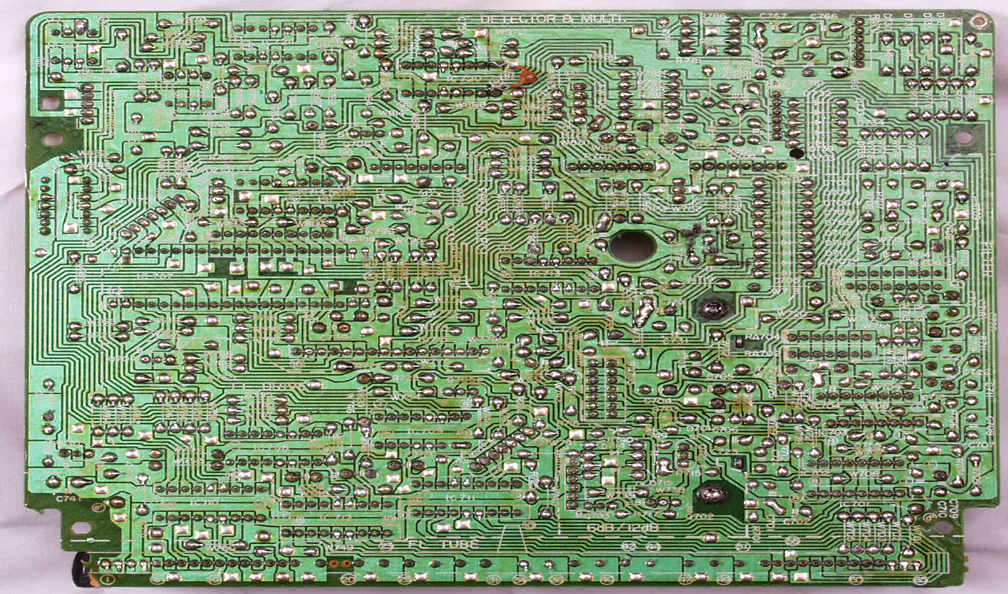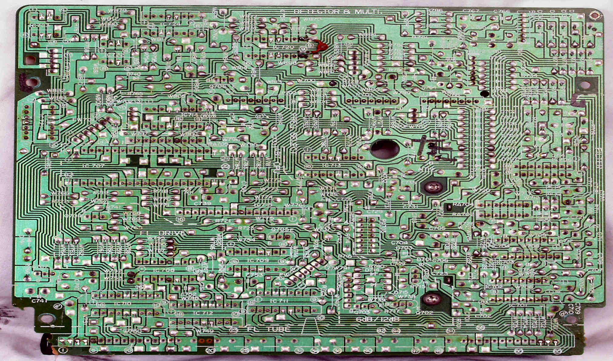 C−5D. 修理(半田補正)後 R側FL(3色蛍光表示管)基板裏。 全ての半田をやり直す。