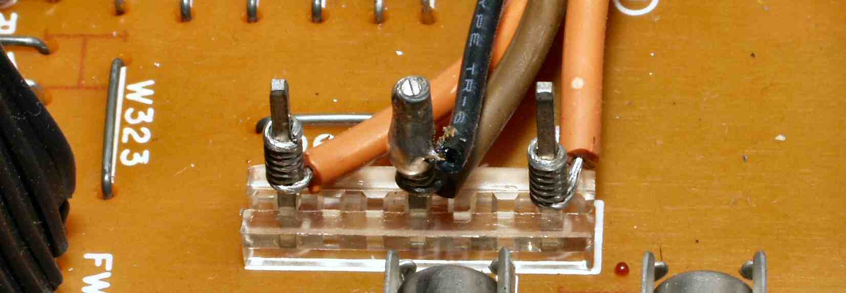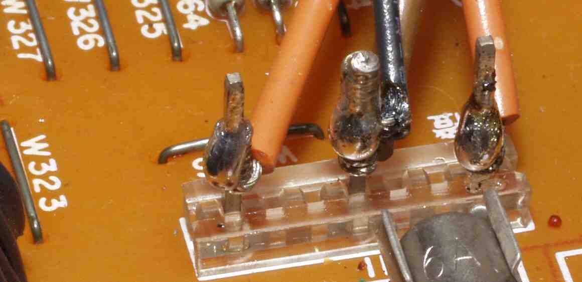 C−3J. 修理(半田補正)後 電源コンセント基板裏基板ラッピング。 半田を流し込む。