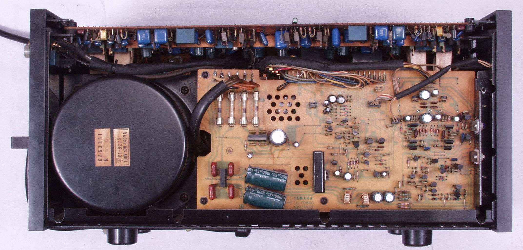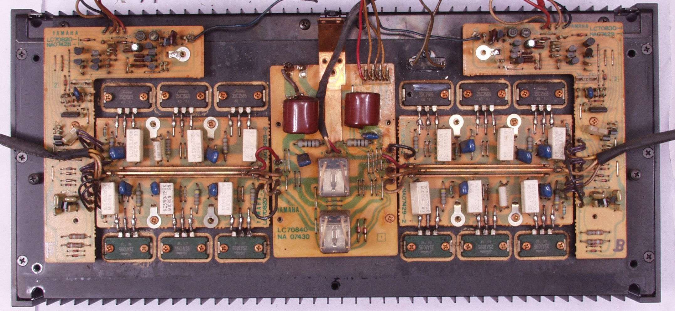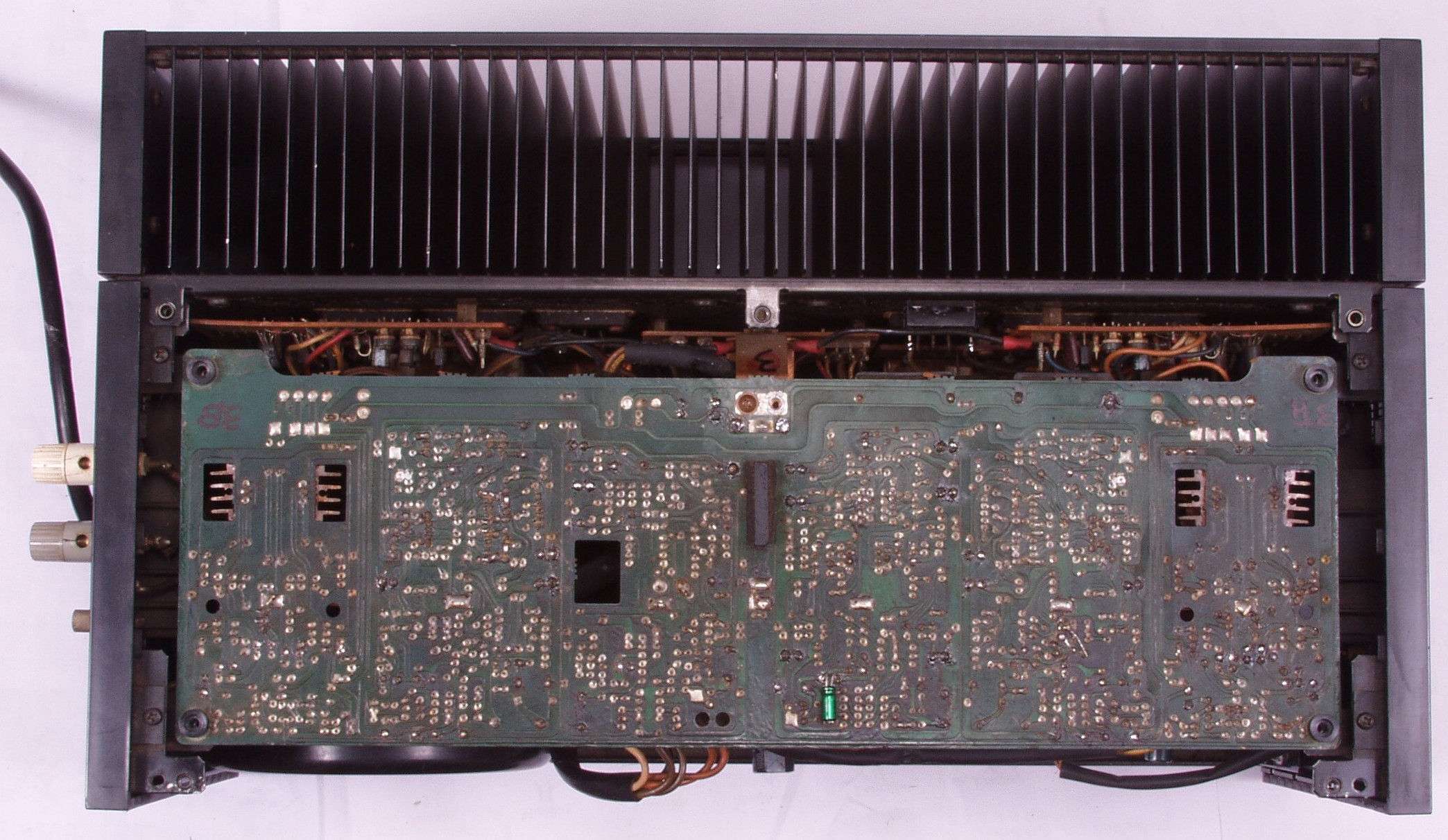 | A8C. 点検中 B側終段基板。 基板上で電源と出力ラインは銅板使用、 上・右はバイアス・リミッター基板。 | ||||||||||||||||||||||||||||||||||||||