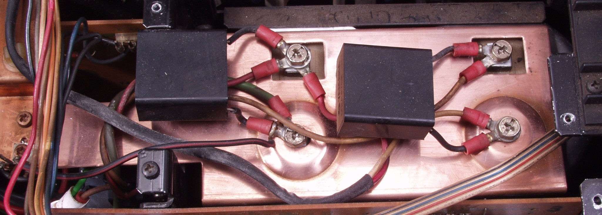 | A8B. 点検中 F側終段基板。 基板上で電源と出力ラインは銅板使用、上・左はバイアス・リミッター基板。 | ||||||||||||||||||||||||||||||||||||||