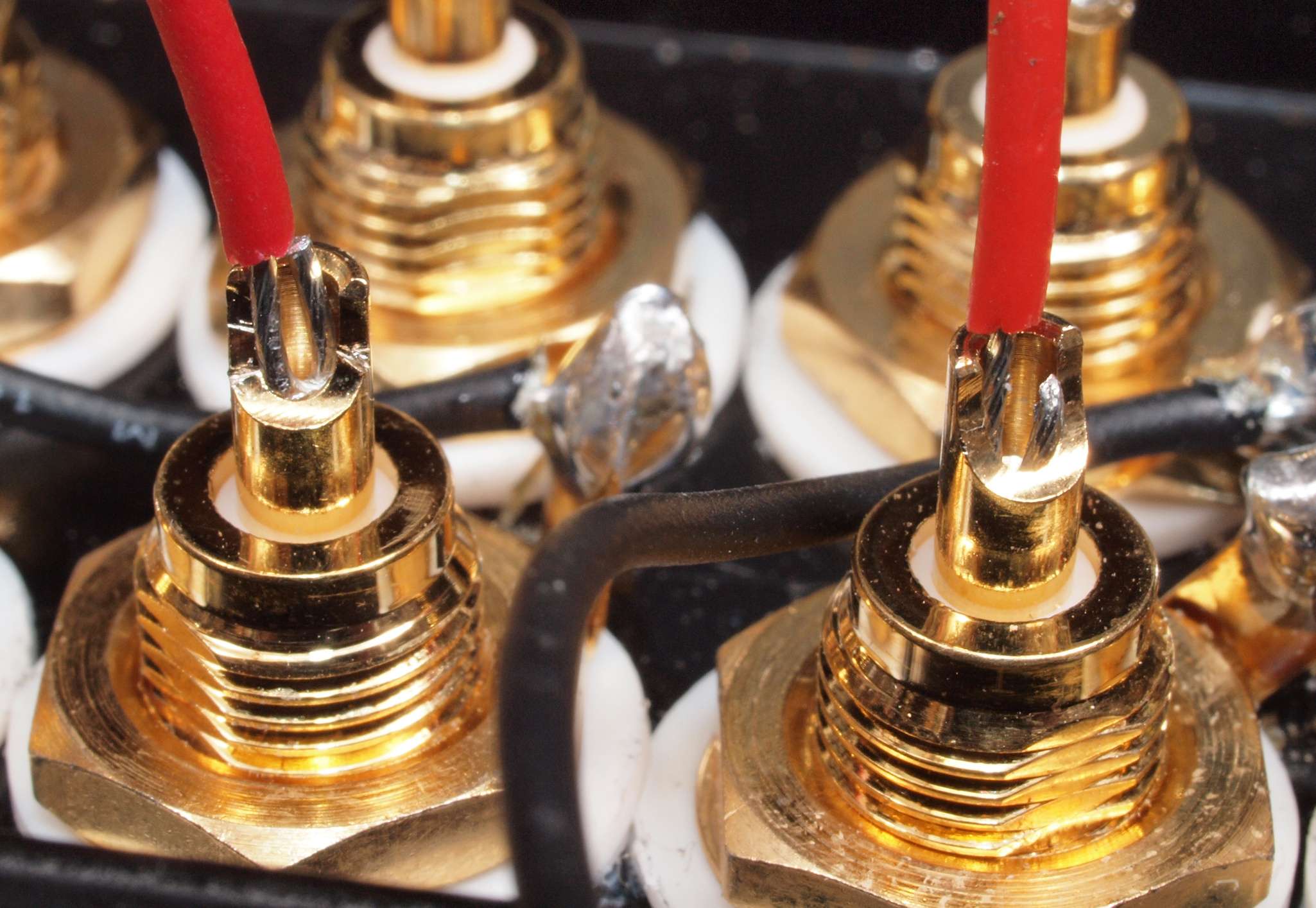 | C94. 修理(交換)中 交換RCA端子への配線、拡大。 電線の先を折り返し、端子への接触面積を広げる、ハンダは固定用。 |