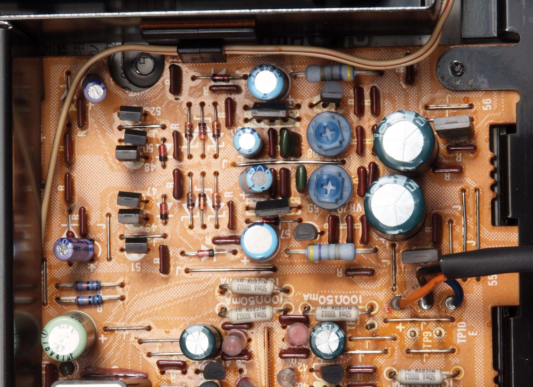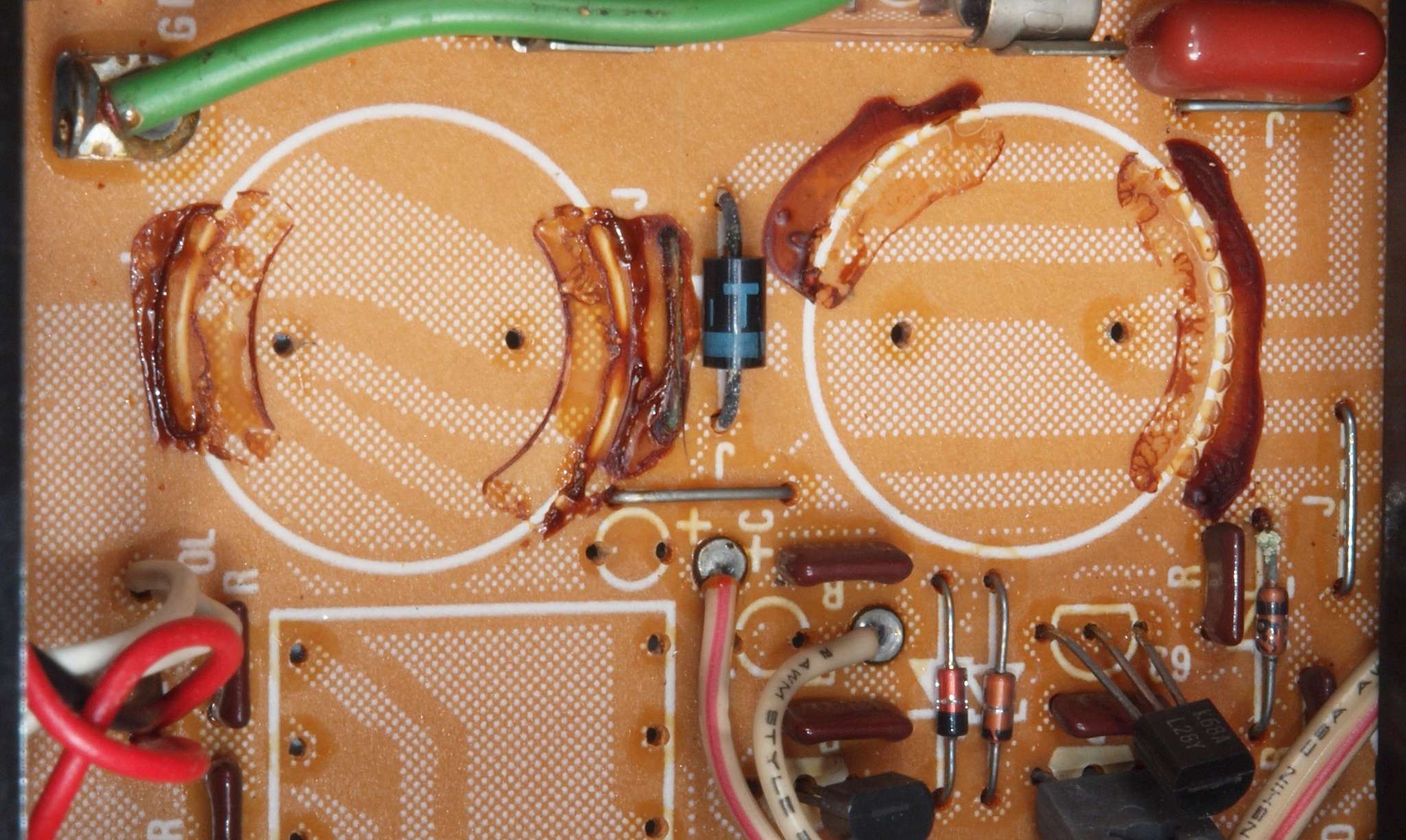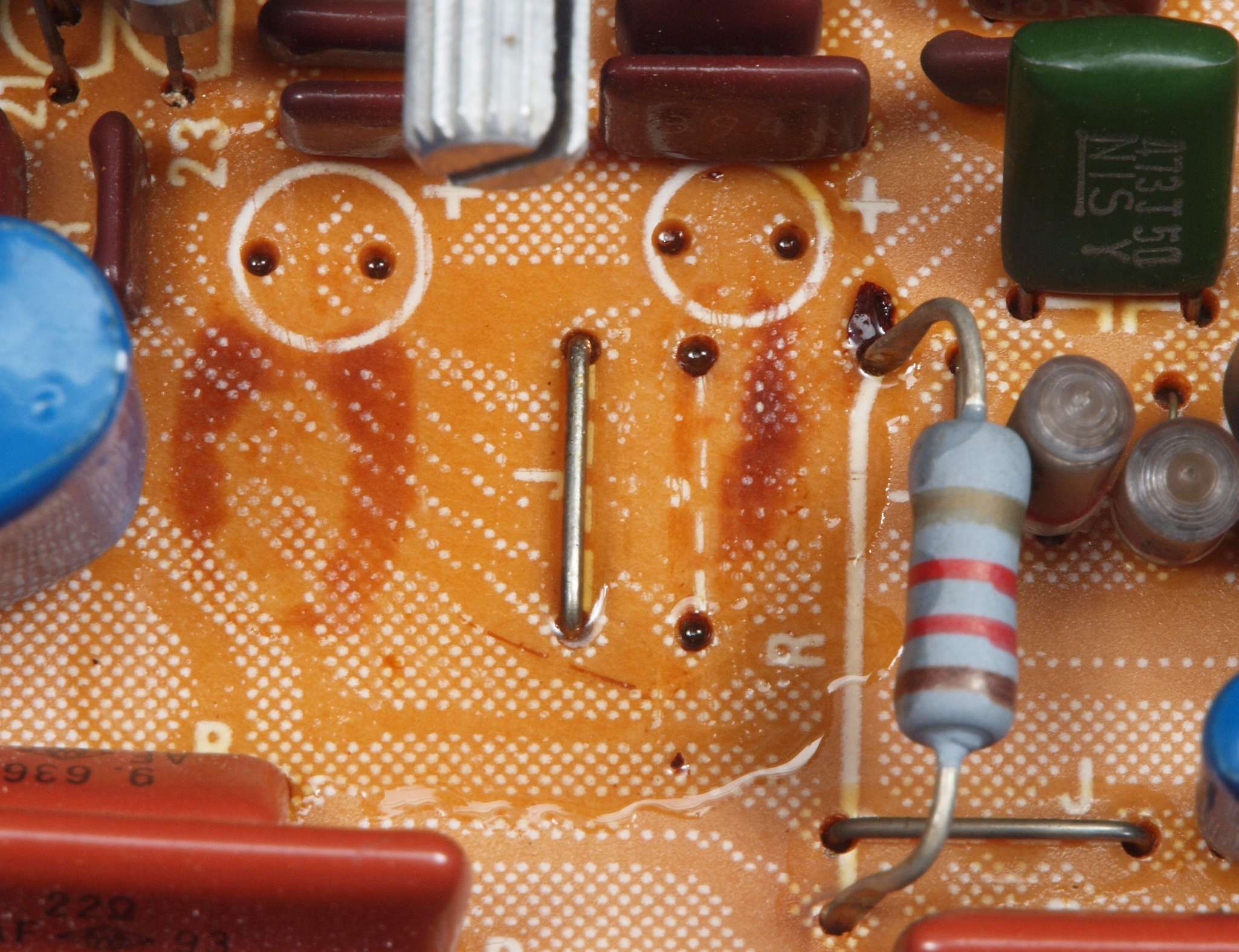 | C48. 修理前 EQ−AMP基板電解コンデンサー固定するトルエン溶媒の接着剤2。ジャンパー線を腐食する。 | ||||||||||||||||||||||||||||||||||||||||||||||