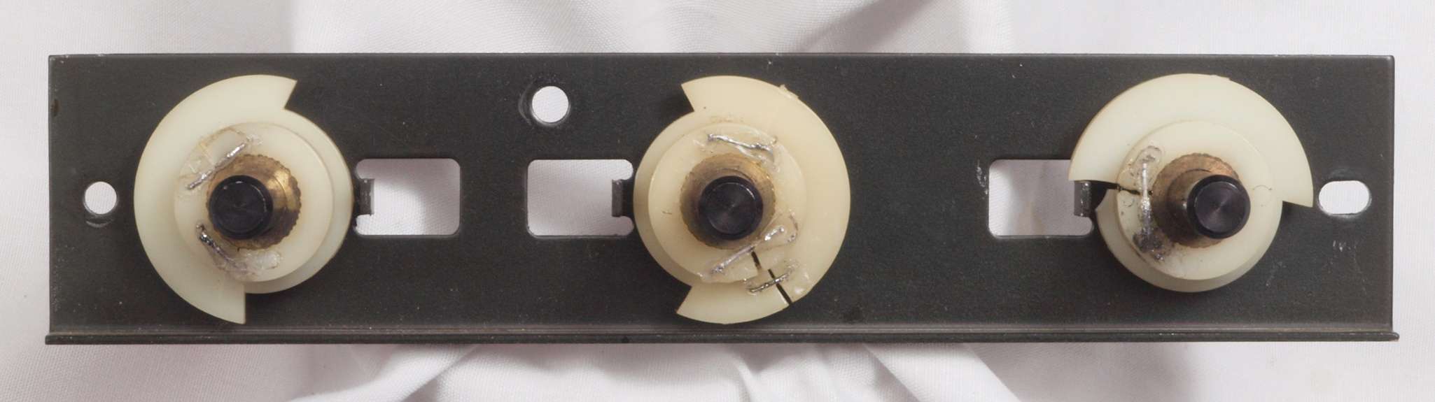 | CC3. 修理後 ボリュームストッパーがヒビ割れ。割れをスズメッキ線で防止し、更に接着する。 | ||||||||||||||||||||||||||||||||||||||||||||||
