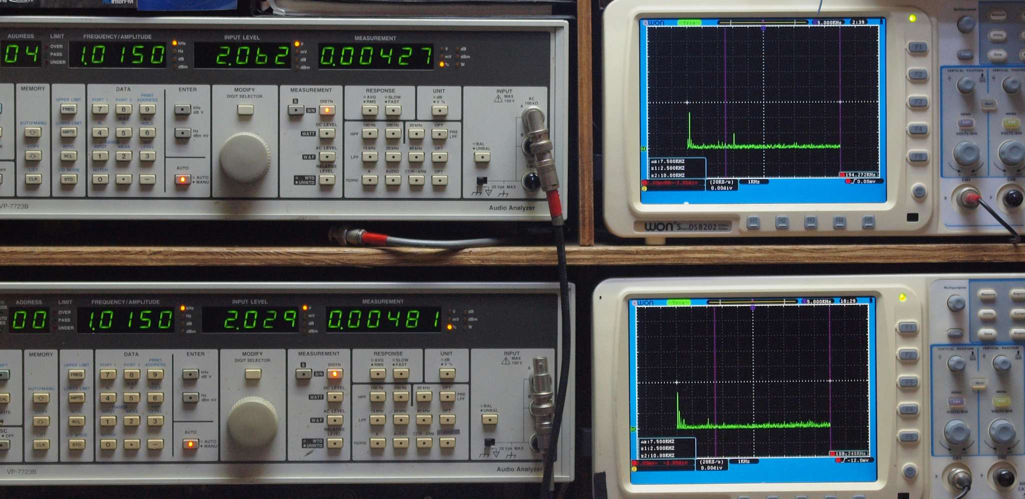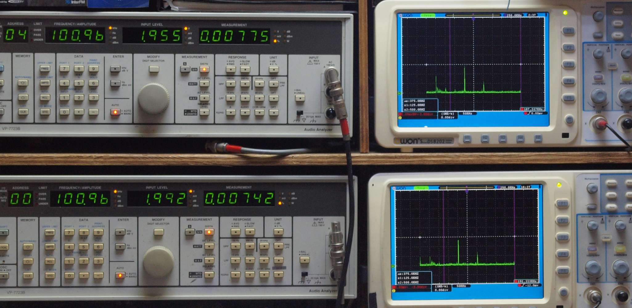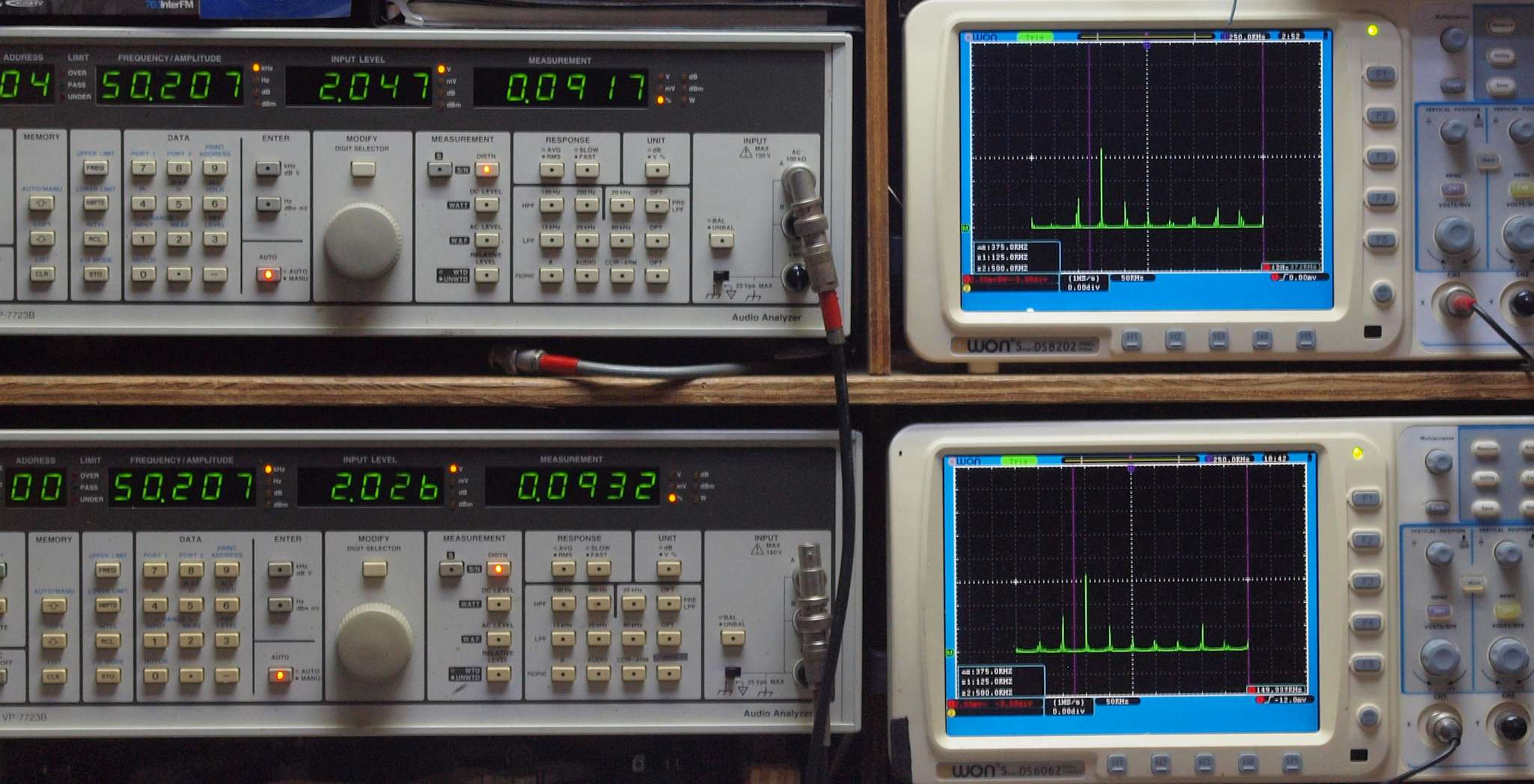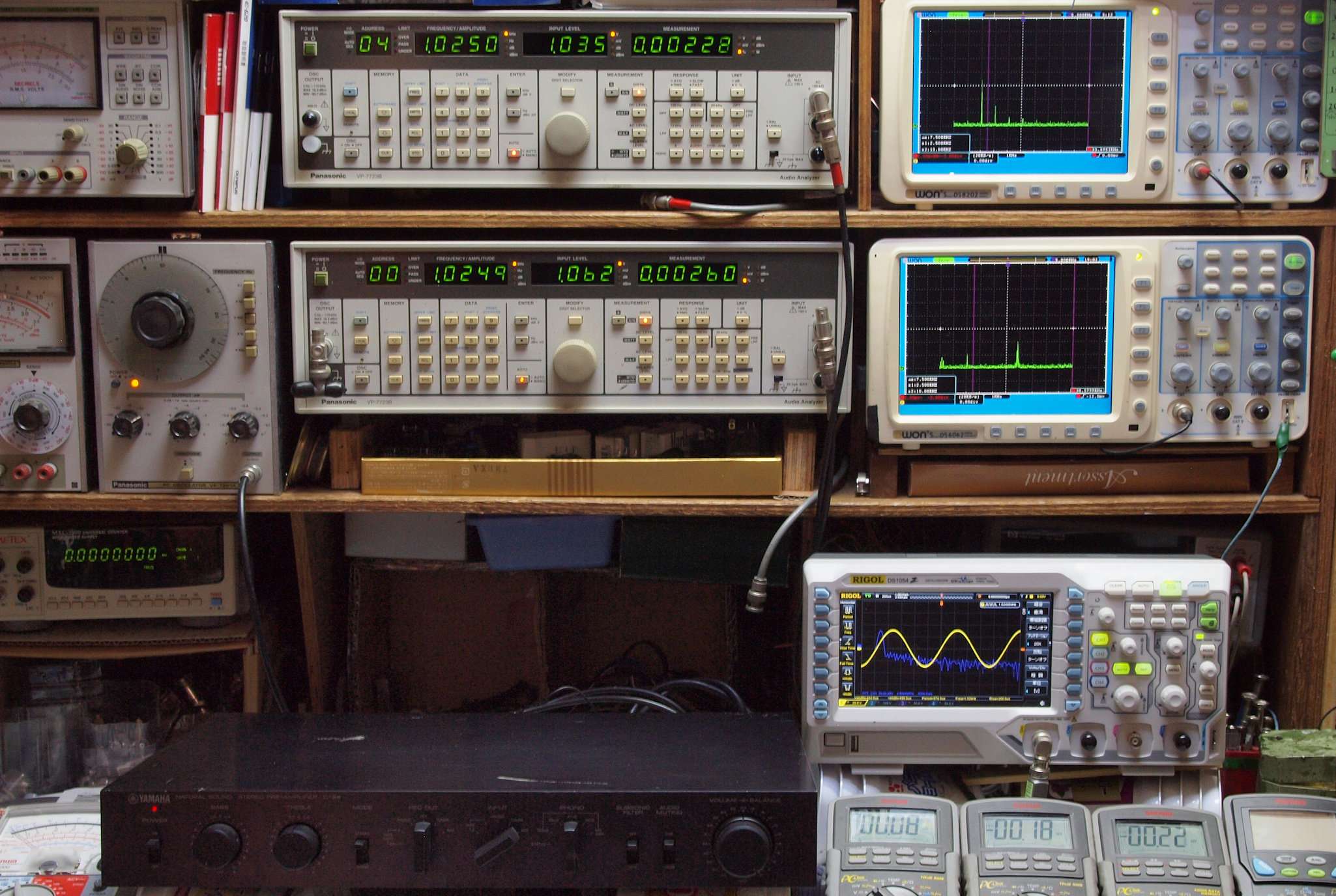 | E. 調整・測定。 画像をクリックすると、大きく(横幅2050ドット)表示されます。 E0. 出力・歪み率測定・調整。 「見方」。 上段中 右側SP出力を「Audio Analyzer Panasonic VP−7723B」により測定。 表示LED、 左端=メモリーNo、 中左=周波数測定、 中右=出力電圧測定、 右端=歪み率測定。 上段右端 VP−7723Bの基本波除去出力を「owon SDS8202(200MHZ)」で「FFT分析」表示。 下段中 左側SP出力を「Audio Analyzer Panasonic VP−7723B」により測定。 表示LED、 左端=メモリーNo、 中左=周波数測定、 中右=出力電圧測定、 右端=歪み率測定。 下段右端 VP−7723Bの基本波除去出力を「owon SDS6062(200MHZ)」で「FFT分析」表示。 下段左端 オーディオ発振器 VP−7201A より50Hz〜100kHzの信号を出し(歪み率=約0.003%)、ATT+分配器を通し、AMPに入力。 よって、ダイアル設定出力レベルより低くなります。測定機器の仕様や整備の様子はこちら、「VP−7723B」「VP−7201A」。 FFT画面の見方はこちら。 |