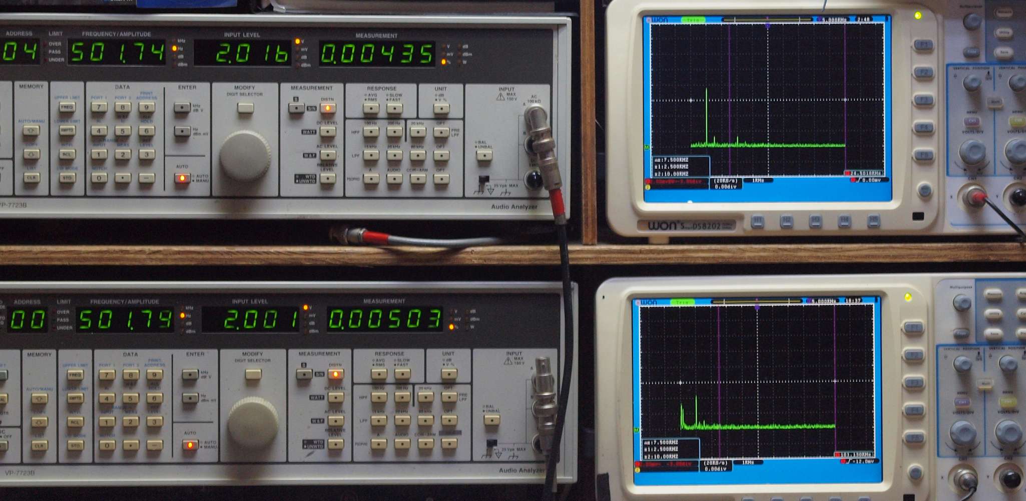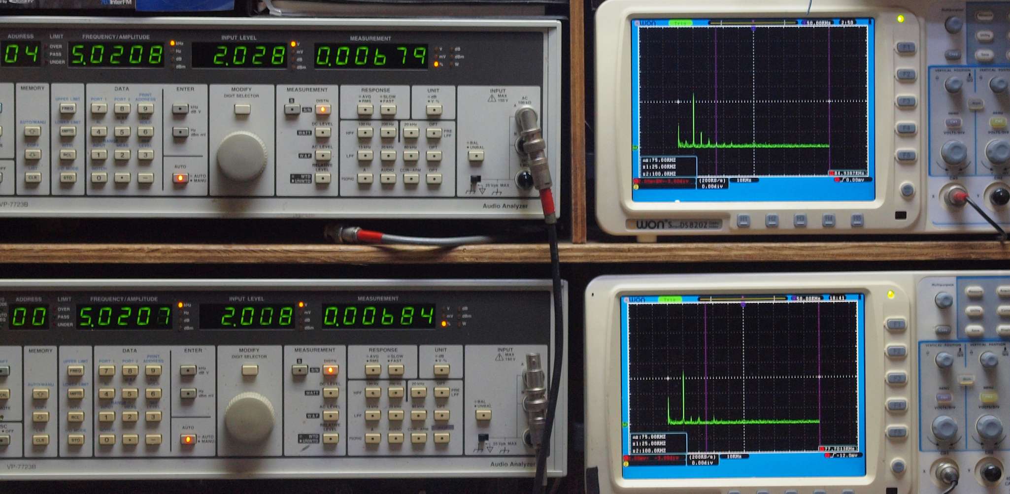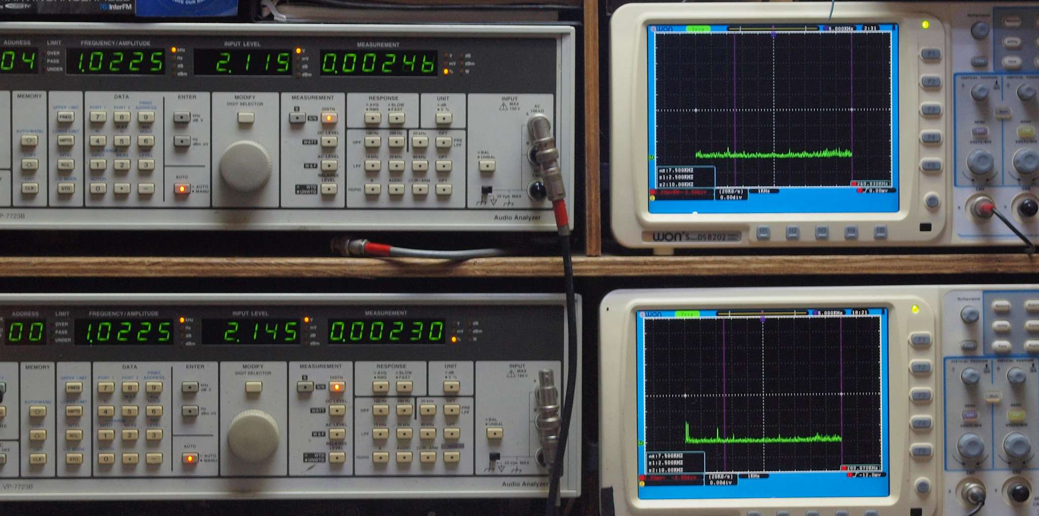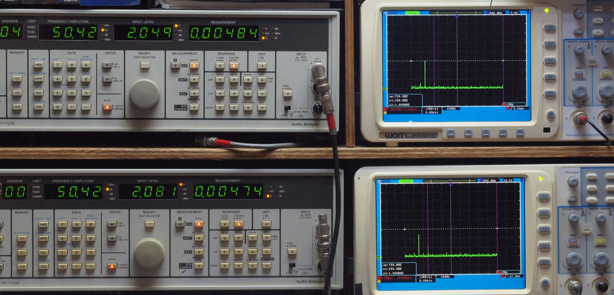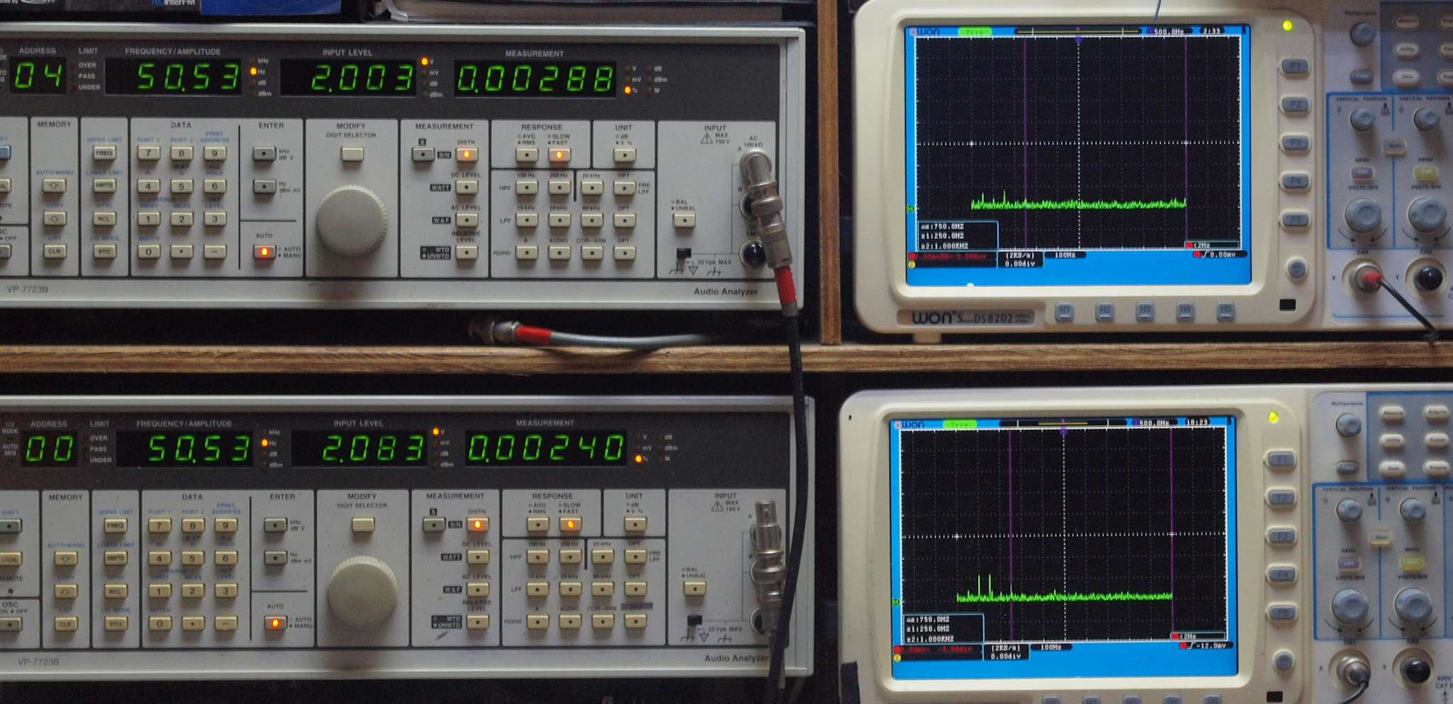 | E. 調整・測定。 画像をクリックすると、大きく(横幅2050ドット)表示されます。 E0. 出力・歪み率測定・調整。 「見方」。 上段中 右側SP出力を「Audio Analyzer Panasonic VP−7723B」により測定。 表示LED、 左端=メモリーNo、 中左=周波数測定、 中右=出力電圧測定、 右端=歪み率測定。 上段右端 VP−7723Bの基本波除去出力を「owon SDS8202(200MHZ)」で「FFT分析」表示。 下段中 左側SP出力を「Audio Analyzer Panasonic VP−7723B」により測定。 表示LED、 左端=メモリーNo、 中左=周波数測定、 中右=出力電圧測定、 右端=歪み率測定。 下段右端 VP−7723Bの基本波除去出力を「owon SDS6062(200MHZ)」で「FFT分析」表示。 下段左端 オーディオ発振器 VP−7201A より50Hz〜100kHzの信号を出し(歪み率=約0.003%)、ATT+分配器を通し、AMPに入力。 よって、ダイアル設定出力レベルより低くなります。測定機器の仕様や整備の様子はこちら、「VP−7723B」「VP−7201A」。 FFT画面の見方はこちら。 |