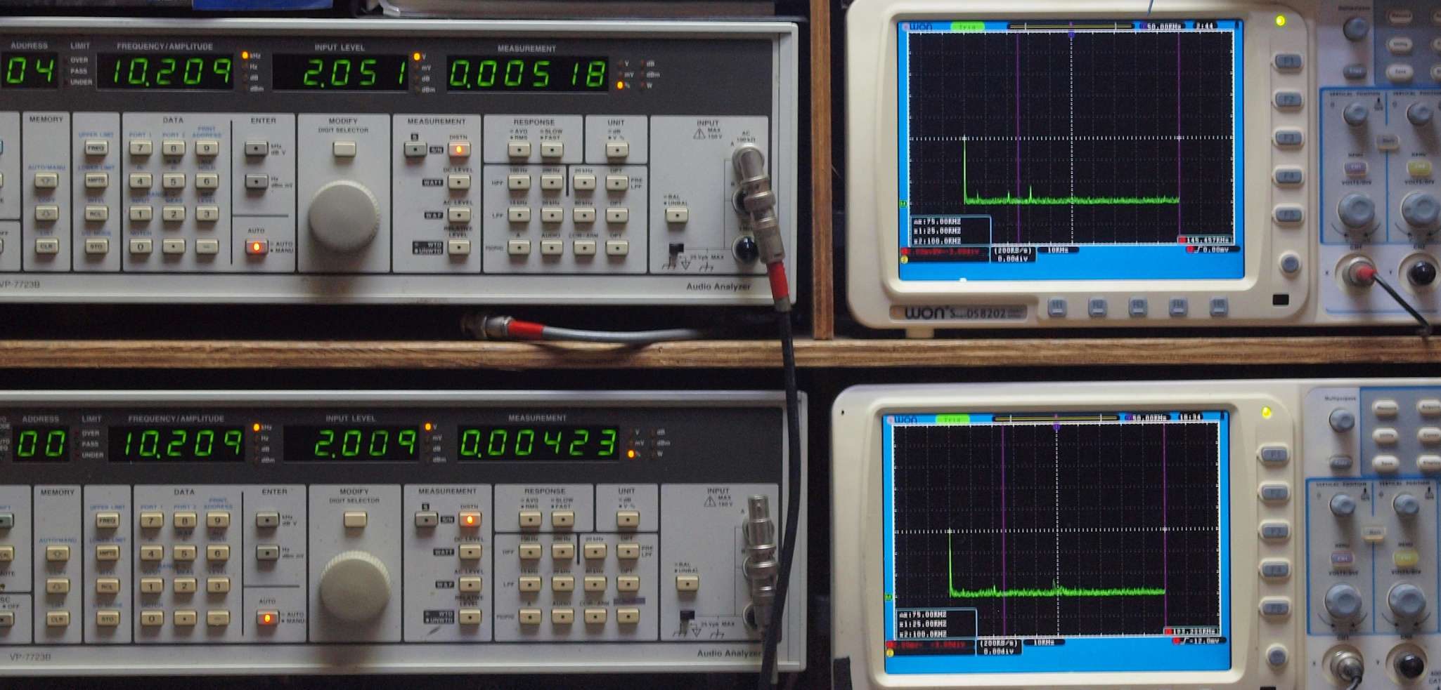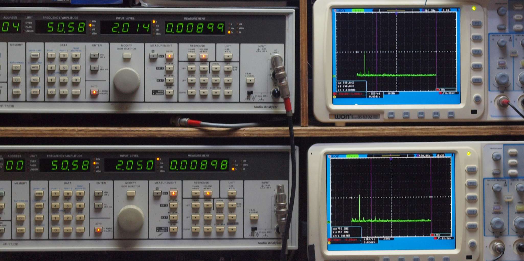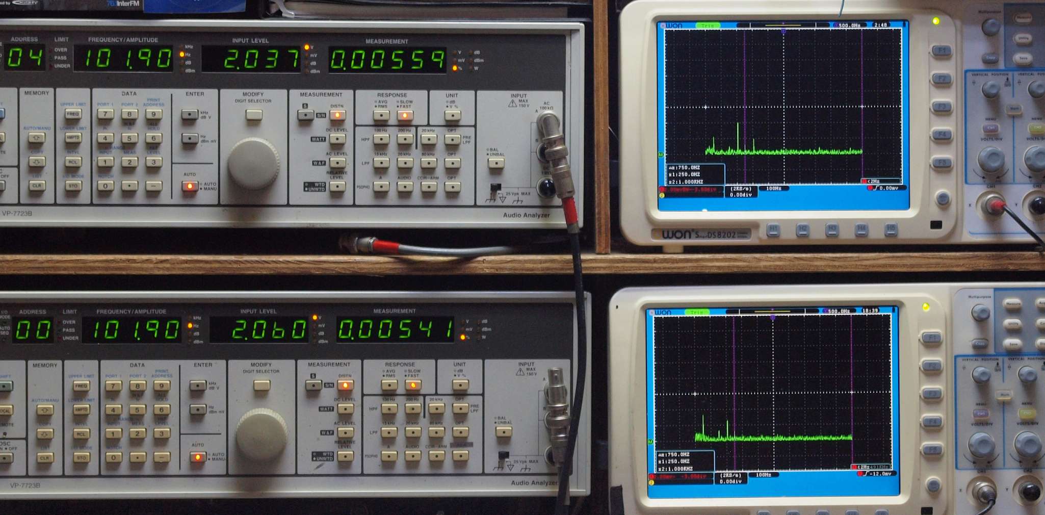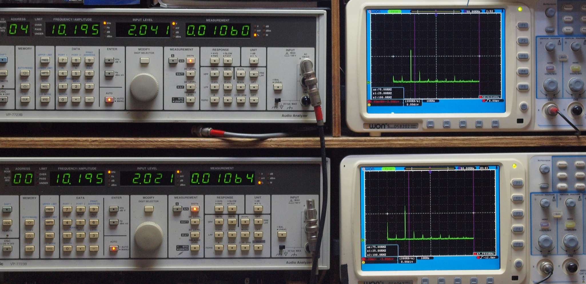| E. 調整・測定。 画像をクリックすると、大きく(横幅2050ドット)表示されます。 E0. 出力・歪み率測定・調整。 「見方」。 上段中 右側SP出力を「Audio Analyzer Panasonic VP−7723B」により測定。 表示LED、 左端=メモリーNo、 中左=周波数測定、 中右=出力電圧測定、 右端=歪み率測定。 上段右端 VP−7723Bの基本波除去出力を「owon SDS8202(200MHZ)」で「FFT分析」表示。 下段中 左側SP出力を「Audio Analyzer Panasonic VP−7723B」により測定。 表示LED、 左端=メモリーNo、 中左=周波数測定、 中右=出力電圧測定、 右端=歪み率測定。 下段右端 VP−7723Bの基本波除去出力を「owon SDS6062(200MHZ)」で「FFT分析」表示。 下段左端 オーディオ発振器 VP−7201A より50Hz〜100kHzの信号を出し(歪み率=約0.003%)、ATT+分配器を通し、AMPに入力。 よって、ダイアル設定出力レベルより低くなります。測定機器の仕様や整備の様子はこちら、「VP−7723B」「VP−7201A」。 FFT画面の見方はこちら。 |