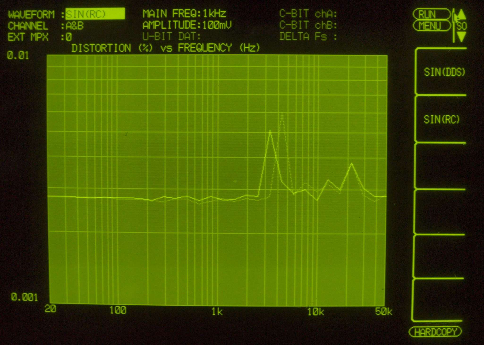 | E44. MC_1kHz入力、R側出力電圧=2V、 0.00517%歪み。 L側出力電圧=2V、 0.00549%歪み。 「FFT分析」のオシロのカーソル周波数、左=2.5kHz、右=10kHz。 |