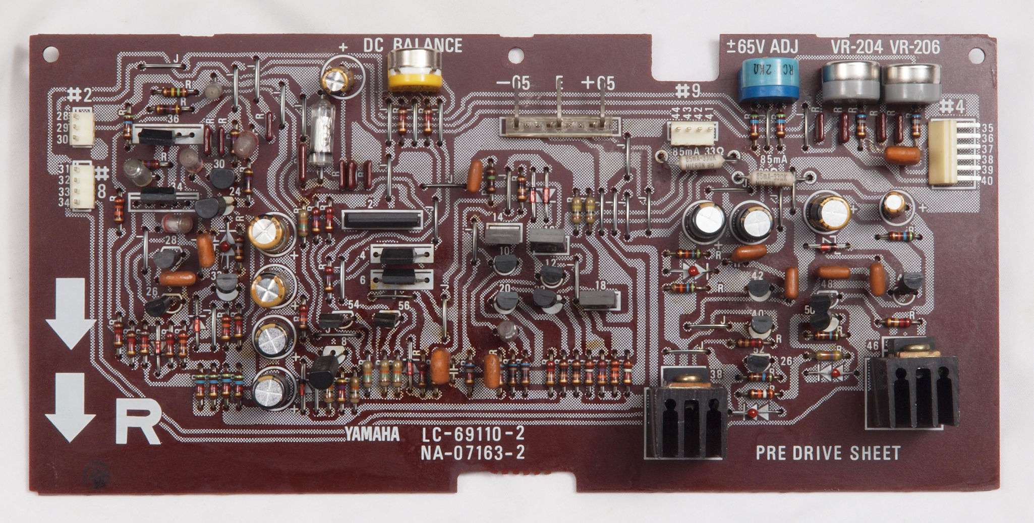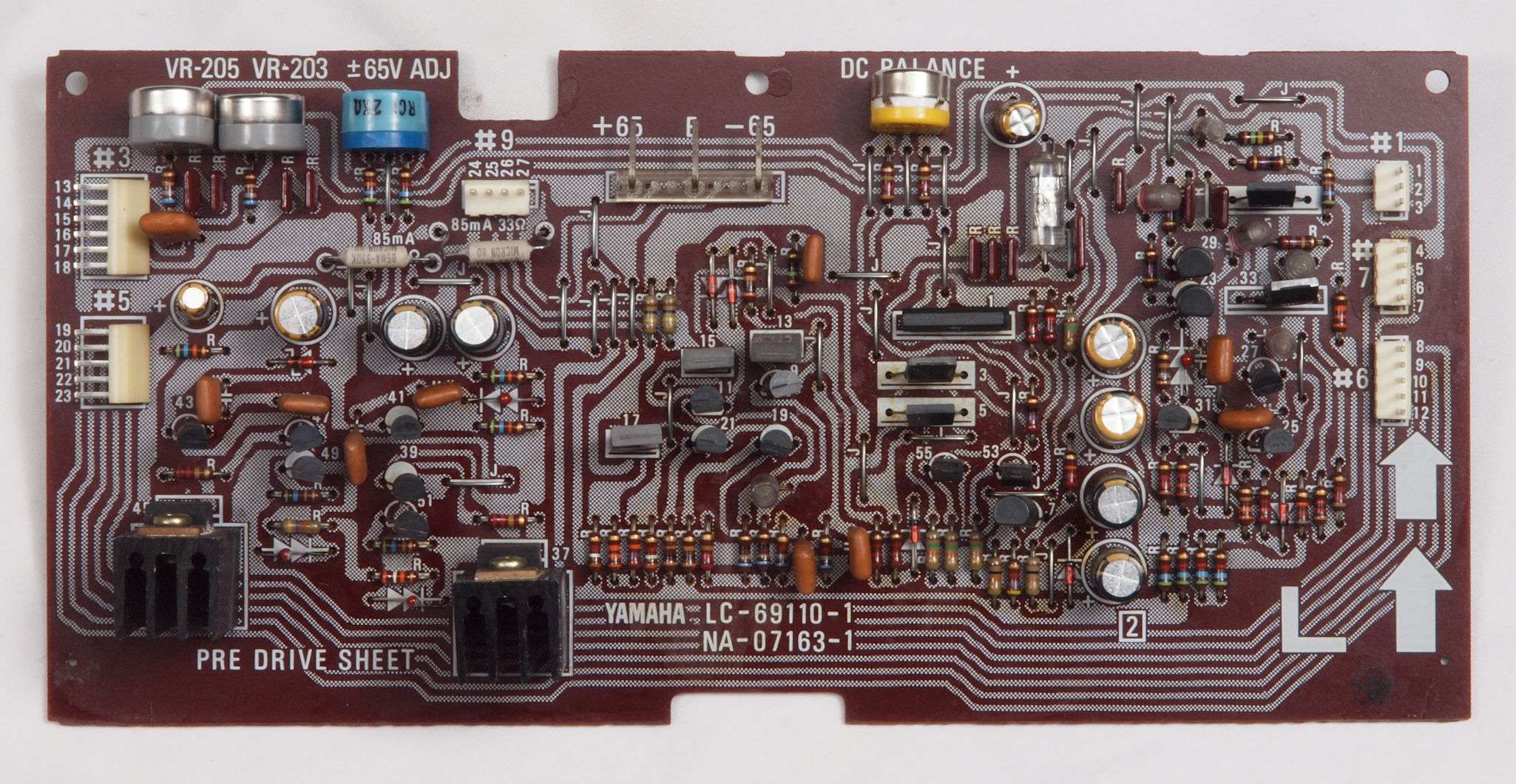 C112. 修理中 R側ドライブ基板。 電解コンデンサーの足(端子)は出来るだけ短くして、基板に固定する。