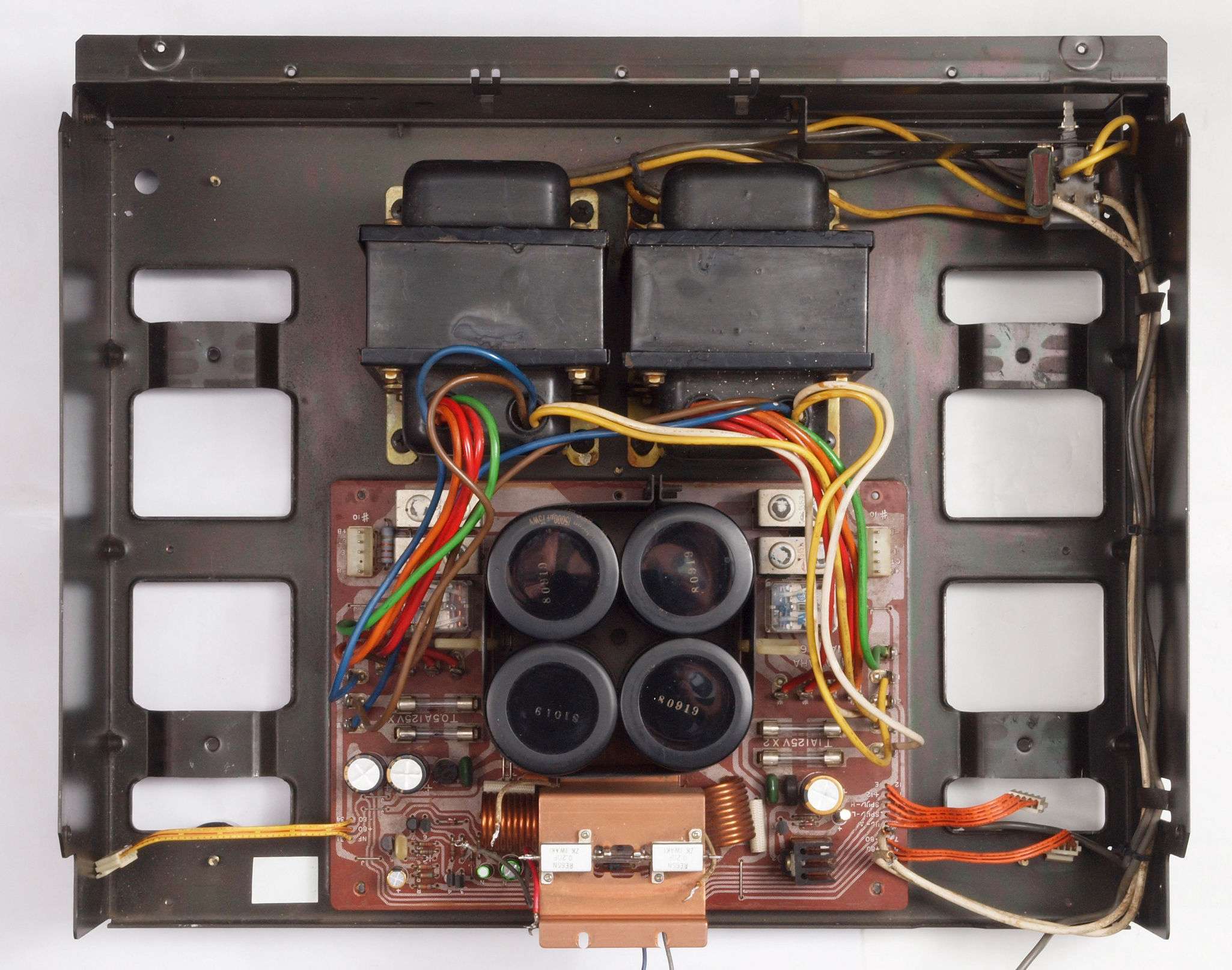 A18. 点検中 上下蓋を取り、上から見る。ブロック電解コンデンサーの頭のビニール膨らみ無。