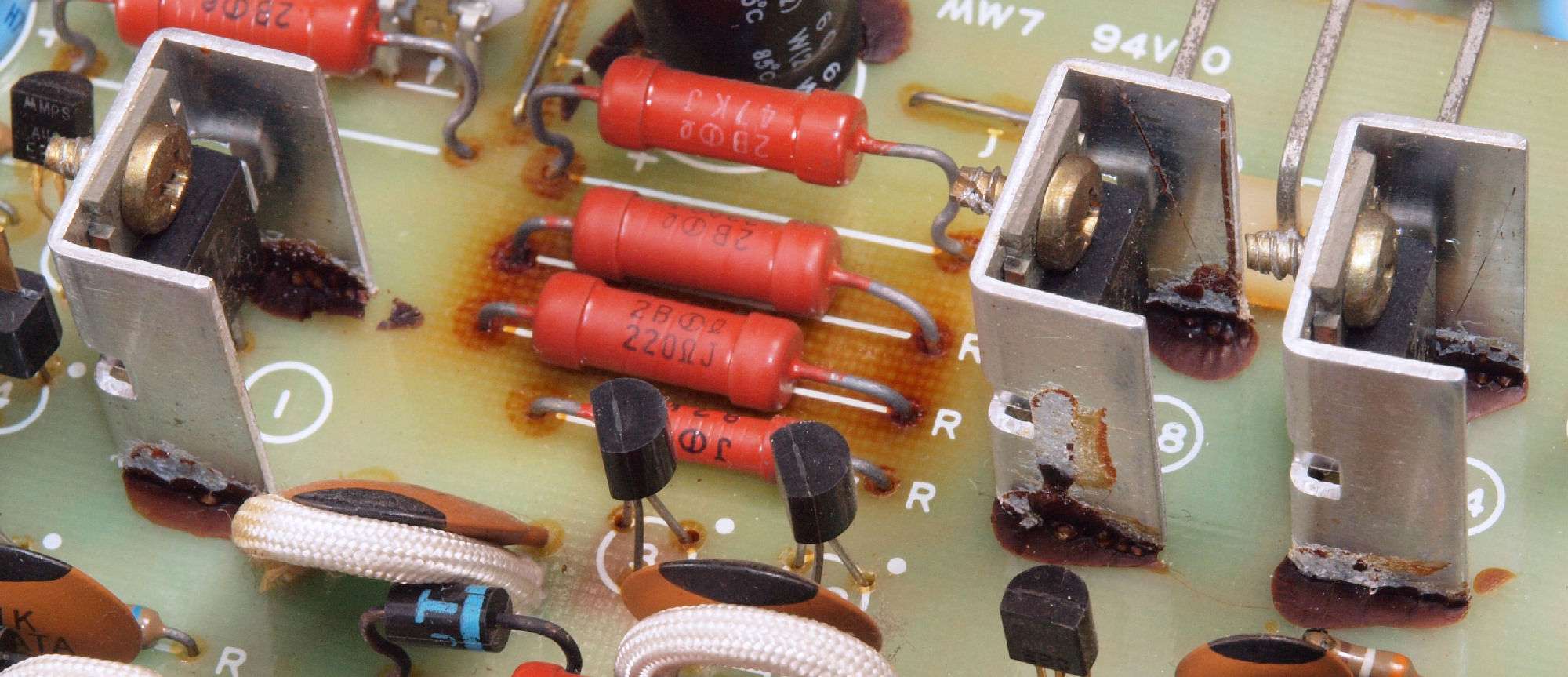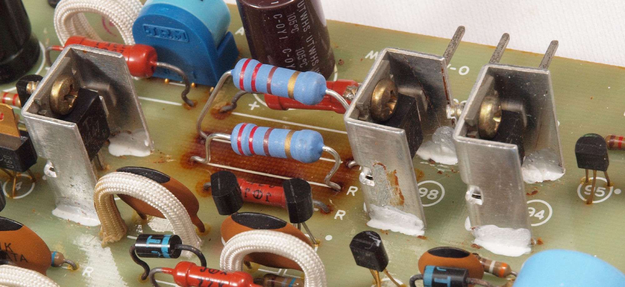 C112. 修理前 R側ドライブ基板、出力FET(Field Effect Transistor)とTR(トランジスター)