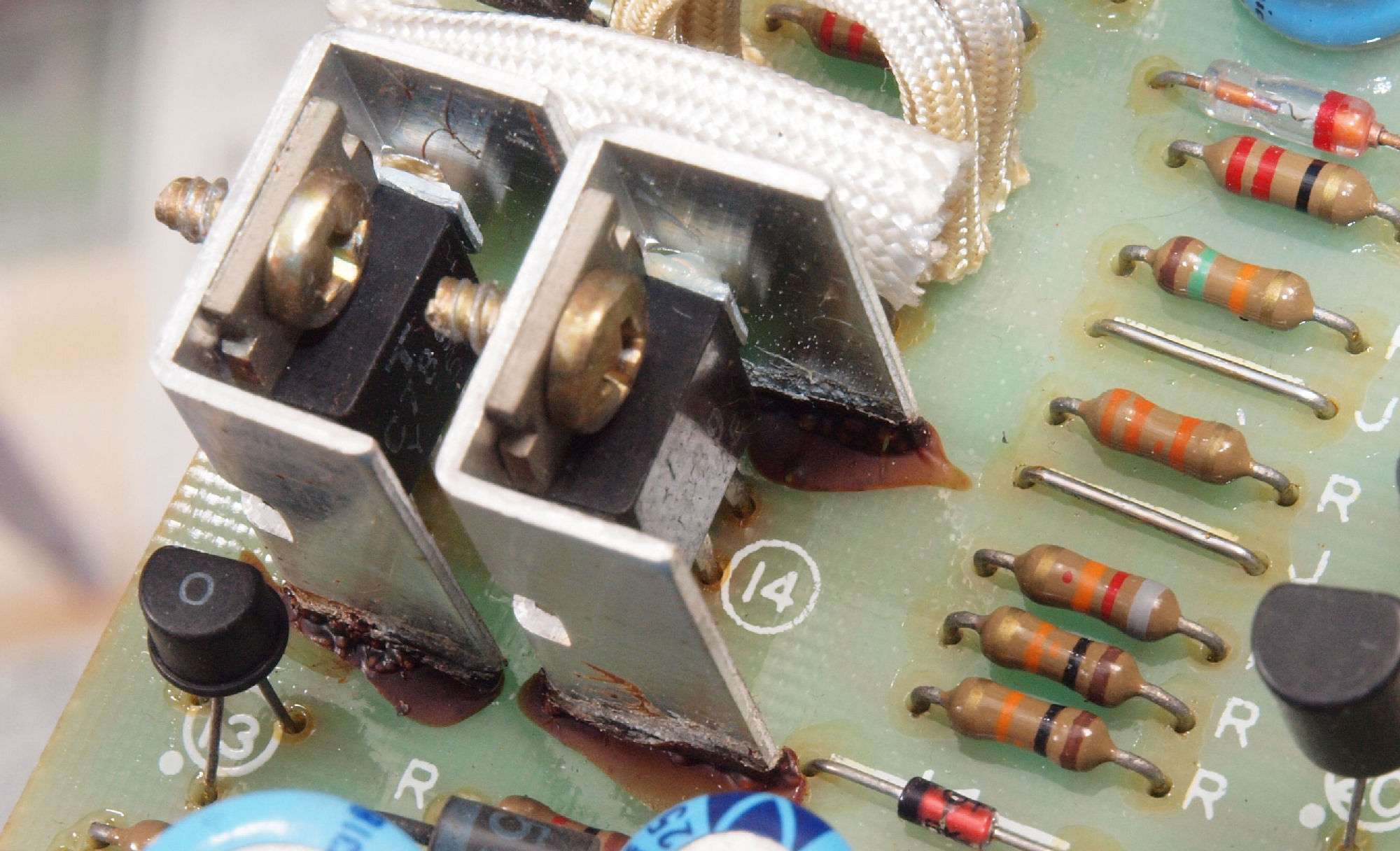 C412. 修理前 電源1基板、TR(トランジスター)の放熱器。