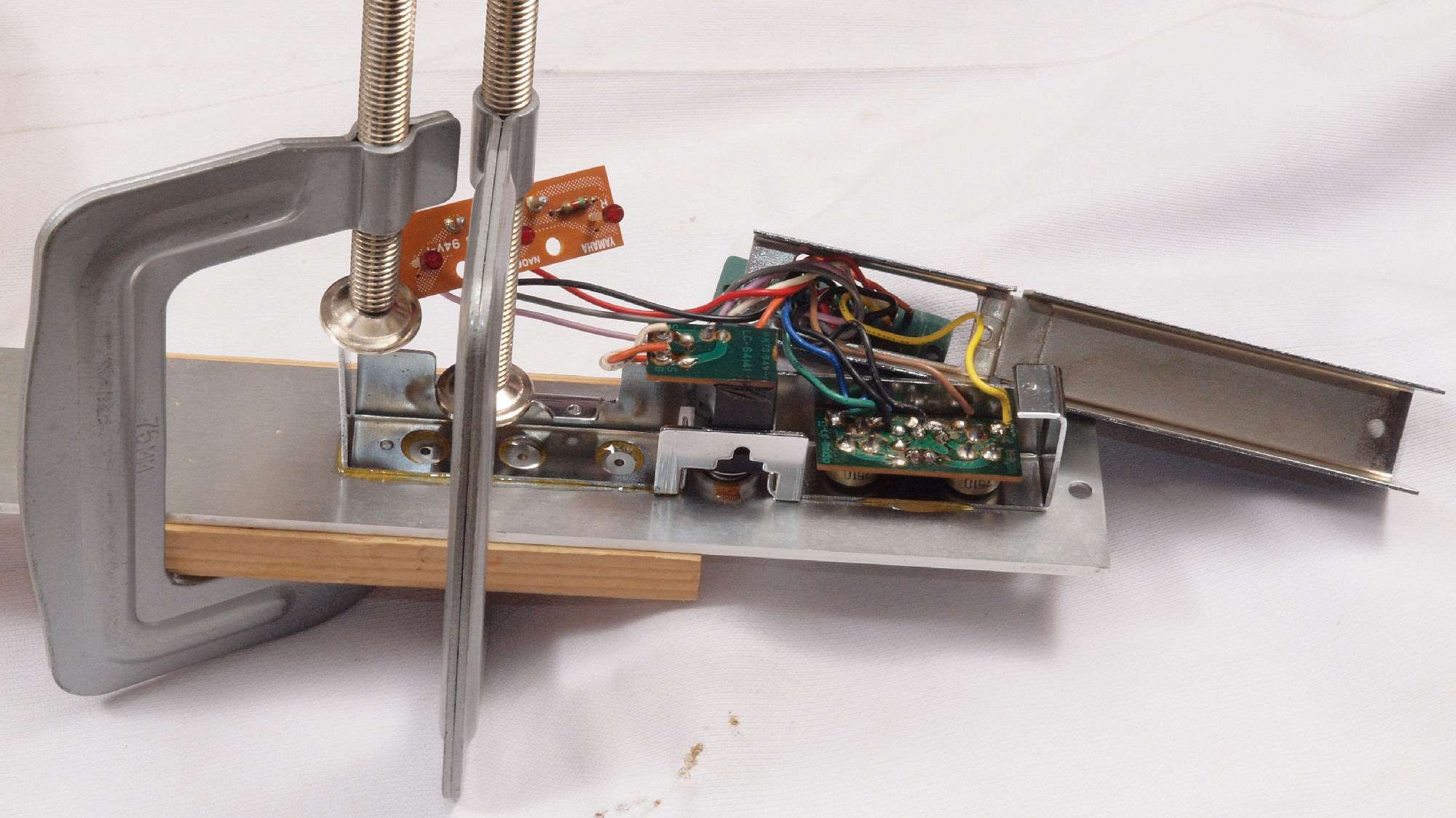 CG. 修理中 落下で、前パネルの端子フレームの接着が取れたので、万力で押さえ接着。