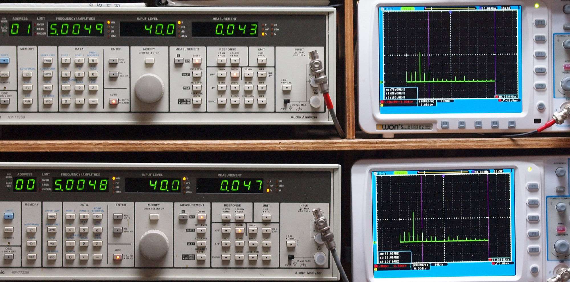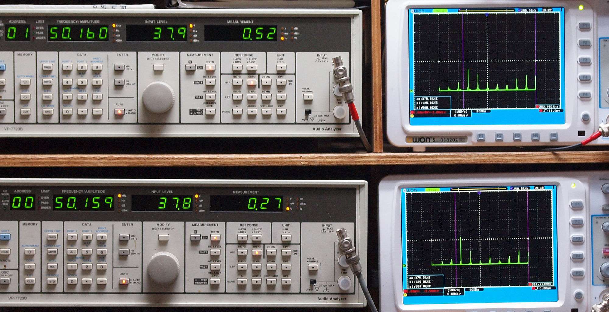 上段右端 VP−7723Bの基本波除去出力を「owon SDS8202(200MHZ)」で「FFT分析」表示。