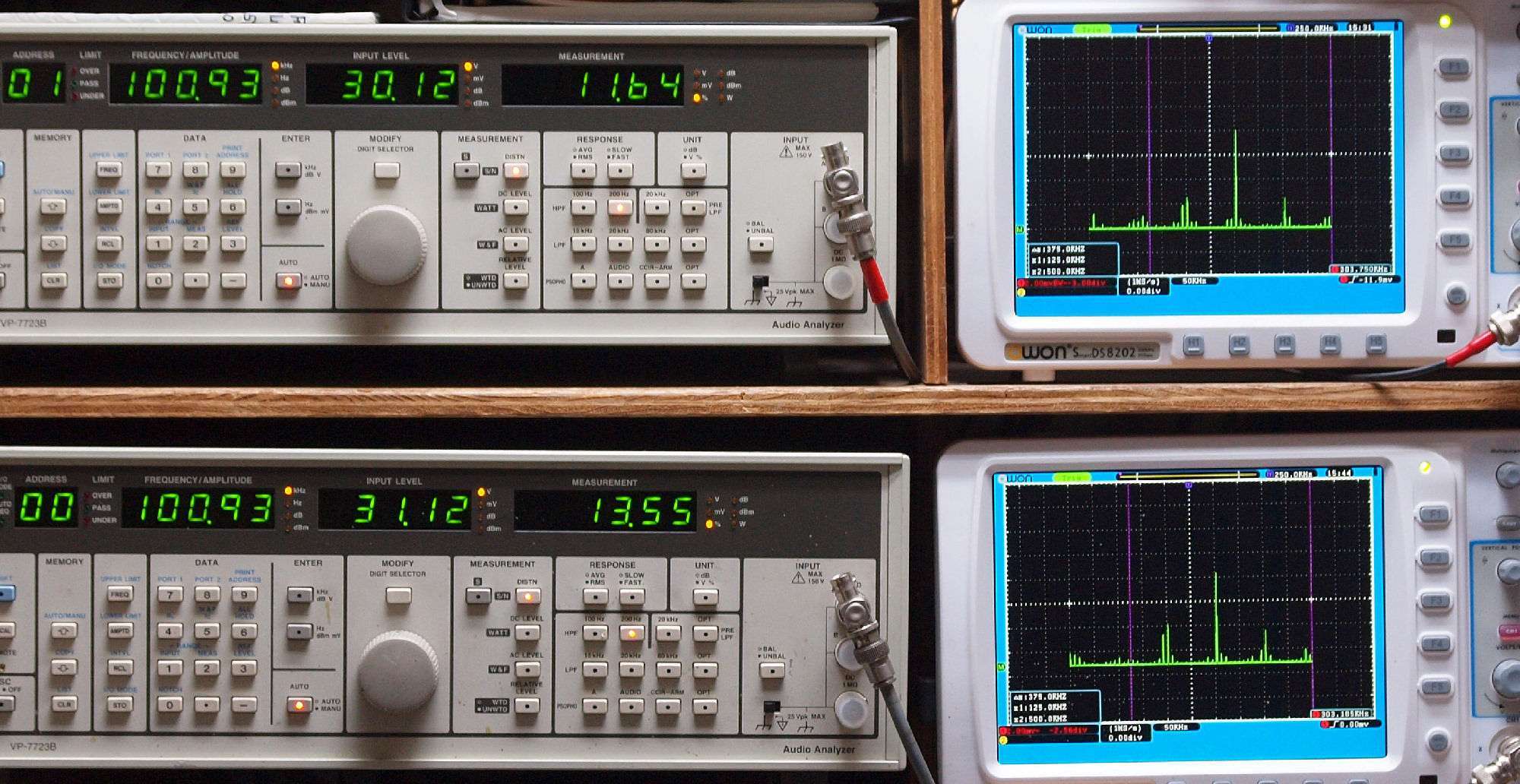 よって、ダイアル設定出力レベルより低くなります。測定機器の仕様や整備の様子はこちら、「VP−7723B」「VP−7201A」。 FFT画面の見方はこちら。