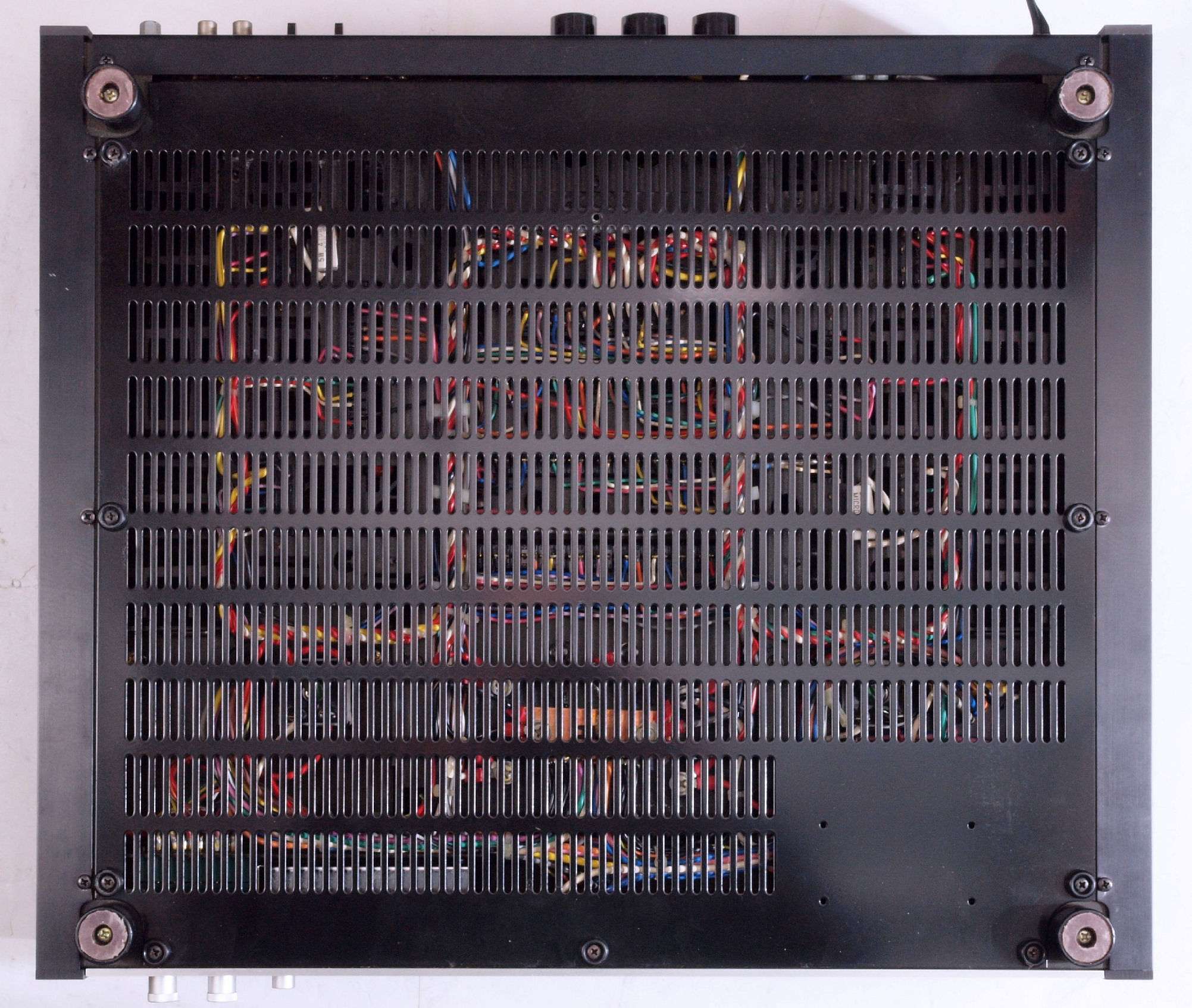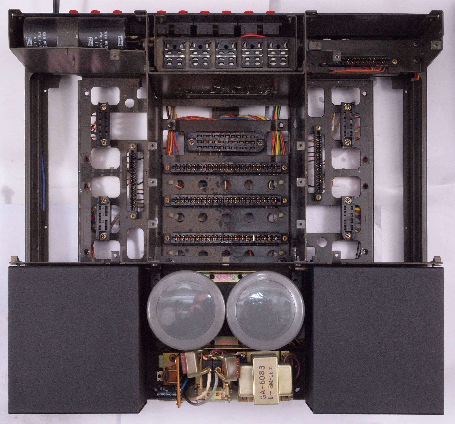 C1. 修理中 基板を外したシャーシ、右半分は清掃済み。