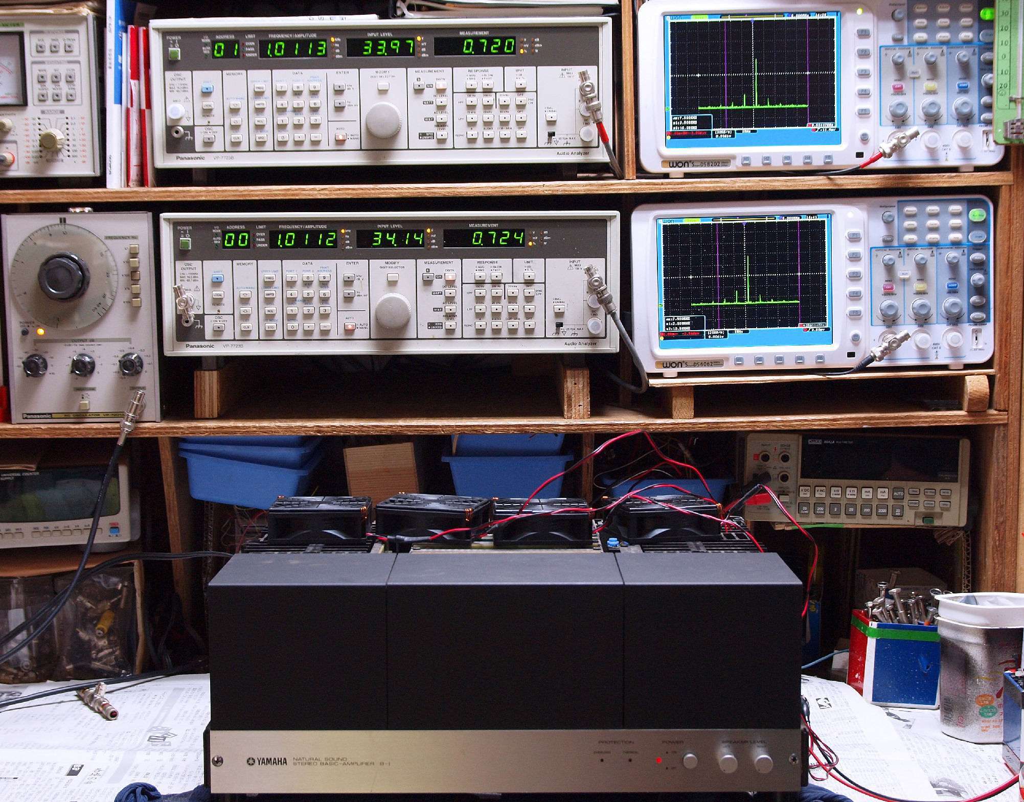 下段左端 オーディオ発振器 VP−7201A より50Hz〜100kHzの信号を出し(歪み率=約0.003%)、ATT+分配器を通し、AMPに入力。