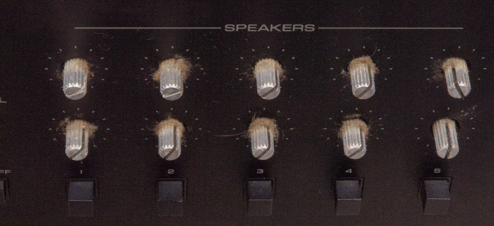 スピーカー切換部 5組のスピーカー切換SWと左右独立レベルコントロールボリューム