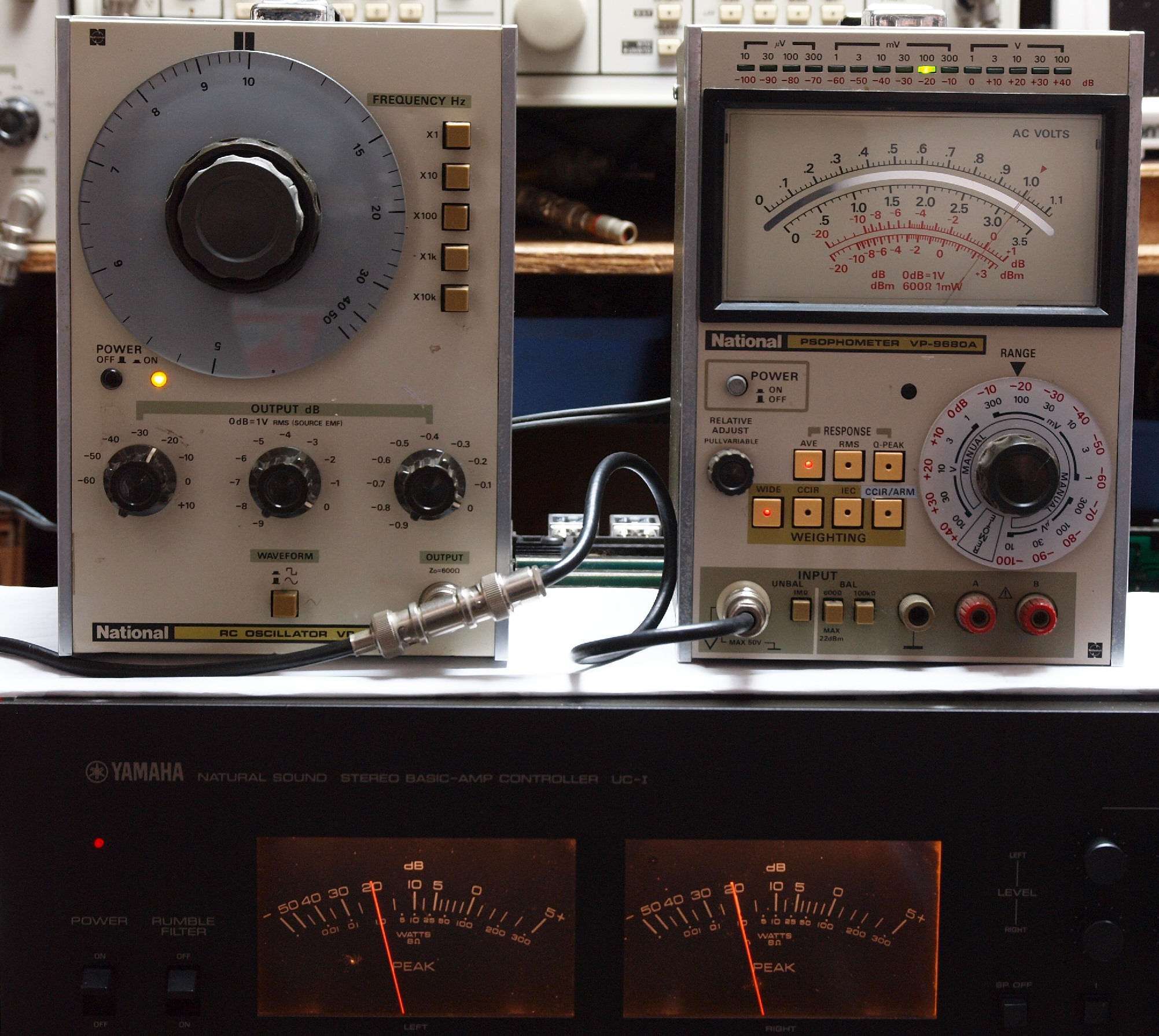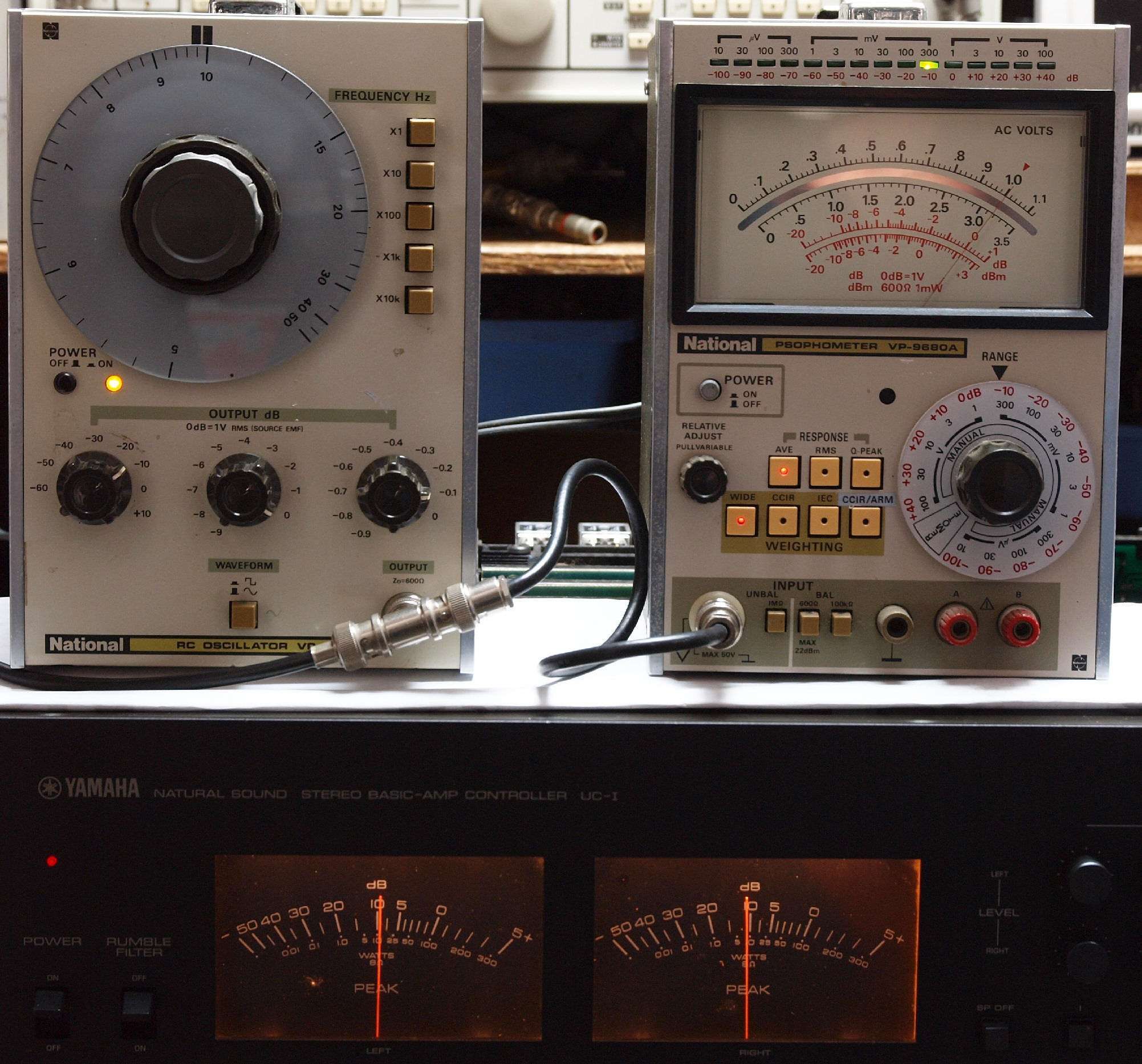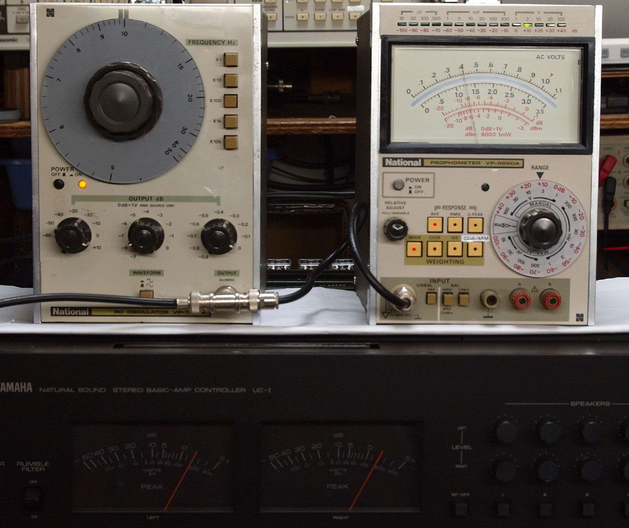 E1. VUレベル調整・設定、+2dB。 上左=dB測定器、右=1kHz発振器。