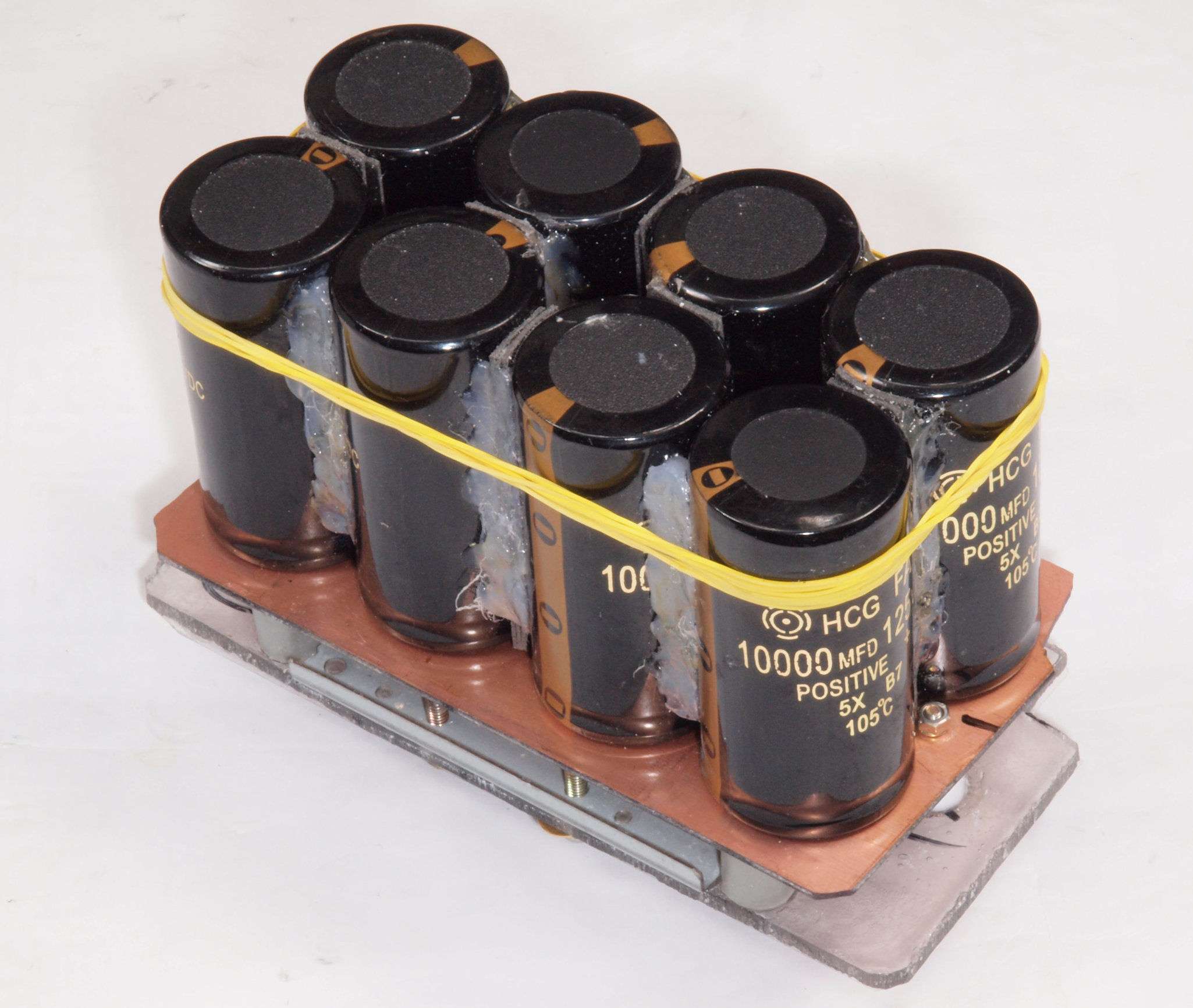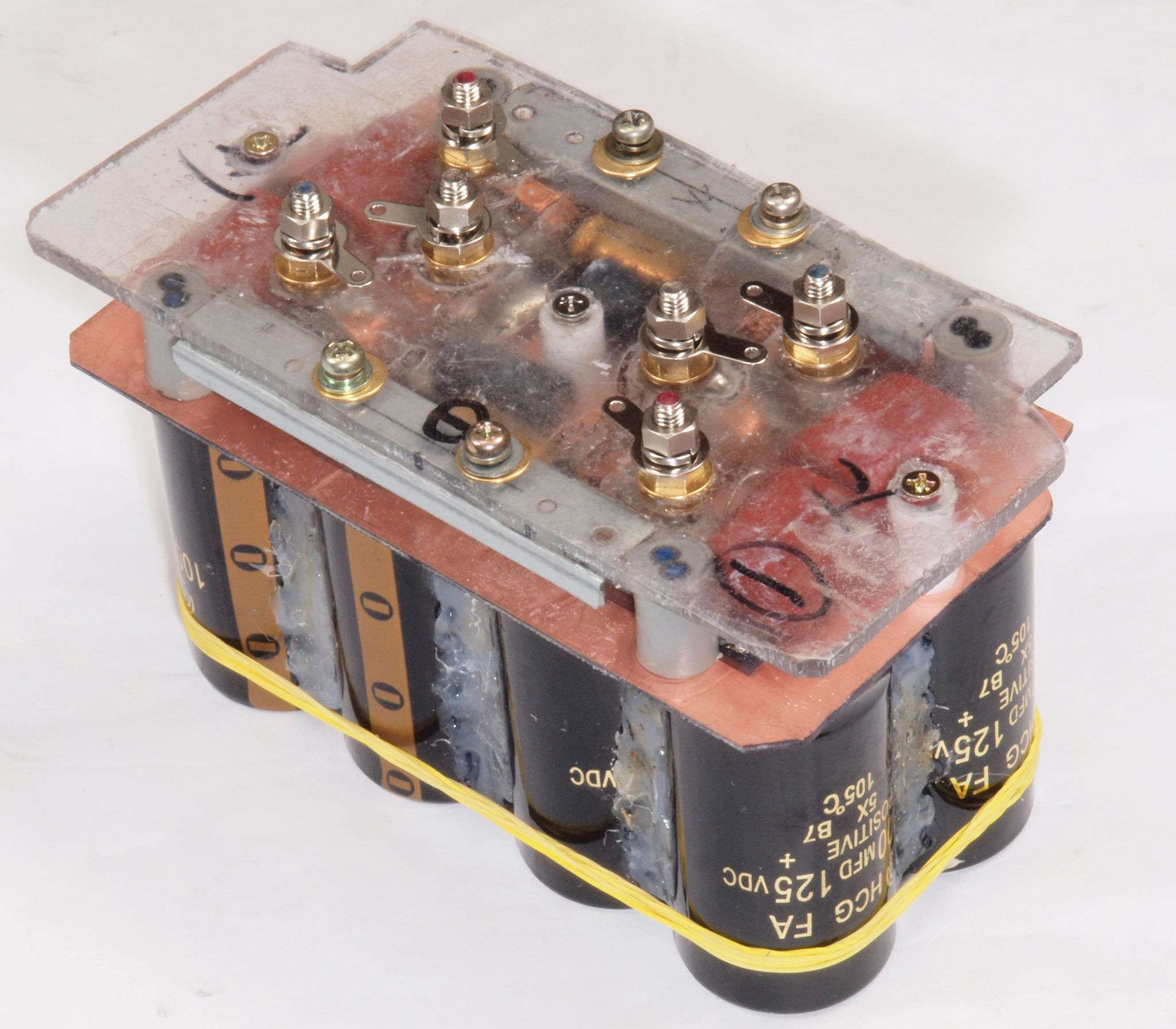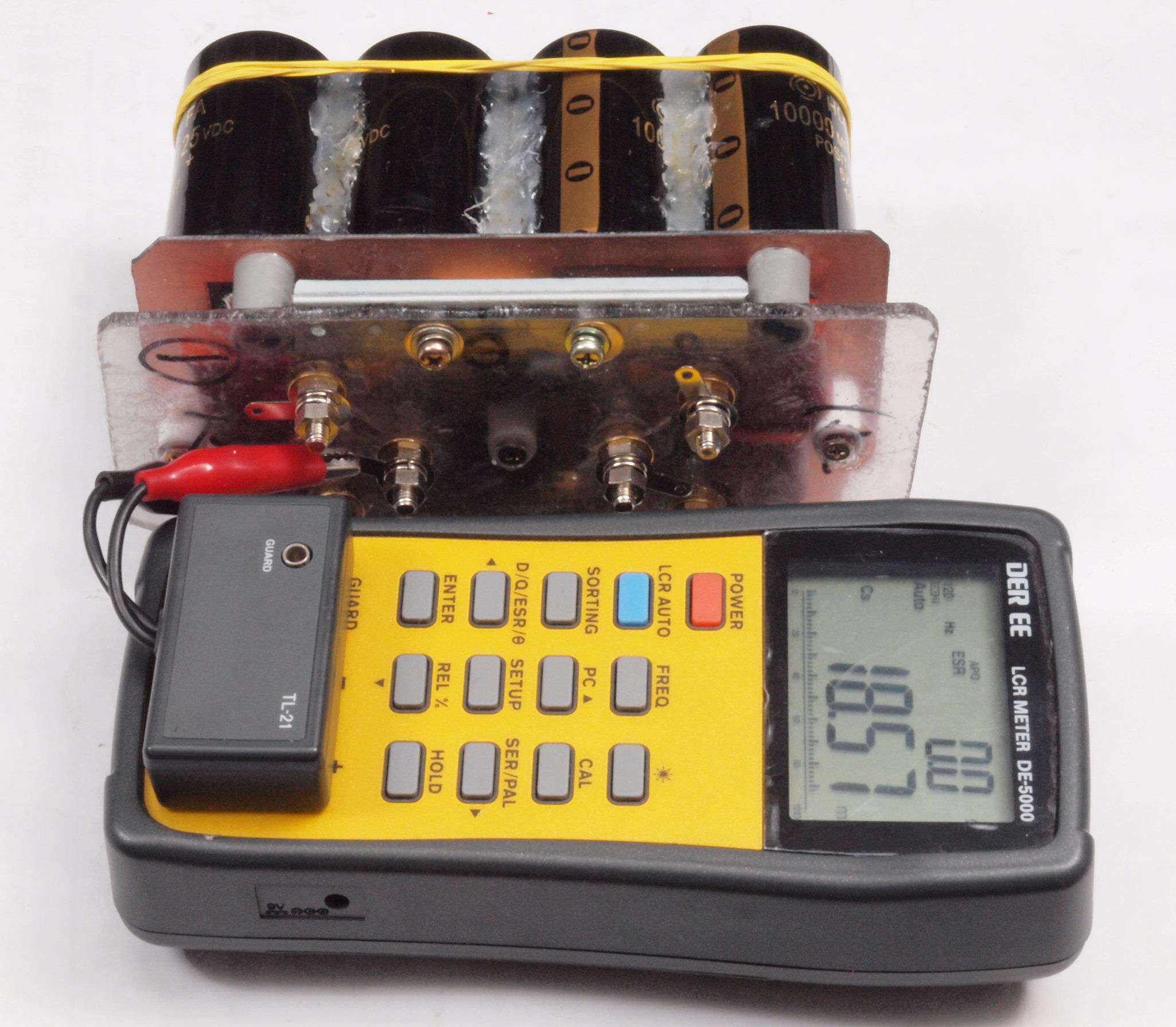 | A57. 黄色ゴムベルト・ブロック電解コンデンサー容量測定、 右+側用=17,260μF。 測定周波数=120Hz、ESRは測定限界以下、測定誤差=1.2% ESRに付いてはmuRata、Nichicon、ルビコン、Panasonic参照。 |