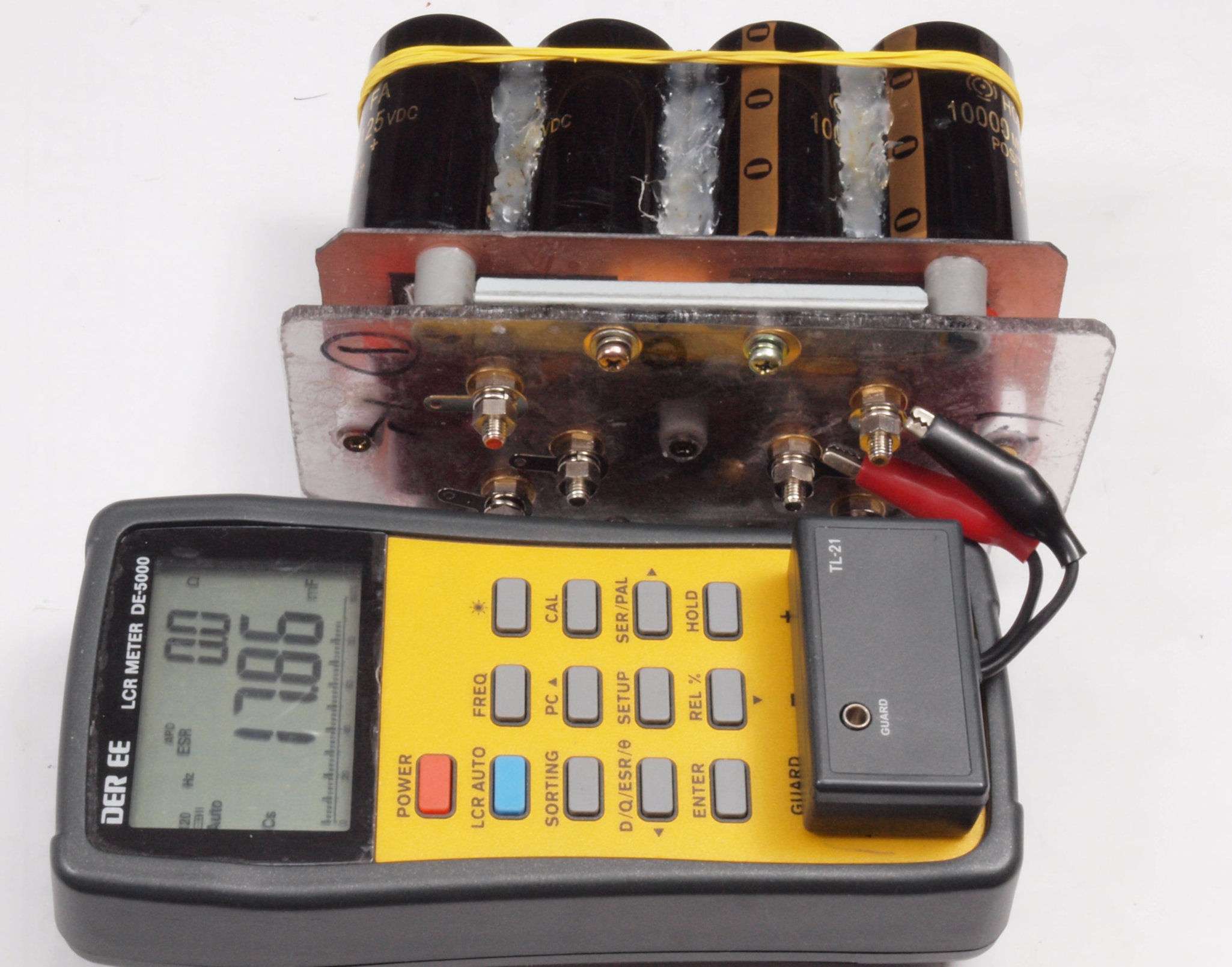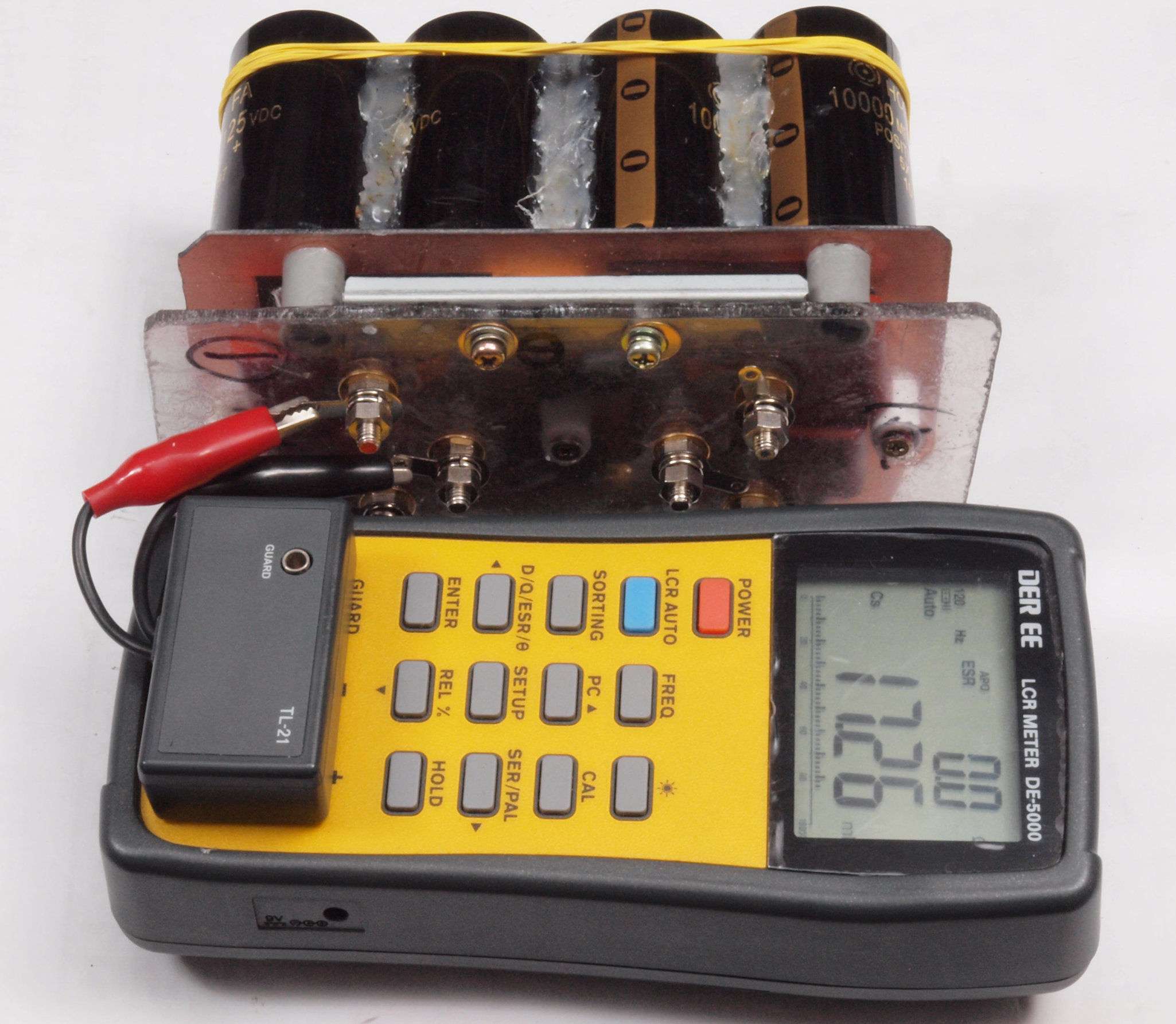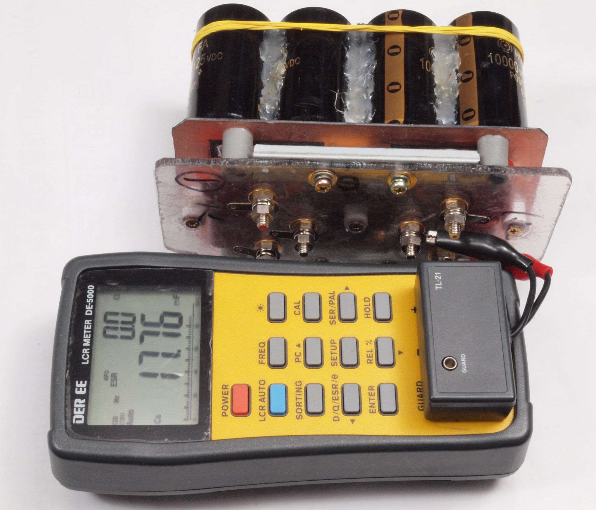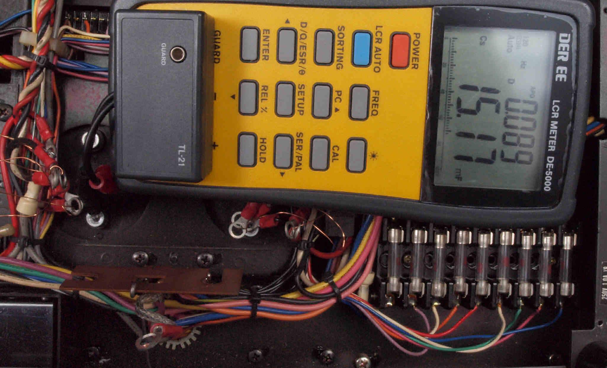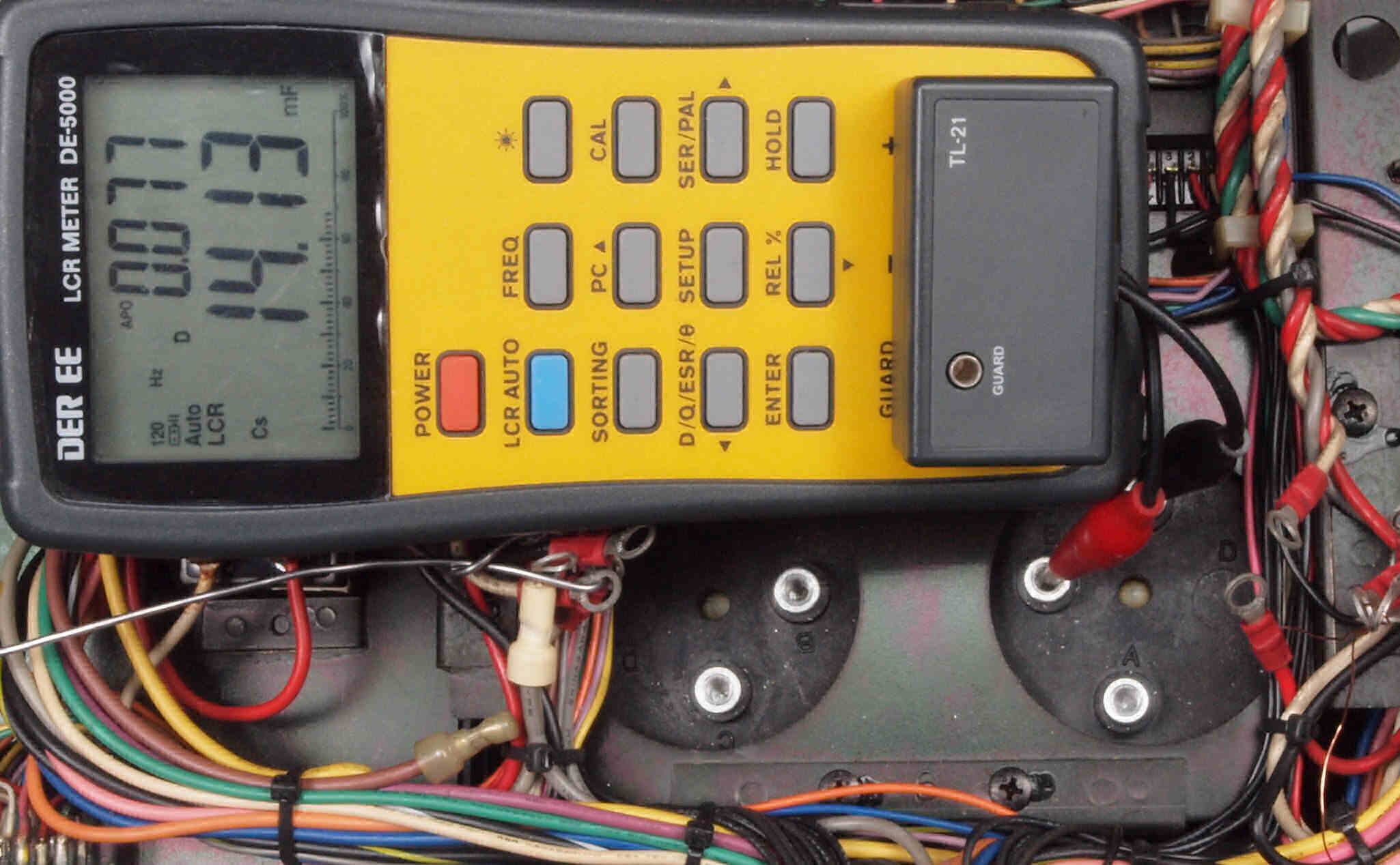| A59. 黄色ゴムベルト・ブロック電解コンデンサー容量測定、 左+側用=17,760μF。 測定周波数=120Hz、ESRは測定限界以下、測定誤差=1.2% |