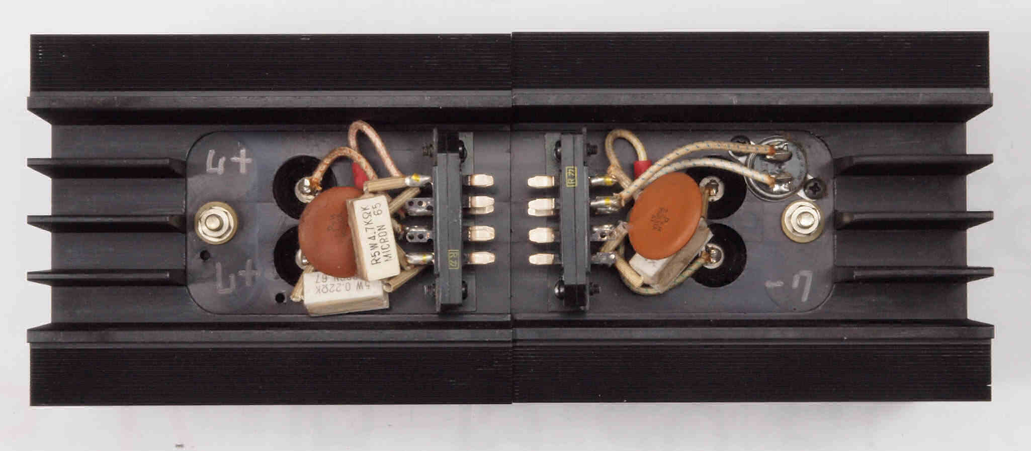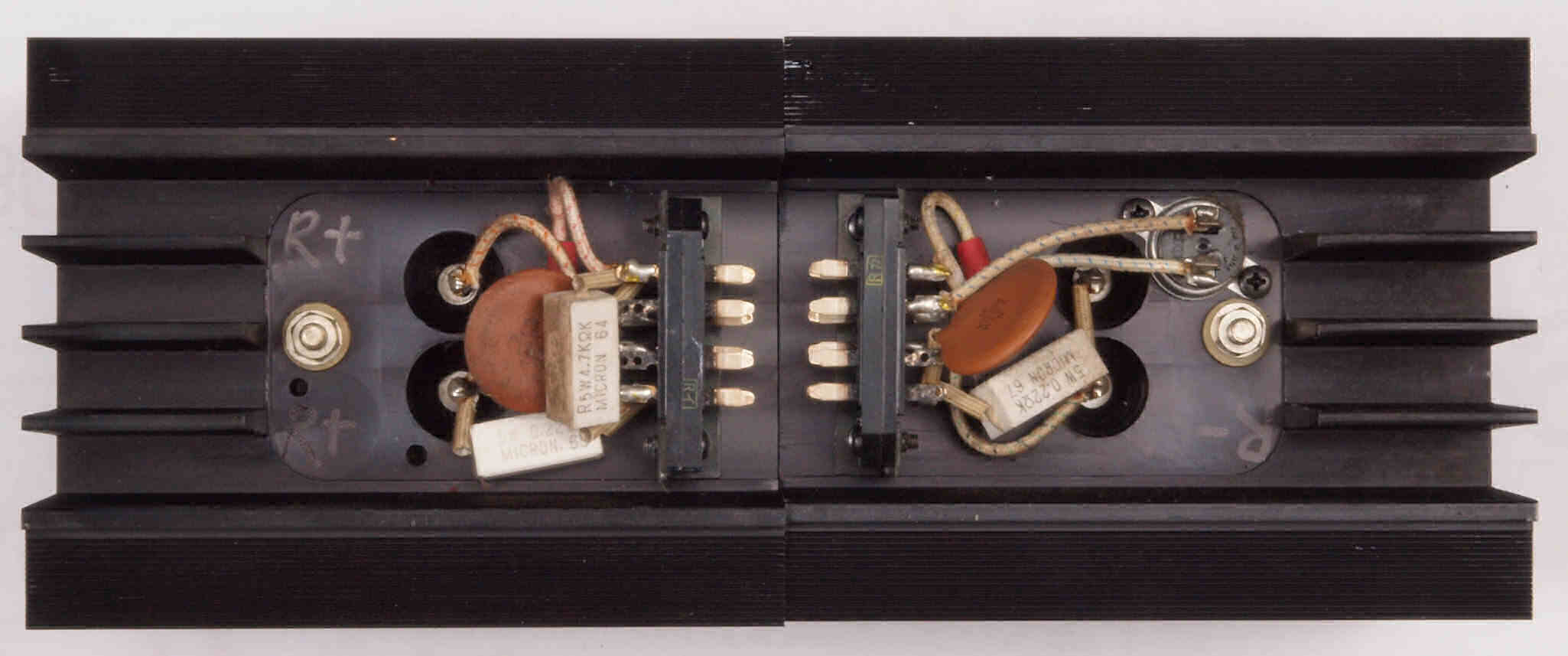 | C95. 修理後 左側終段出力SIT静電誘導型トランジスター2SK77裏。 左=−側、右=+側、サーモスタット増設。 | ||||||||||||||||||||||||||||||||||||||||||||||||||||