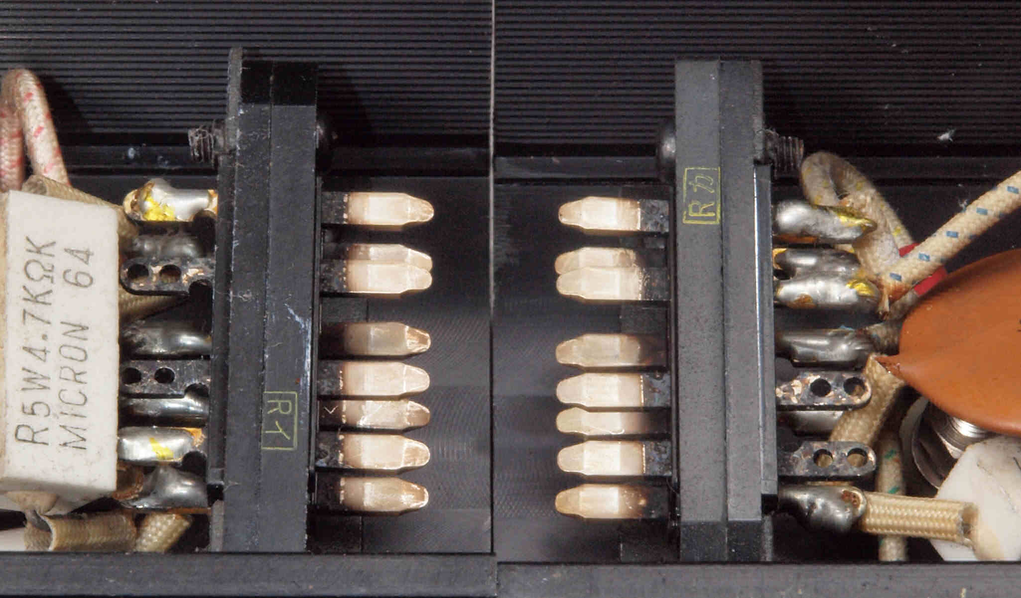 | C97. 修理(清掃)後 右側終段出力SIT静電誘導型トランジスター2SK77トランジスター足。 左=側+、右=−側。 | ||||||||||||||||||||||||||||||||||||||||||||||||||||