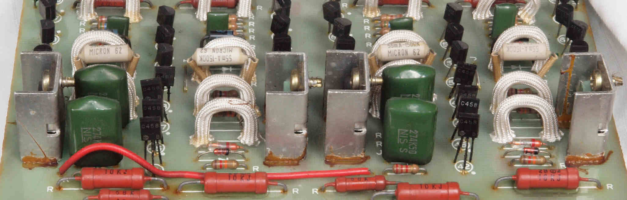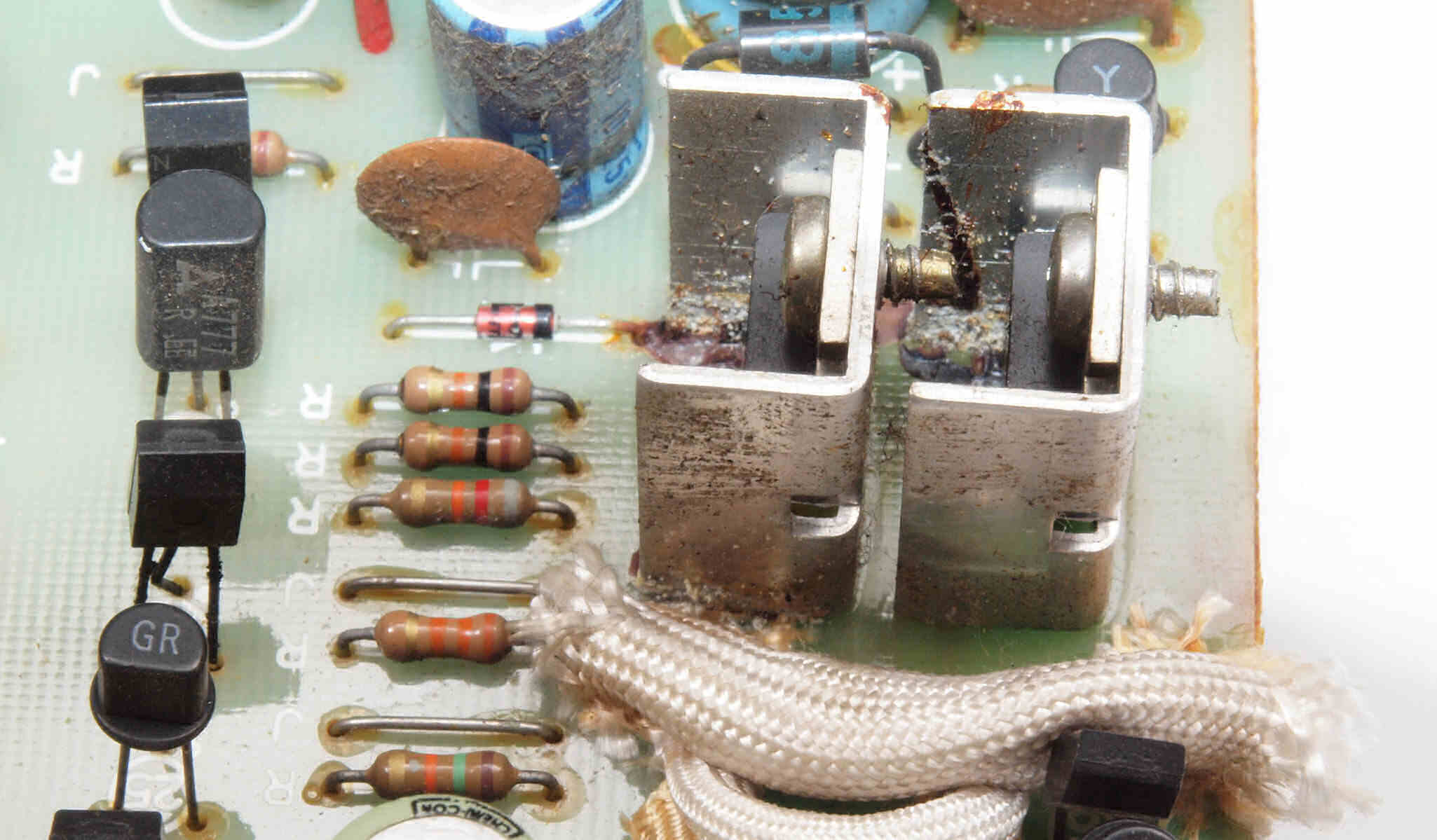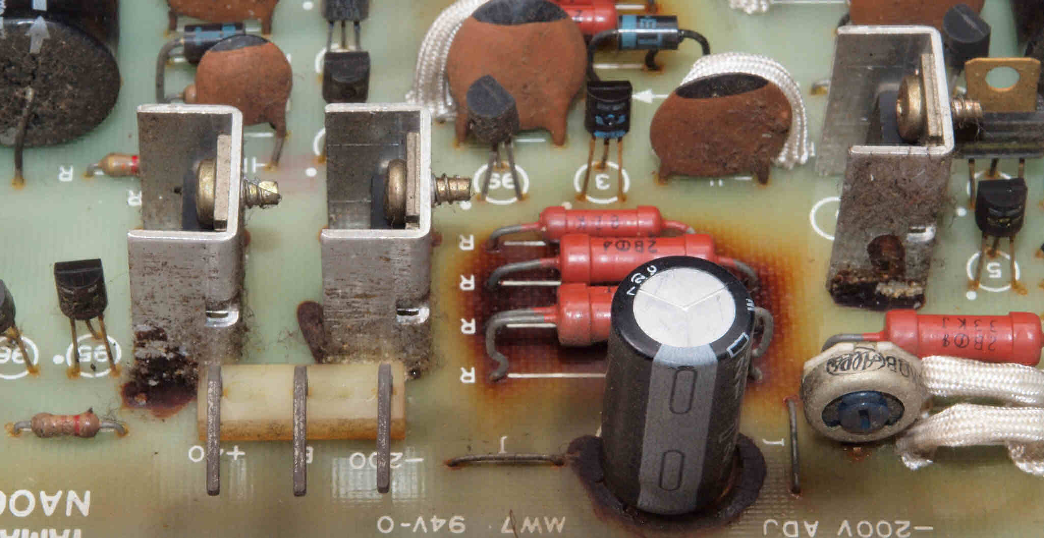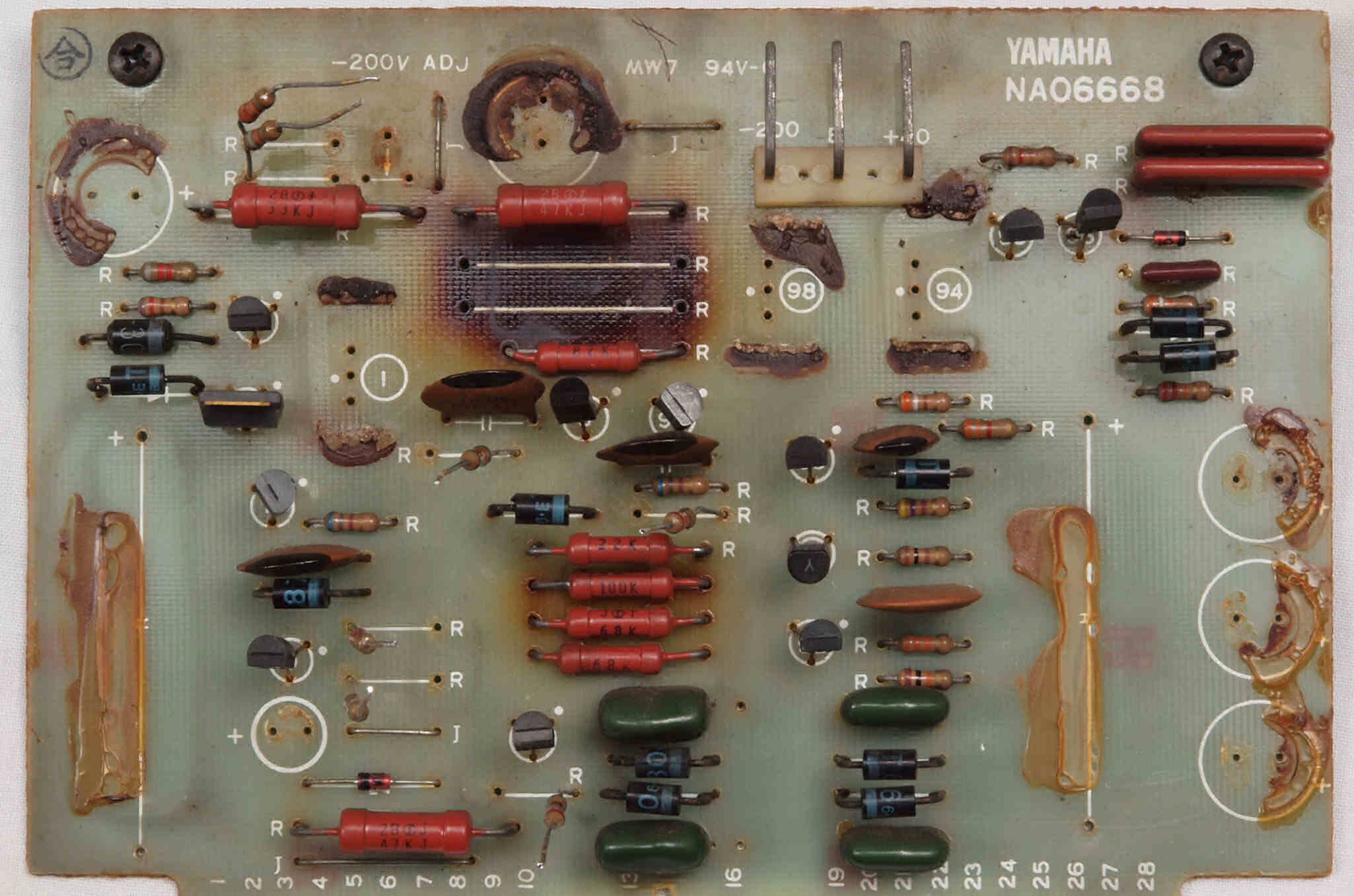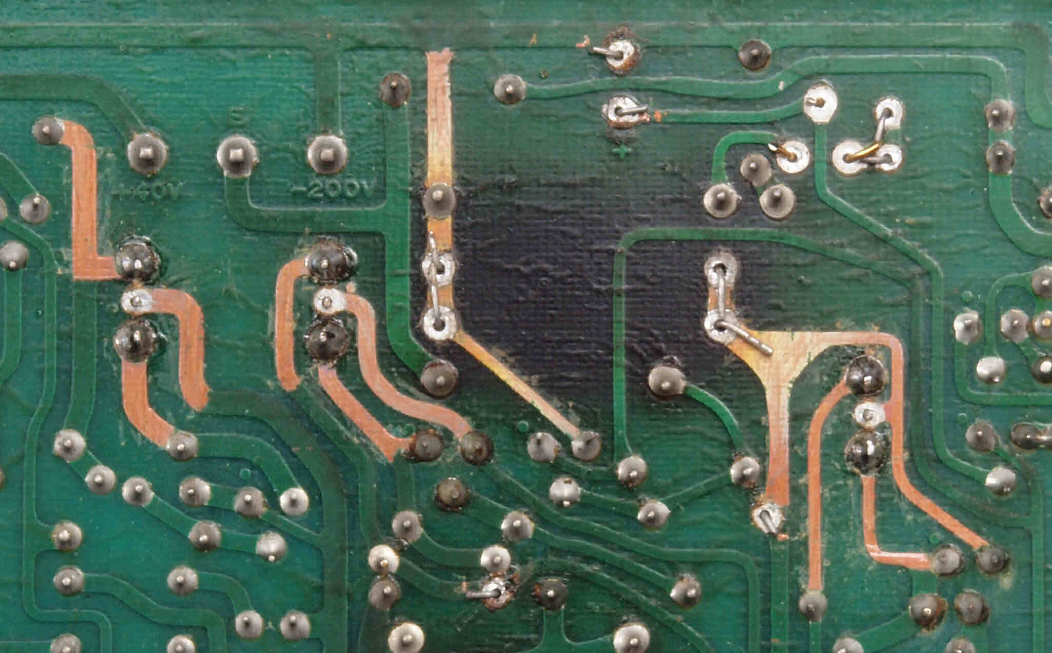 | C412. 修理中 電源1基板。電解コンデンサー固定用の接着材、当時は溶媒にトルエンが使用されており、銅を腐食する。 焼損保護を被した抵抗を外して点検。 | ||||||||||||||||||||||||||||||||||||||||||||||||||||