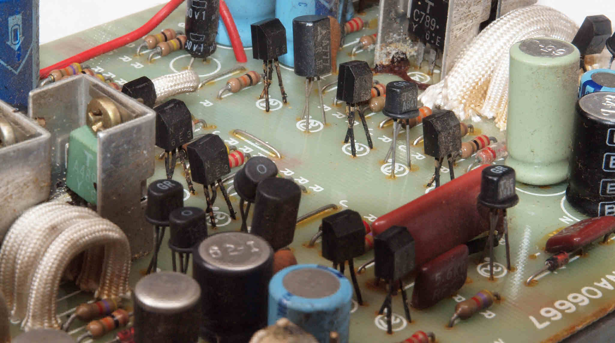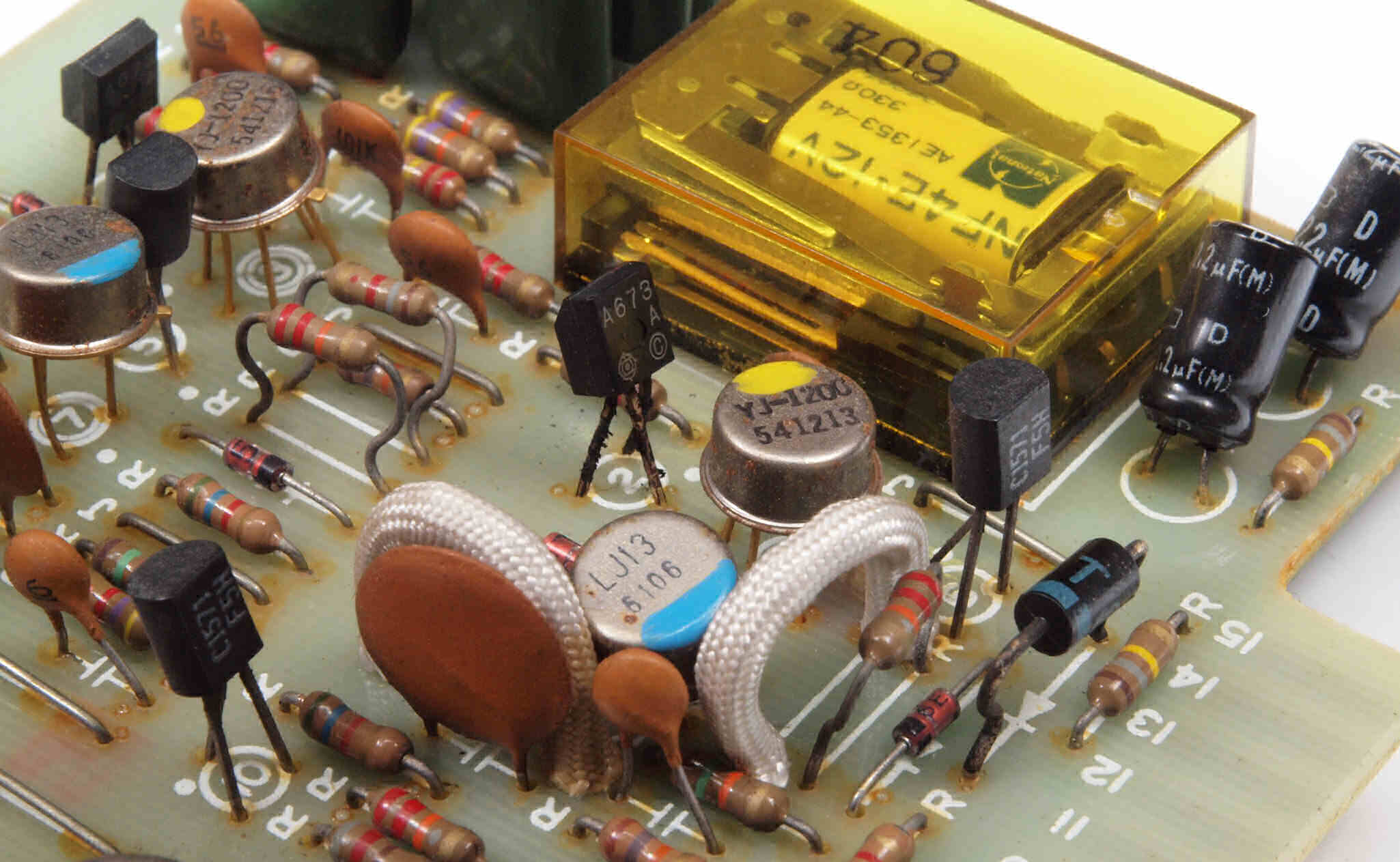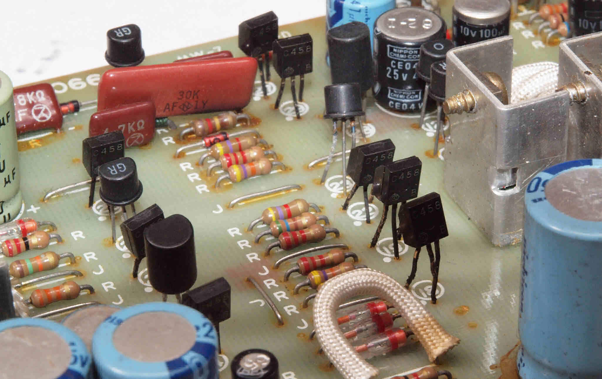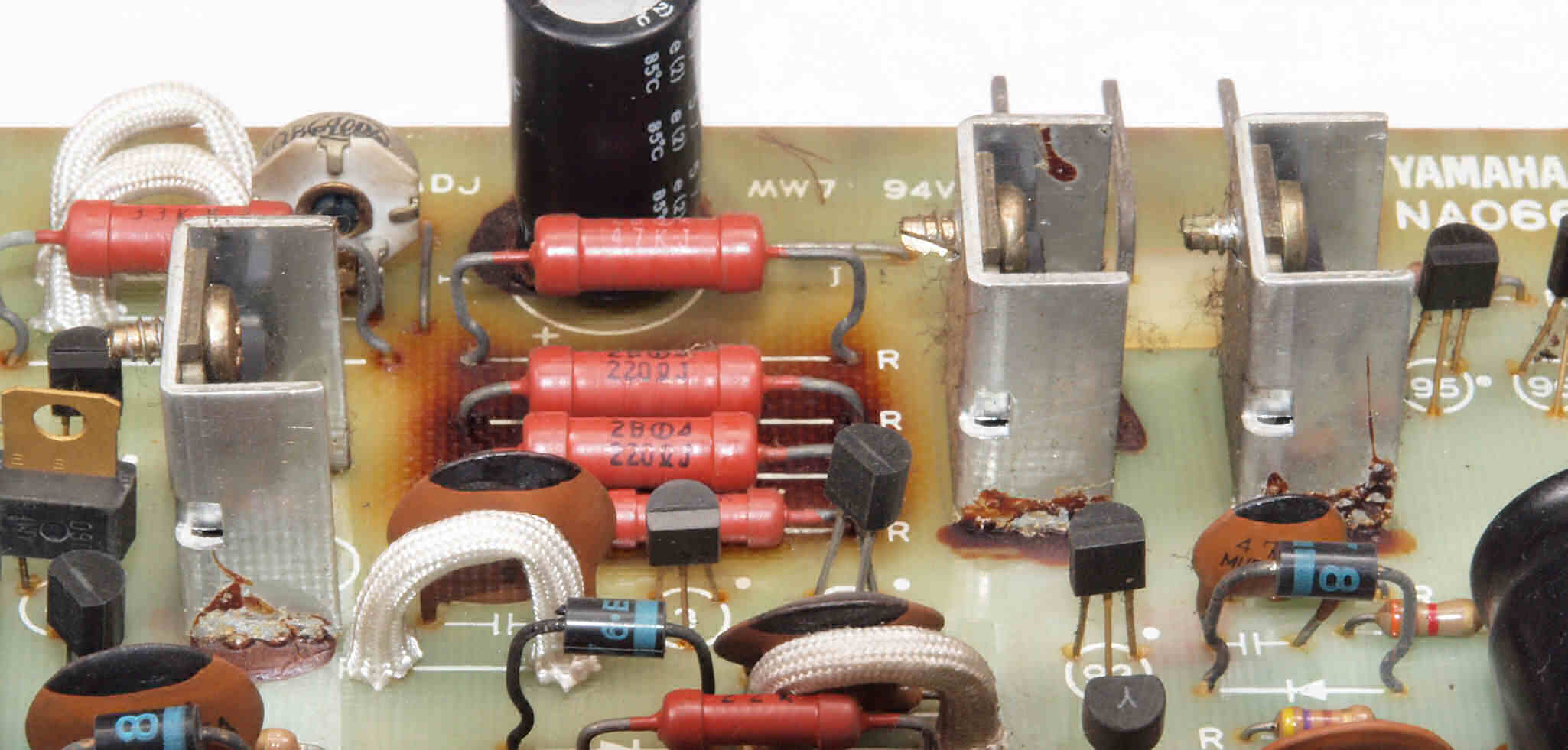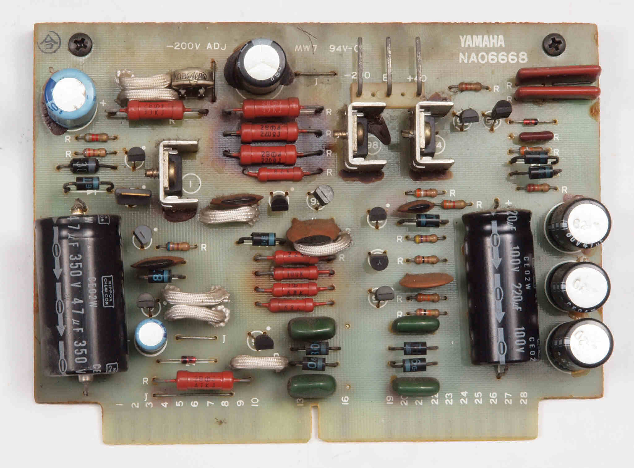 | C412. 修理中 電源1基板。電解コンデンサー固定用の接着材、当時は溶媒にトルエンが使用されており、銅を腐食する。 焼損保護を被した抵抗を外して点検。 | ||||||||||||||||||||||||||||||||||||||||||||||||||||